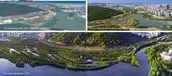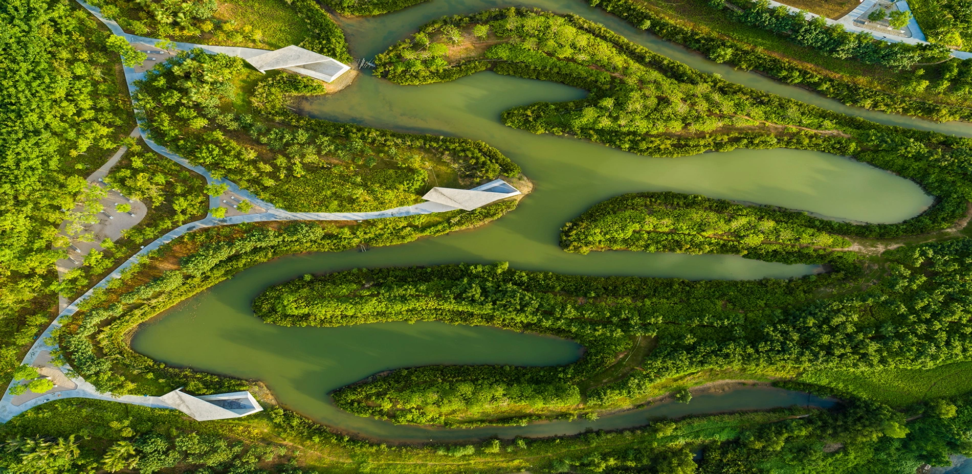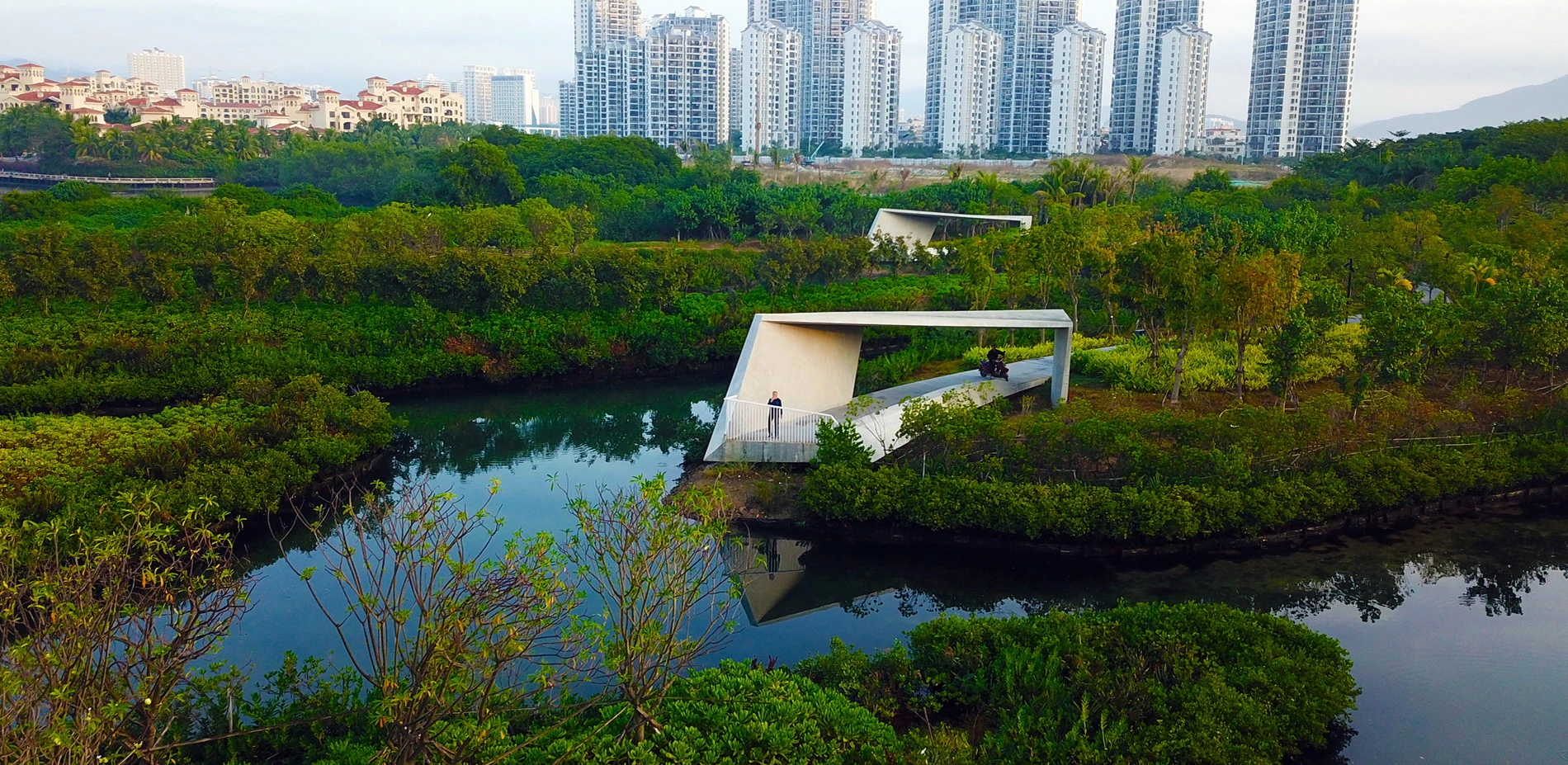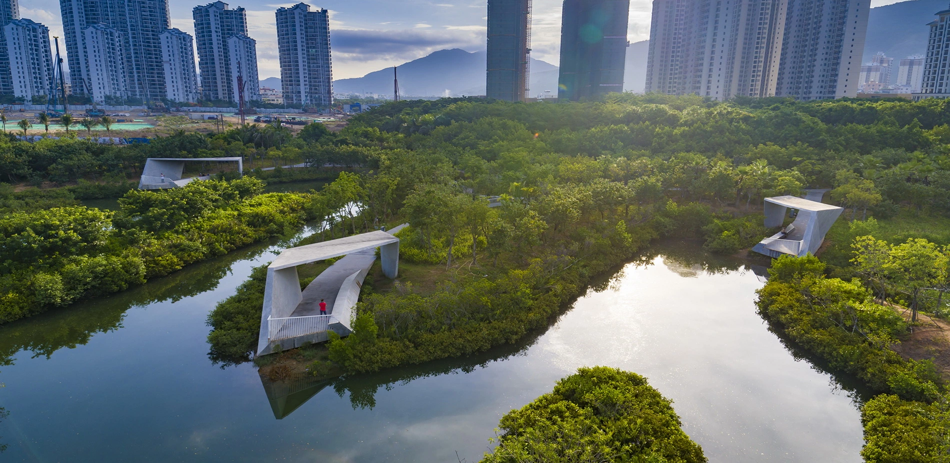 The waterways on China’s Hainan Island have proven to be vulnerable to flooding, but a new landscape within the Sanya River restores previously decimated mangroves that alleviate some of that risk while serving as a lush pedestrian recreation zone within high-rise city. Developers had left behind concrete retaining walls and polluted waterways, but now a thriving ecotone welcomes ocean tides with a porous edge condition that supports new mangrove growth. Terraced landscapes and elevated pathways bring visitors from the city down to water level, and storm-resistant concrete pavilions offer protection from overhead sun and tropical rain. The mangrove rehabilitation serves as a case study of strategies to return parts of cities to nature.