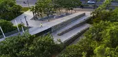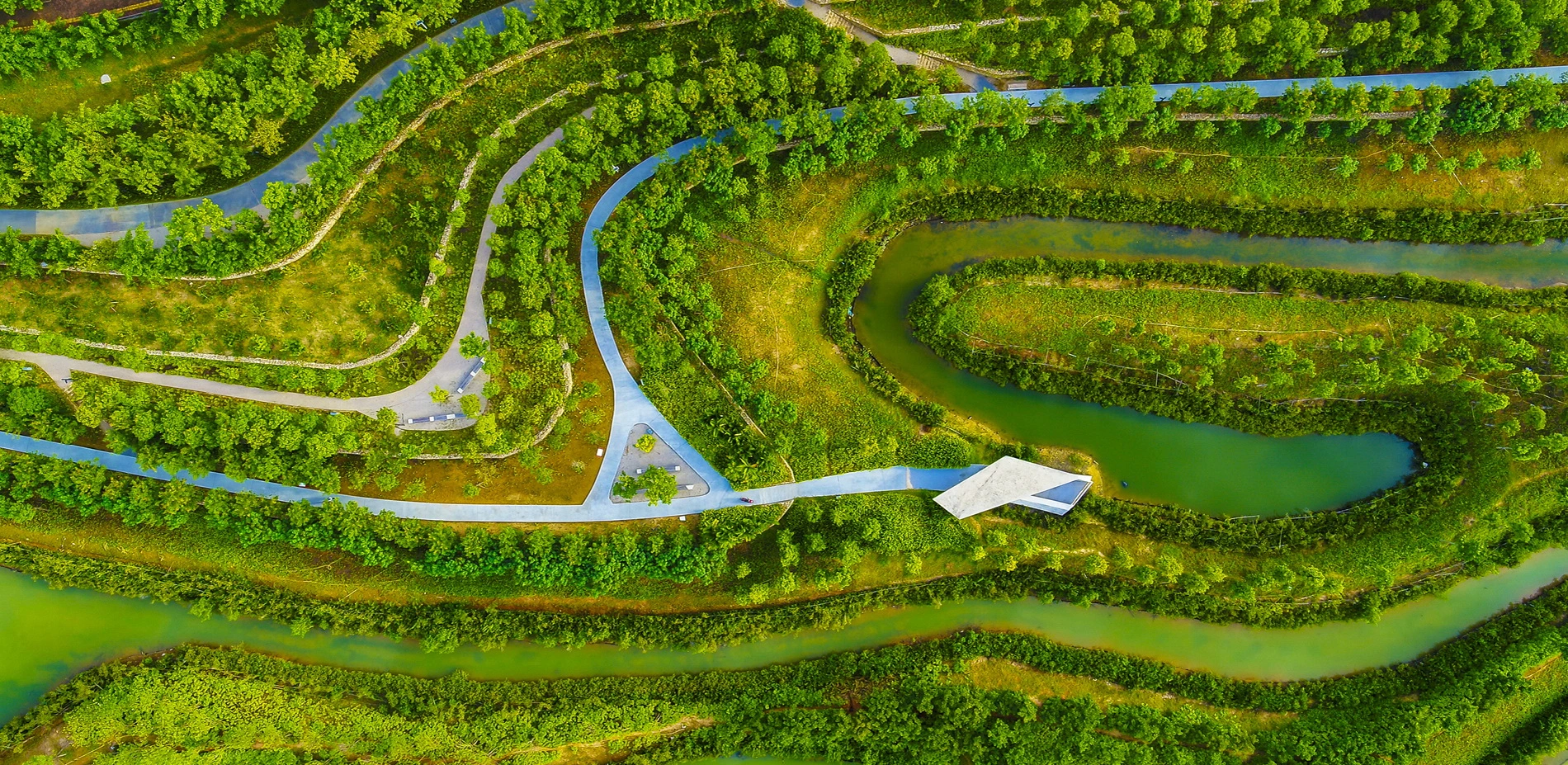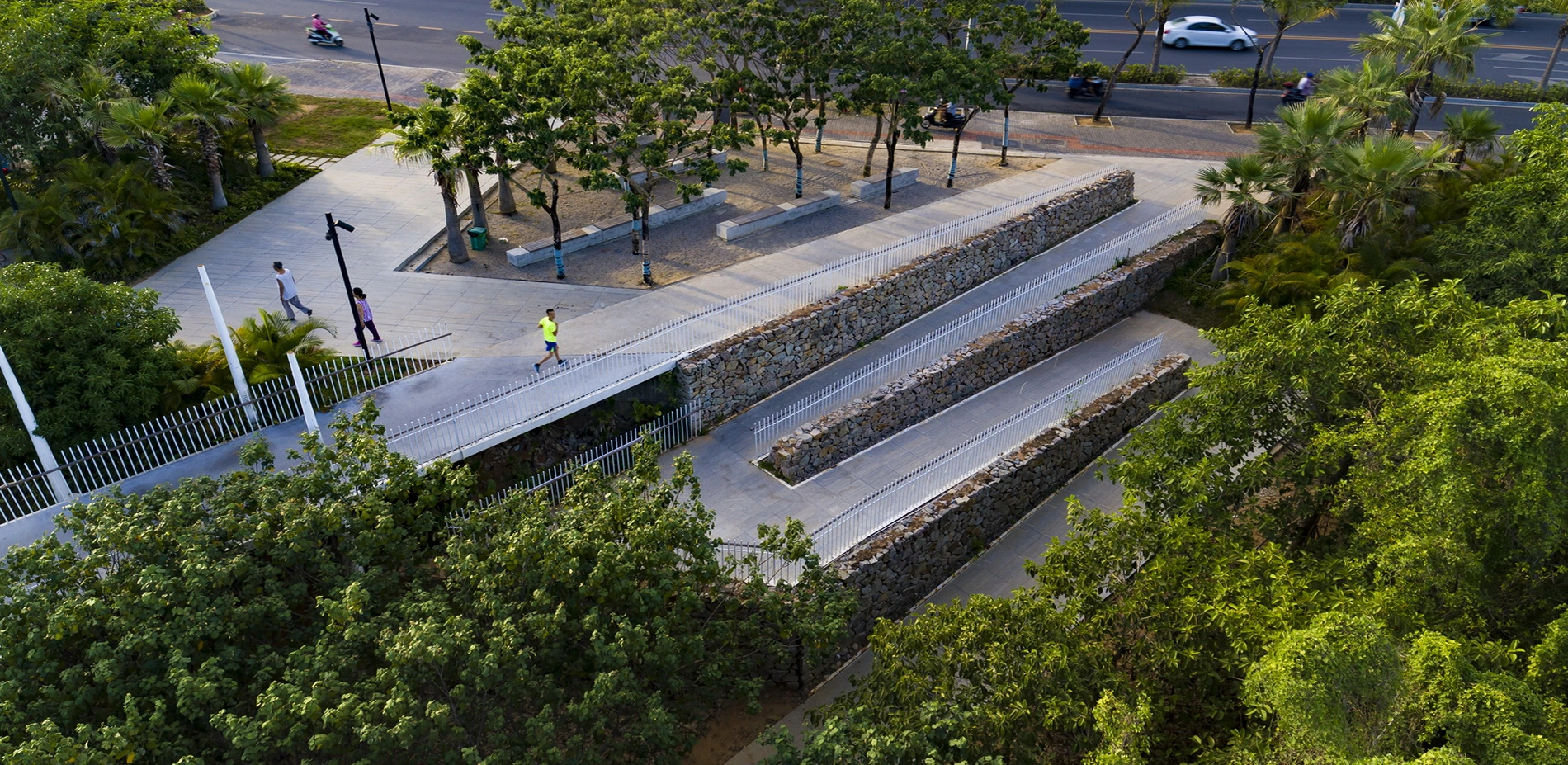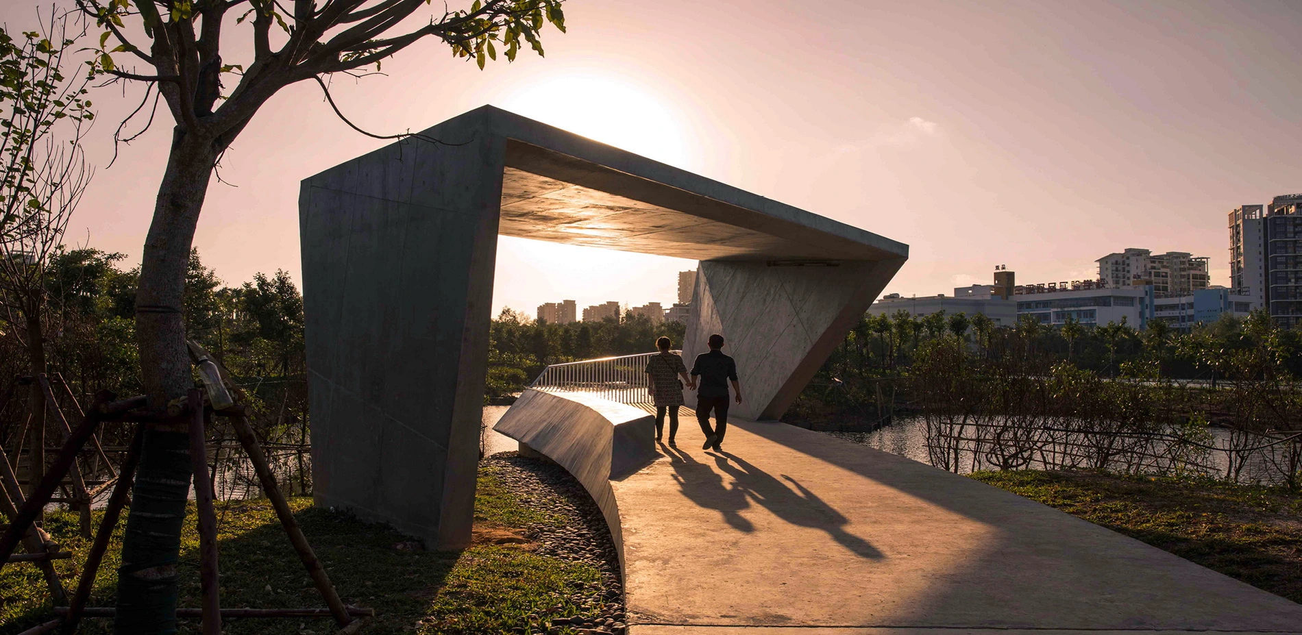 The waterways on China’s Hainan Island have proven to be vulnerable to flooding, but a new landscape within the Sanya River restores previously decimated mangroves that alleviate some of that risk while serving as a lush pedestrian recreation zone within high-rise city. Developers had left behind concrete retaining walls and polluted waterways, but now a thriving ecotone welcomes ocean tides with a porous edge condition that supports new mangrove growth. Terraced landscapes and elevated pathways bring visitors from the city down to water level, and storm-resistant concrete pavilions offer protection from overhead sun and tropical rain. The mangrove rehabilitation serves as a case study of strategies to return parts of cities to nature.