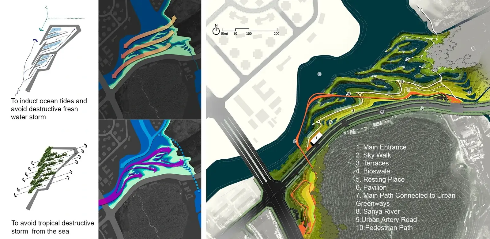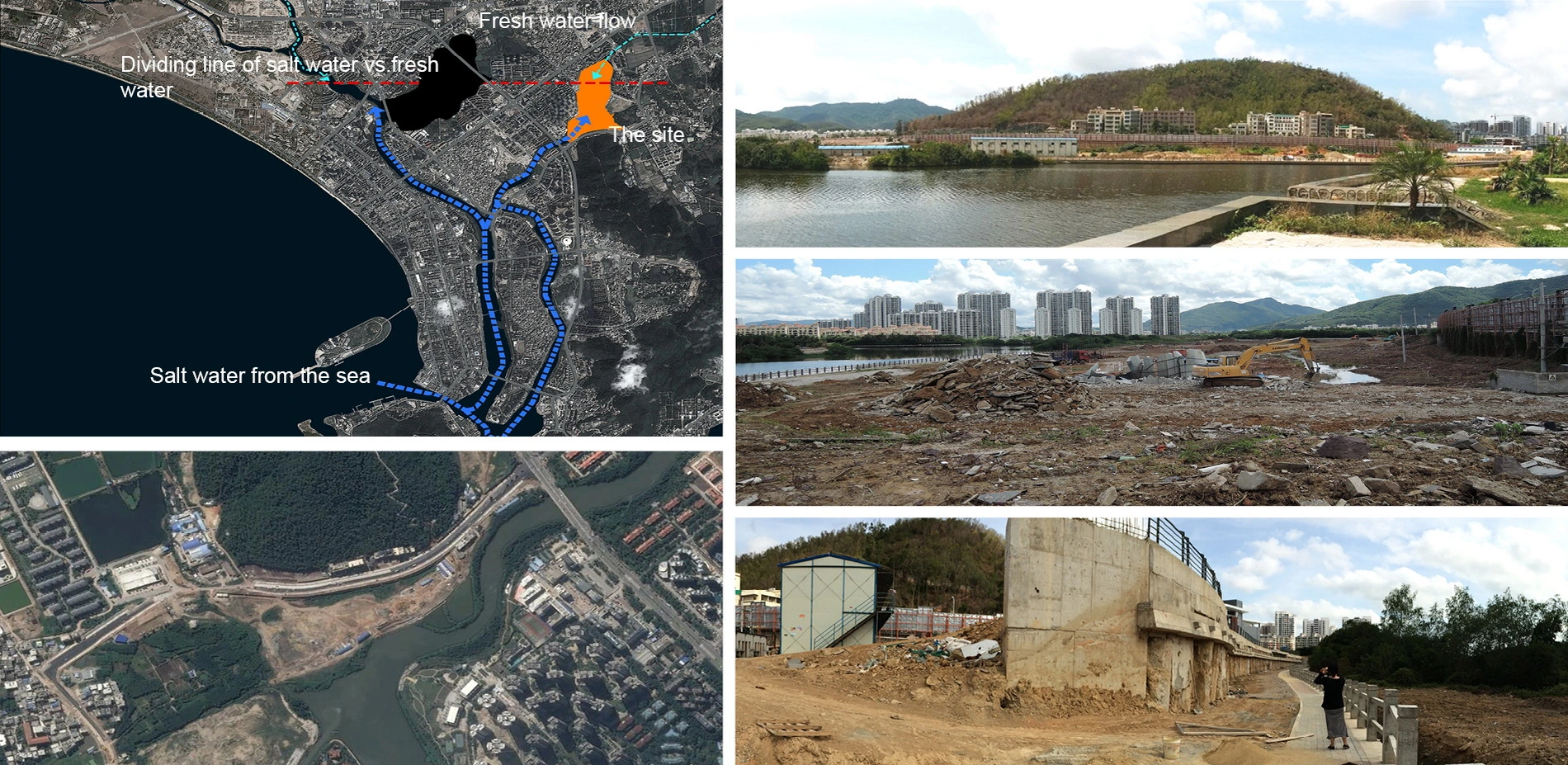 The site is 10 hectares (2.471 acres) in size, on the east bank of Sanya River that bears the name of the city itself, and in the central area of the city. Analysis shows that the site is also critical in terms of ecological relationships between the sea and inland, where the daily sea tides meet with the fresh water of the river. Typical of the city, the water is polluted due to the urban runoffs. High concrete walls have enclosed the site that is filled with urban debris for a new development project that has been stopped by the government. An artery road runs by, and there is a 9 meter steep drop from the road to the water, challenging public access to the water.