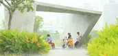 (4) Adaptive design of pavilions and access: a network of pedestrian passageways follow the landform. A skywalk is designed as a ramp to create an experience of walking above the mangrove canopy; five pavilions are strategically allocated allow visitors to enjoy the tranquility and beauty within the mangroves, as well as providing necessary shelter and shading in the changeable local weather. The modulated concrete shelters are designed to resist strong tropical storms; they open to views from various angles. The twisted pavilions make good shelters for bird watching.