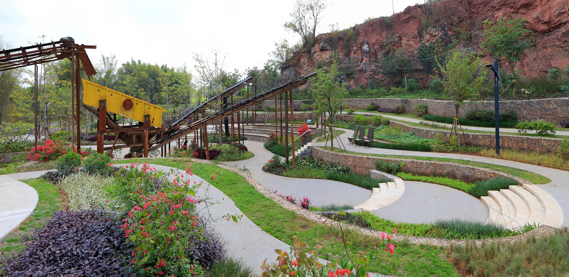 Quarry No. 6 was transformed into a romantic and gorgeous garden with post-industrial atmosphere, utilizing sand production machines left onsite. Along the southern cliff are several terraces with various thicknesses of earthing soil, meeting the needs of various plants, from herbs to trees. Most of the leftover equipment was set in the verdant greens that contrast with the rusty machinery. The paths twist among the terraces of different heights and under the overhead conveyor belt. Wooden benches along the paths and platforms provide comfortable venues for rest and relaxation.