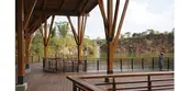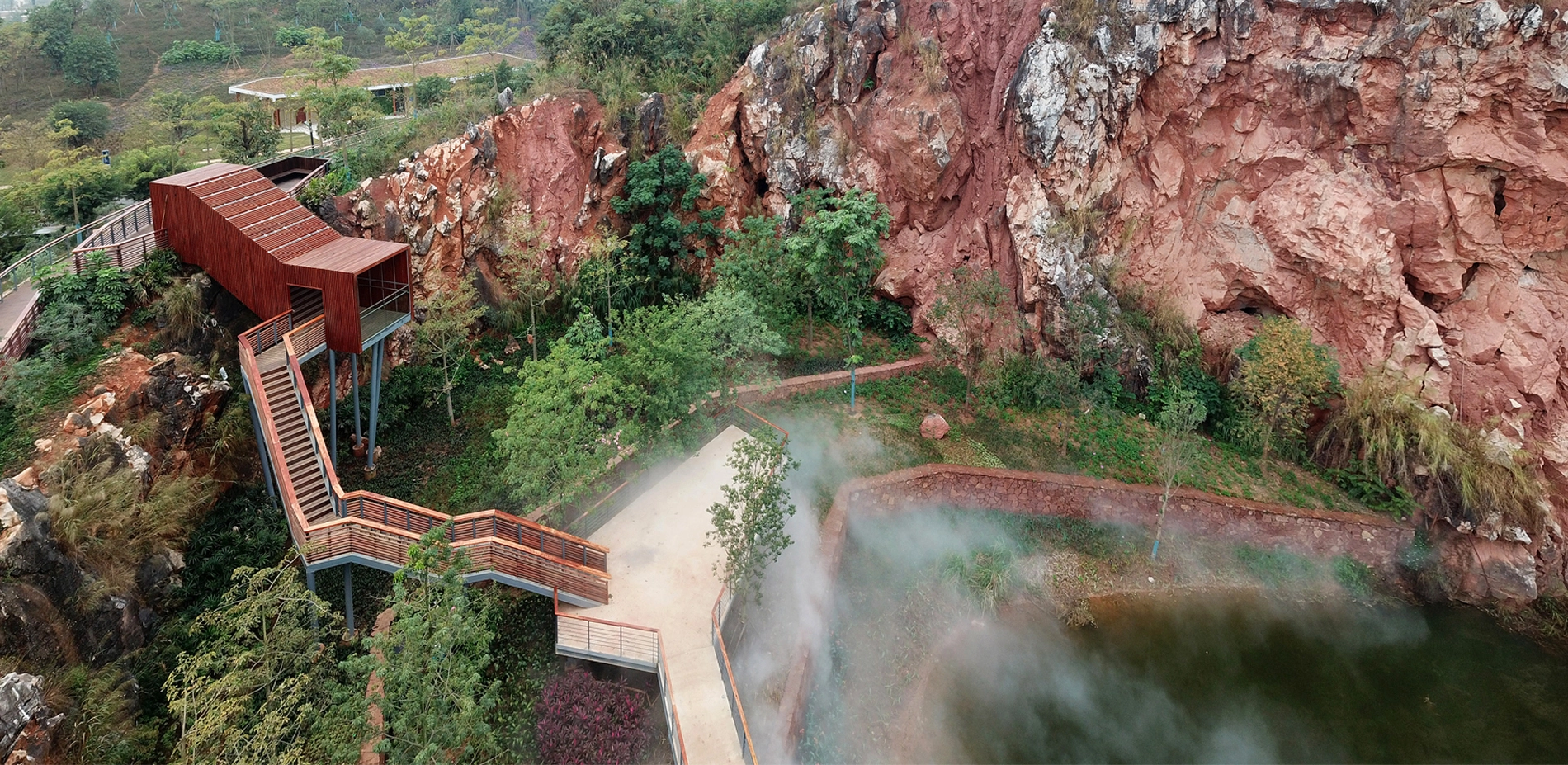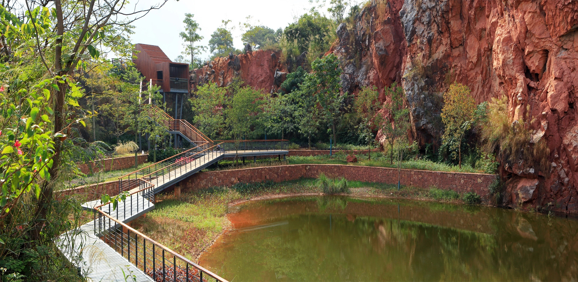 Quarry No. 2 is surrounded by cliffs on all sides. The quarry bottom is relatively flat and accumulates water perennially. The quarry is designed as an aquatic garden. The zigzag steel grating walkway winds through the planting zone and connects to a platform that further extends to a path above the cliff, accessed by several flights of steps. The section with the highest elevation features a closed wooden box, which is also an aerial viewing platform where people can appreciate a captivating view of the cliff and the entire garden expanse.