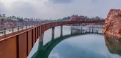 Quarry No. 5 is the largest among the seven quarries, enclosed by dilapidated cliff with terraced rocks sitting at the bottom. The quarry has transformed into a lake, caused by the continuously-rising water level. Two areas with relatively shallow mining depths were earthed up above the water surface, and planted with trees such as pond cypress and Chinese cypress, creating an aquatic woods landscape. Bridges and walkways of varying heights crisscross above the water and through the woods, creating a connection with the hilltop view platform. A waterfall is designed on the opposite of the bridge, forming a scenery spot accordingly.