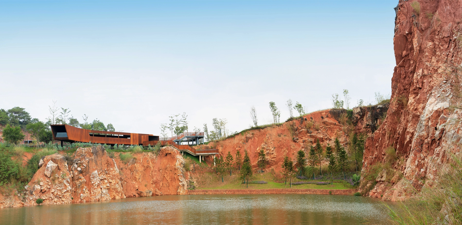 Quarry No. 4 is a large pond embraced by cliffs, with green and clear water. Viewing platforms sit on both northern and southern sides of the quarry. The northern platform is a Corten steel corridor located at the quarry’s edge, unraveling a long strip window towards the quarry, where visitors can feast their eyes on the steep cliff towering over 40 meters above the water surface. At the southern end of the corridor, people can enjoy an overlooking view of the charming pond situated beneath and the waterfront platform on the opposite side, offering a thrilling and exciting experience. On the southern side of the quarry, a wedge-shaped platform stretches out from a gap among the rocks. It hangs above the waters and connects to the lower waterfront platform through a curved bridge. Through an earthing-up process, vegetation was restored around the quarry as well as the gentle slope inside, which revives the quarry garden meanwhile highlights the steepness of cliffs.