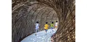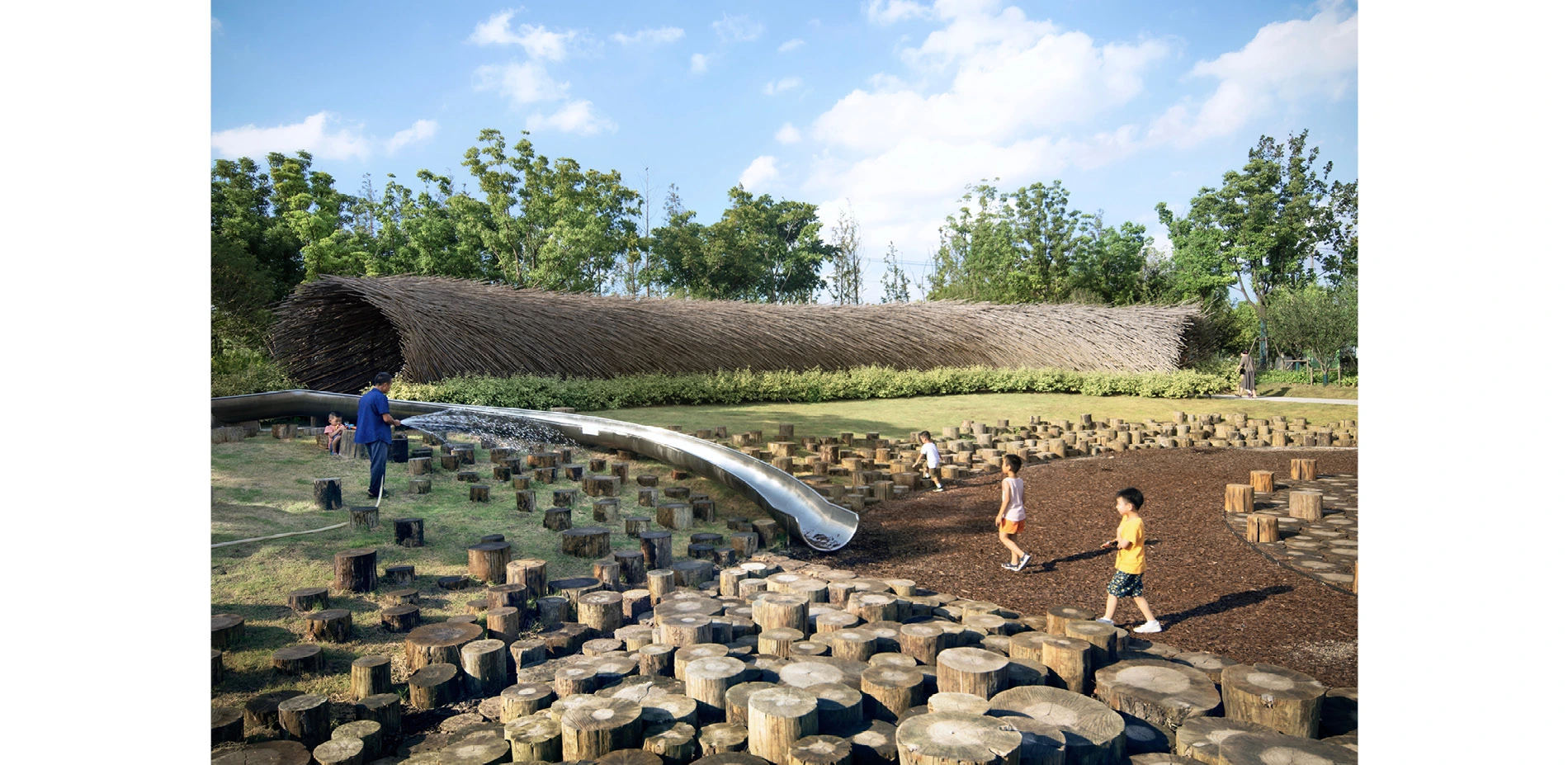 - `- Custom play feature – mixture of wood logs (in variable heights) for field and climbing poles, handmade bamboo shells (Cocoon and Caterpillar Tunnel), and handwoven rope for climbing net, designed by Field Operations with local manufacturing in collaboration with SLADI, local contractor Qinsen Gardens Co., Ltd.