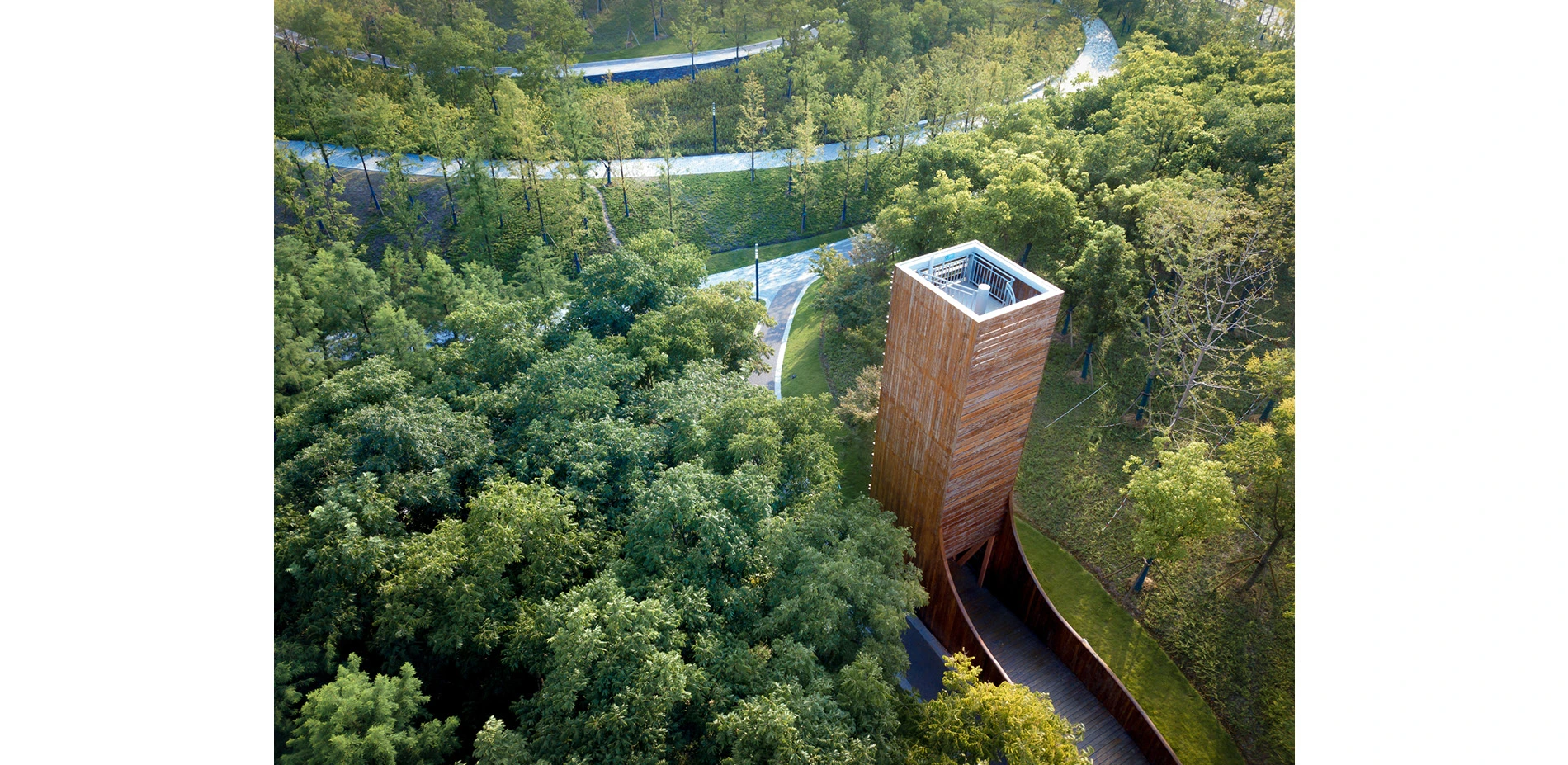 Large-scale earthwork was necessary to confront some of the site’s industrial legacy, including excavation, relocation, and capping of contaminated soils. Soils were managed on site, rather than being removed or stored elsewhere, as a long-term ecological benefit. In contrast with Shanghai’s flat topography, this rough earthwork provided a topographic base upon which the park’s sculpted landforms can create vistas and valleys with incredible views of the city and the park itself. Watchtowers set within the forest leverage new views and allow for an experience of immersion within nature and the city simultaneously.