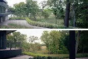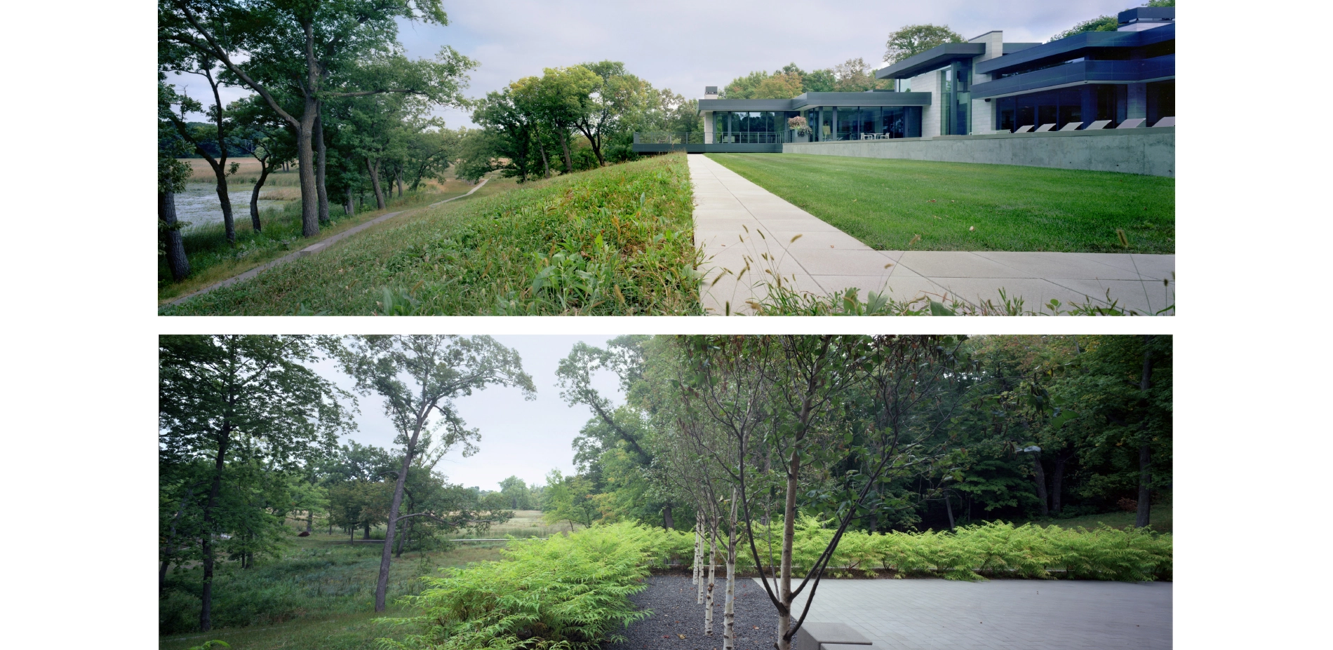 The home itself sits within a small pocket of developed land, which allowed the landscape architect to focus on thoughtful restoration plans and careful circulation throughout the broader landscape, in a manner that emphasized minimal impact of the work and design. The areas immediately surrounding the house are designed to maximize views to the restored landscape and echo the distant pathways with complementary programming including pool terraces and sunken gardens.