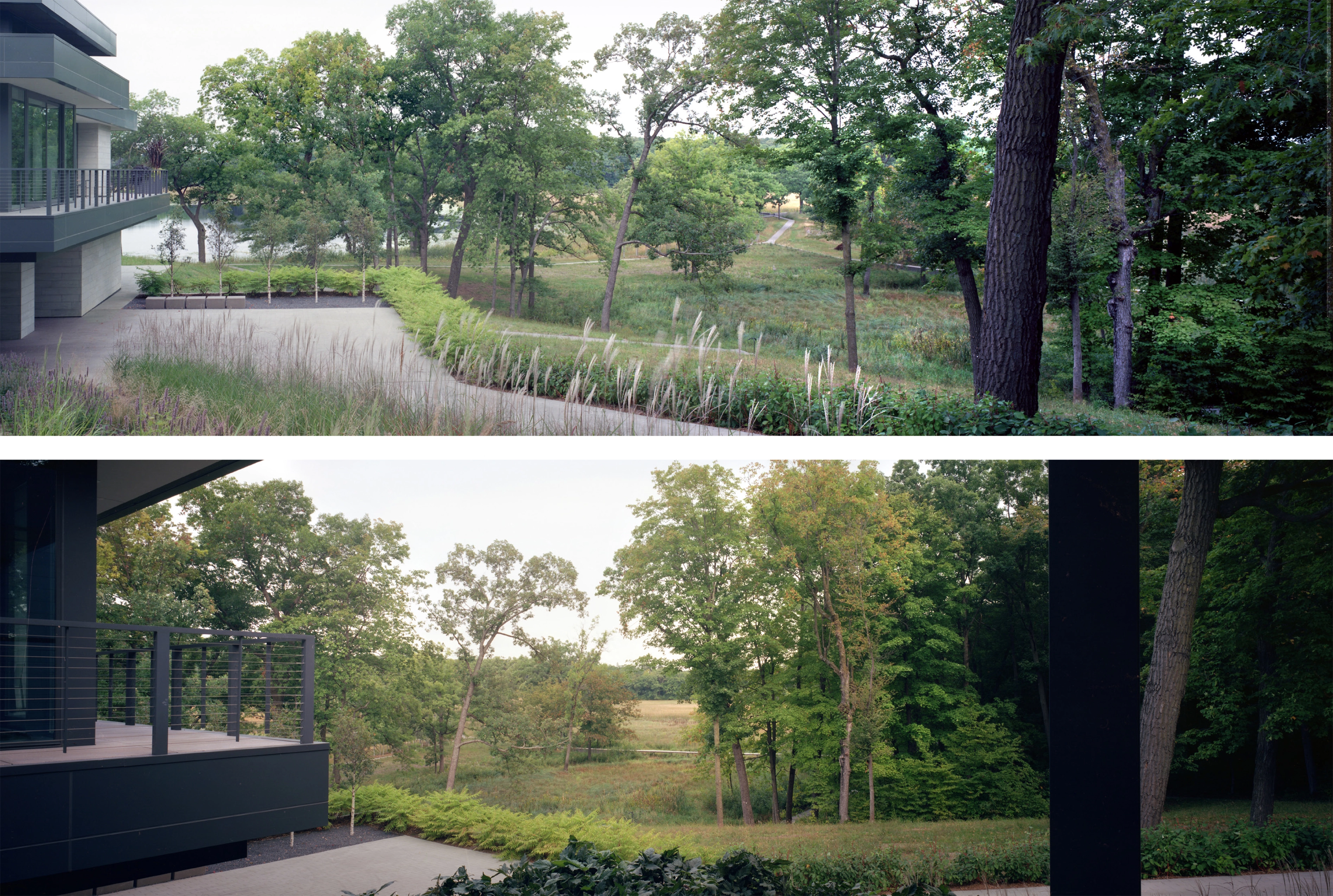The Lake Marion estate covers twenty-two acres of oak savannas, woodlands, wetlands, and lakeshore. From the project’s inception, the clients were deeply committed to restoring the landscape to its native splendor, requesting that the entire area be accessible while simultaneously minimizing ecological impacts.