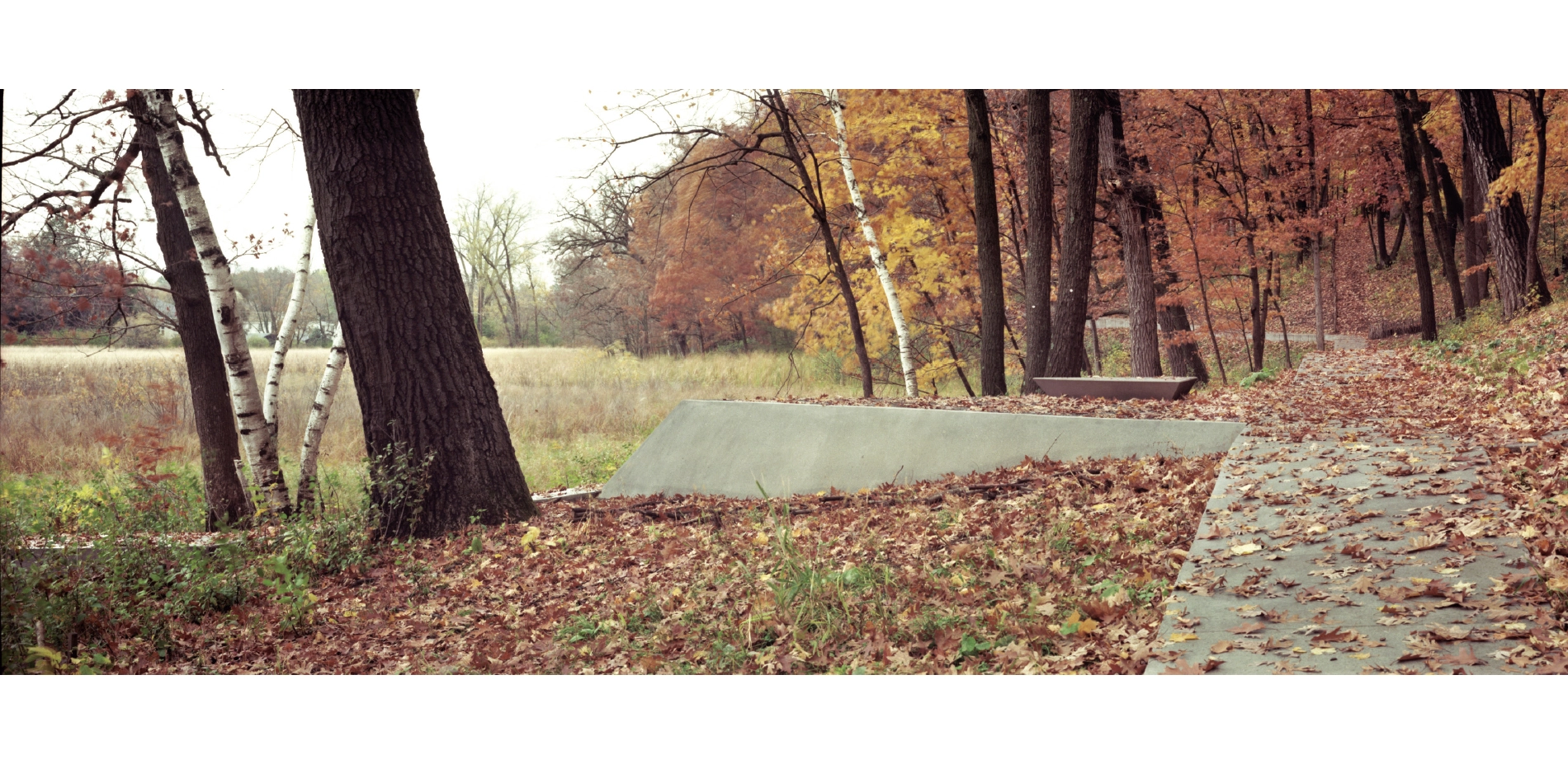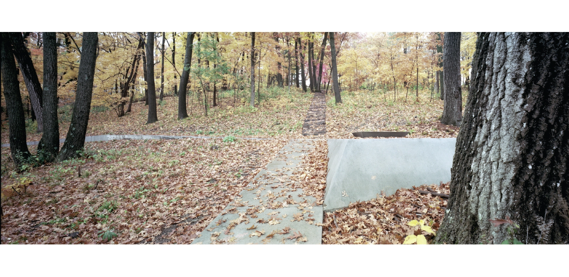 The minimal material palette of the circulation network emphasizes the dynamism of the surrounding landscape. Paths placed on solid ground are cast-in-place concrete using locally-sourced granite aggregate. Gathering nodes are a mix of cast-in-place concrete and crushed granite aggregate and extensive custom formwork was necessary to manage topographic changes and design requirements. When crossing a body of water, the walkway transitions to a simple wooden boardwalk of reclaimed ash. These boardwalks are devoid of vertical articulation – simple horizontal lines that float over the water below. All pathways are a uniform 42” – narrow enough to accentuate the intimate and contemplative nature of the experience.