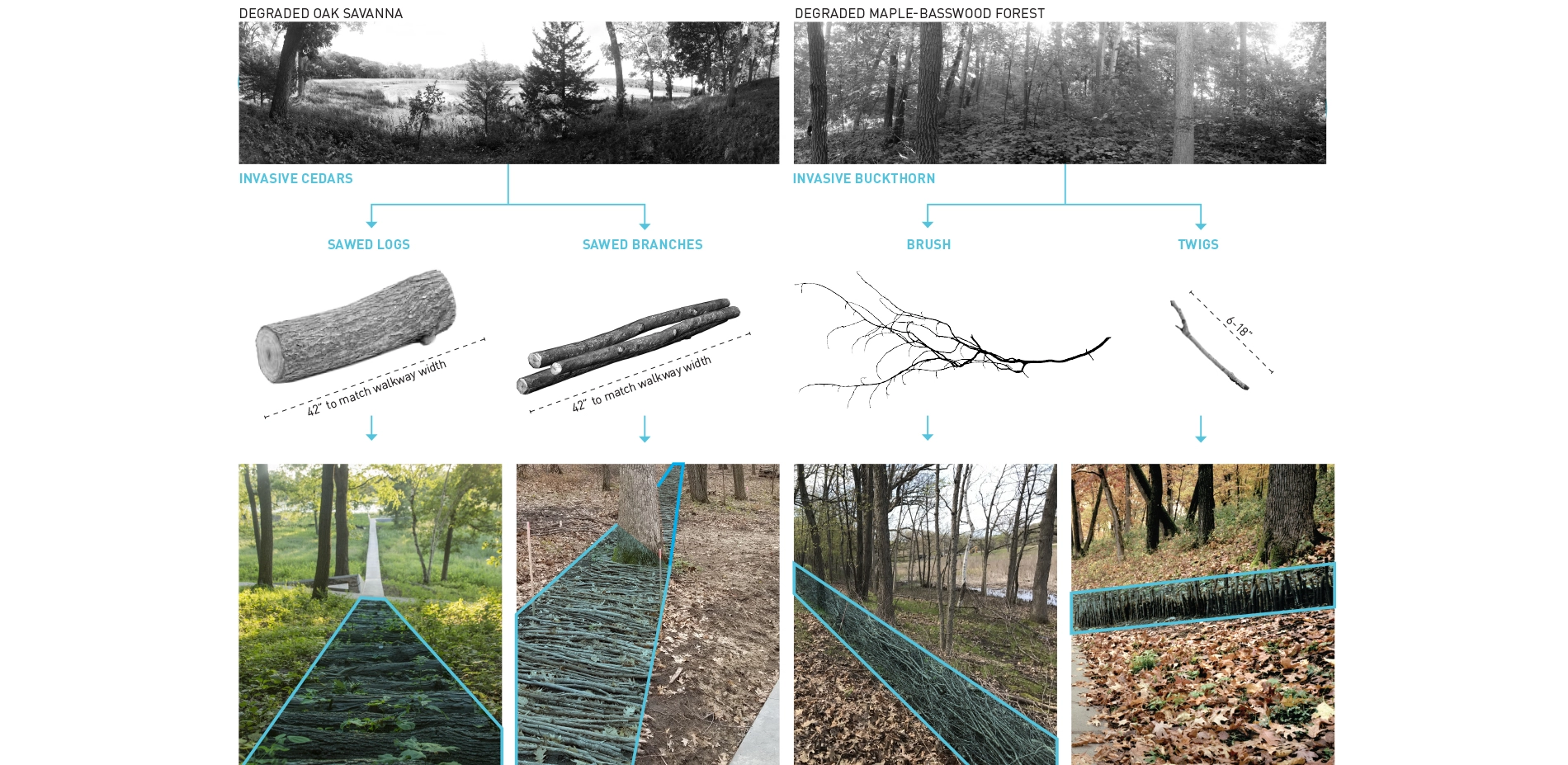 To acknowledge the material-impact of ecological restoration and the human impact on the land, the landscape architect designed art installations that utilize material harvested from the removed invasive species, primarily buckthorn and cedar. Working with Wetland Habitat Restorations they hand-picked various materials, including 42” long sticks, logs, and thinner branches of varying length, and arranged them throughout the site. The art installations respond to their context to enhance the experiential nature of the pathways. In some places they guide a walker’s view through the forest toward infinity in others they skew across the path, drawing one’s eye across a wide spectrum of biomes and restored ecologies.