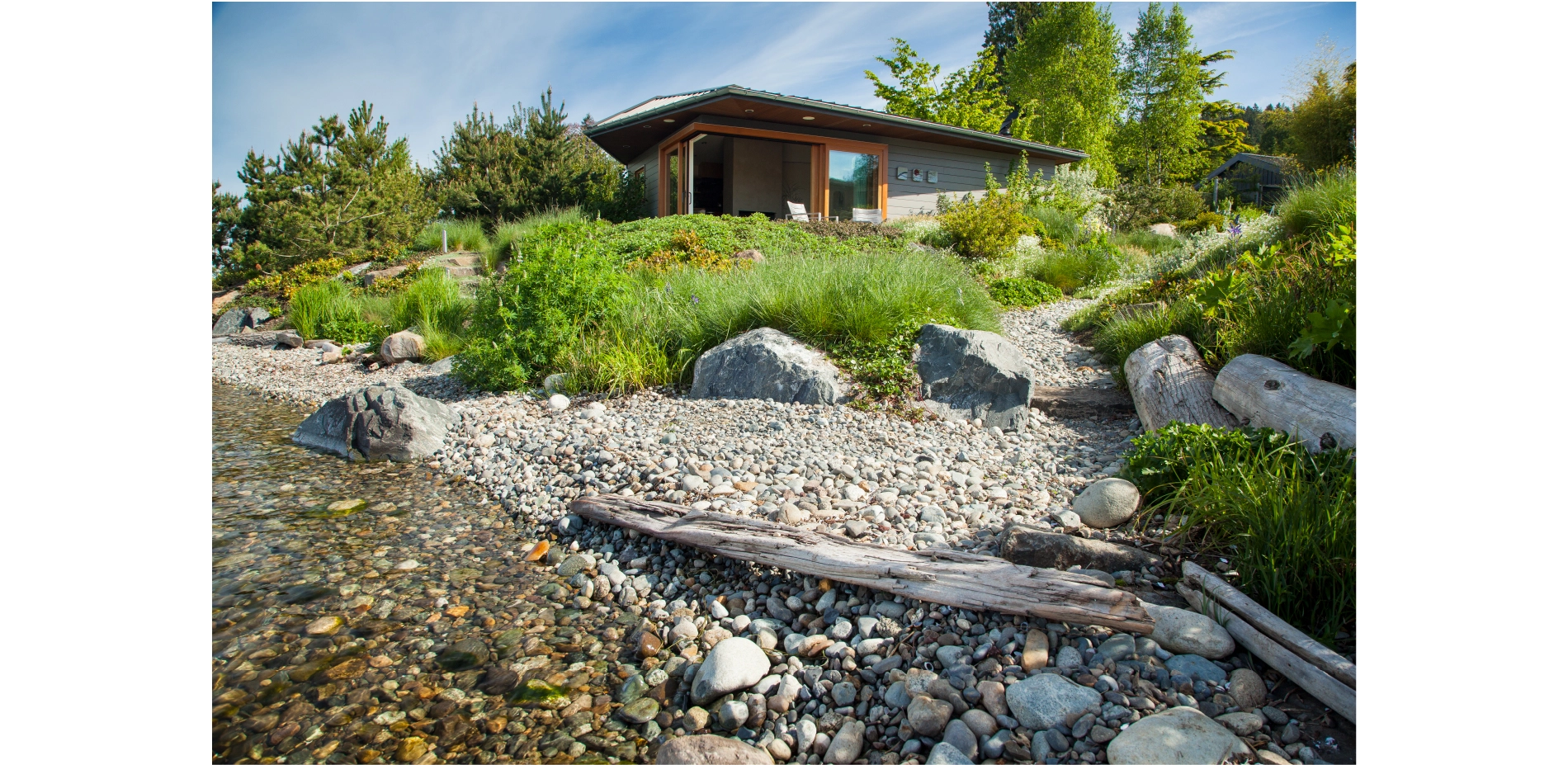 The project was in two parts. Waterside, the restoration required reproducing a "living" shoreline's gradual shelving of size-specific pebbles (rounded, to encourage salmon spawning) to naturally attenuate wave action. Large woody debris anchored to the substrate provided additional protection and allowed materials and sediment to gather, creating conditions for life. With underwater plant-life established, fish now swim in these calmer shallows and ducks and otters can come ashore. The 'upland' side of the landscape uses native plants extensively, providing food and dense cover, which promotes the population of invertebrates (1). Abundant insects are an important food source attracting local birds, which in turn attracts a Cooper's Sparrowhawk - now a frequent visitor. These ecological relationships have significant amenity value to the client.
