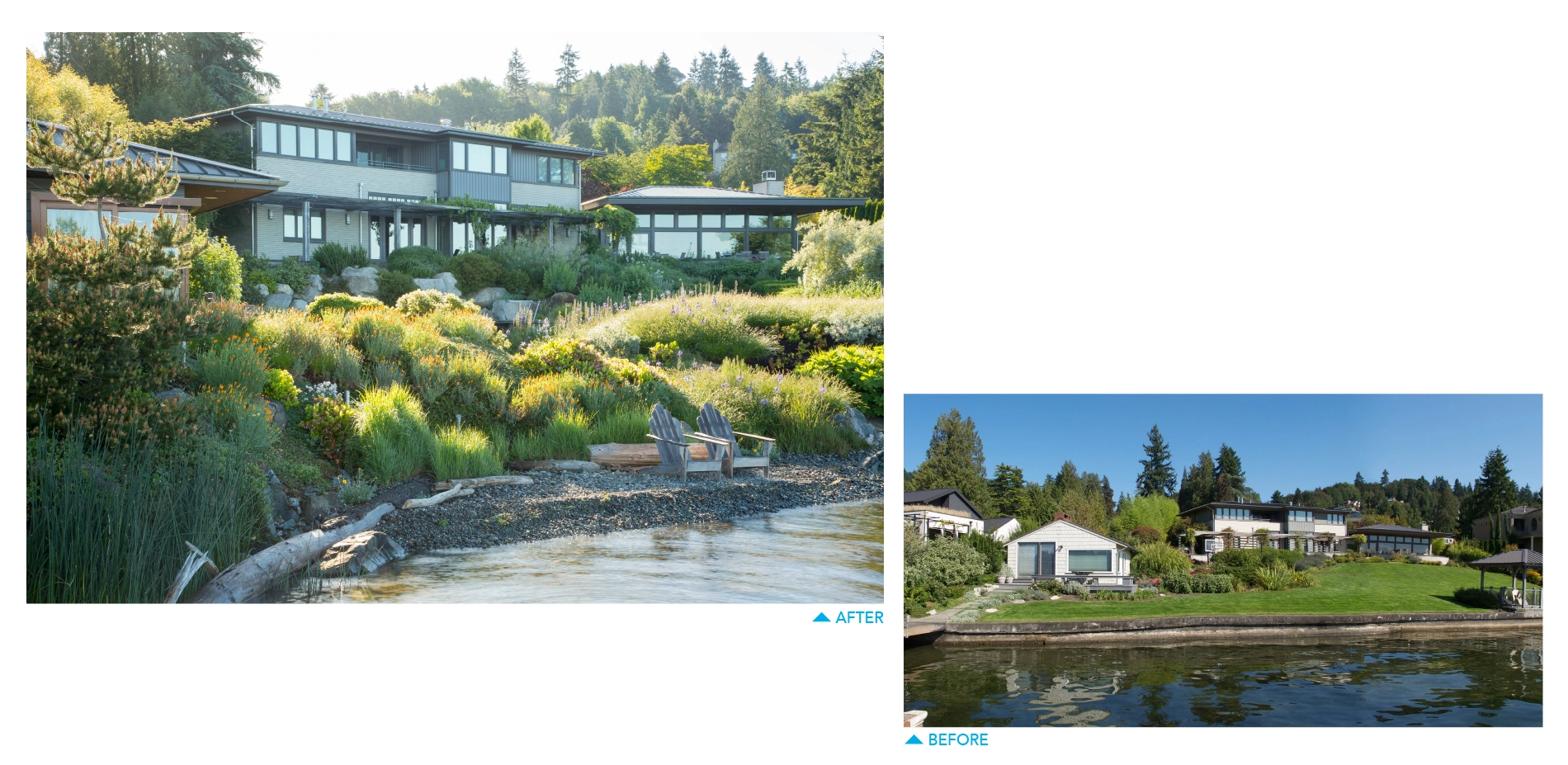 150' of southwest-facing shoreline is never a bad thing, yet this one-acre parcel in Seattle was compromised. A failing bulkhead and lawn run-off created hostile conditions for the lakeside ecology, and by restricting access was unfriendly for people, too.