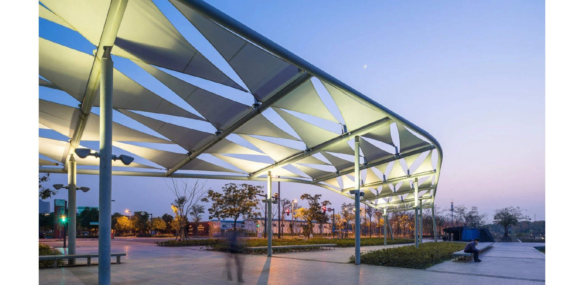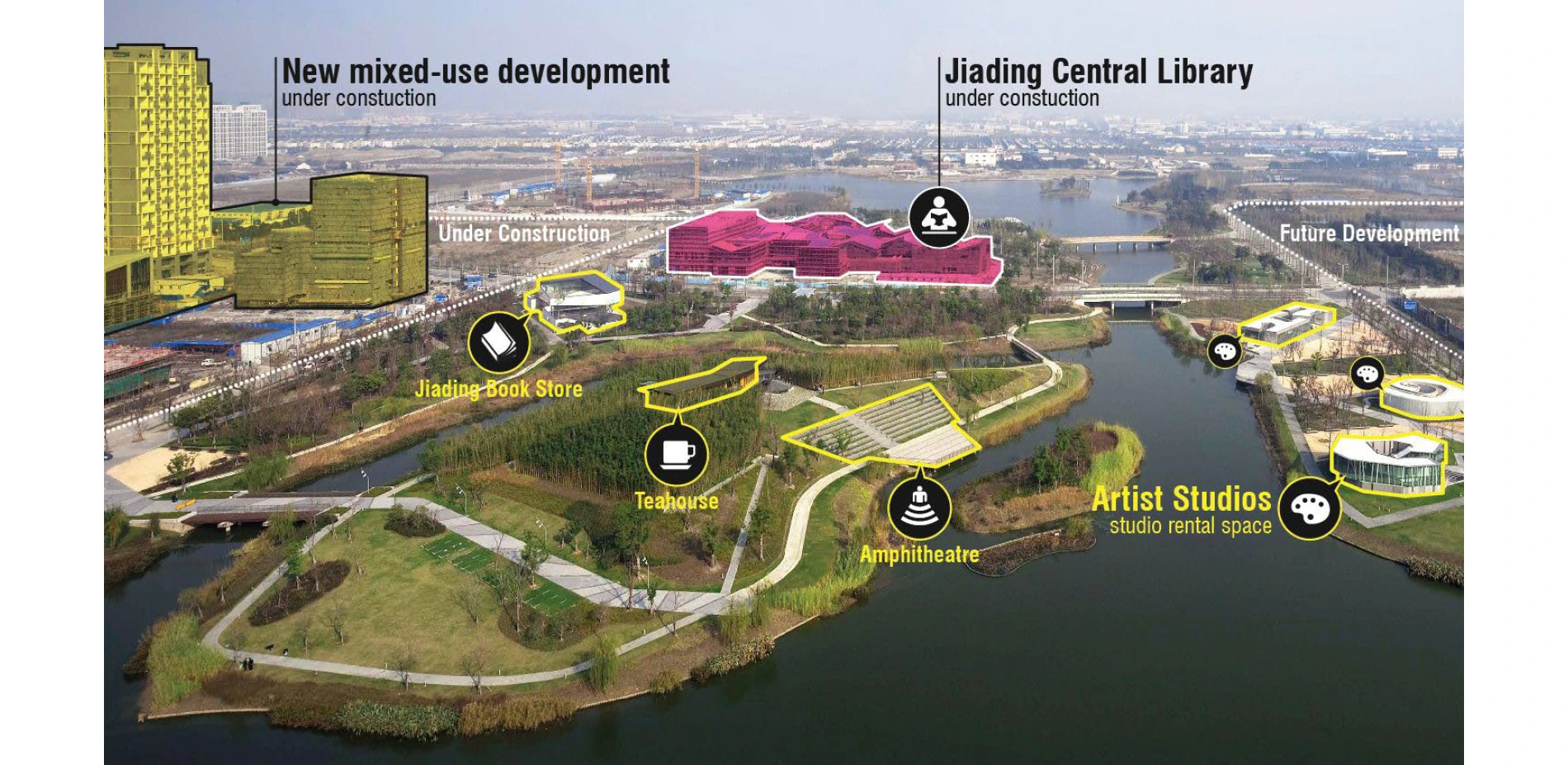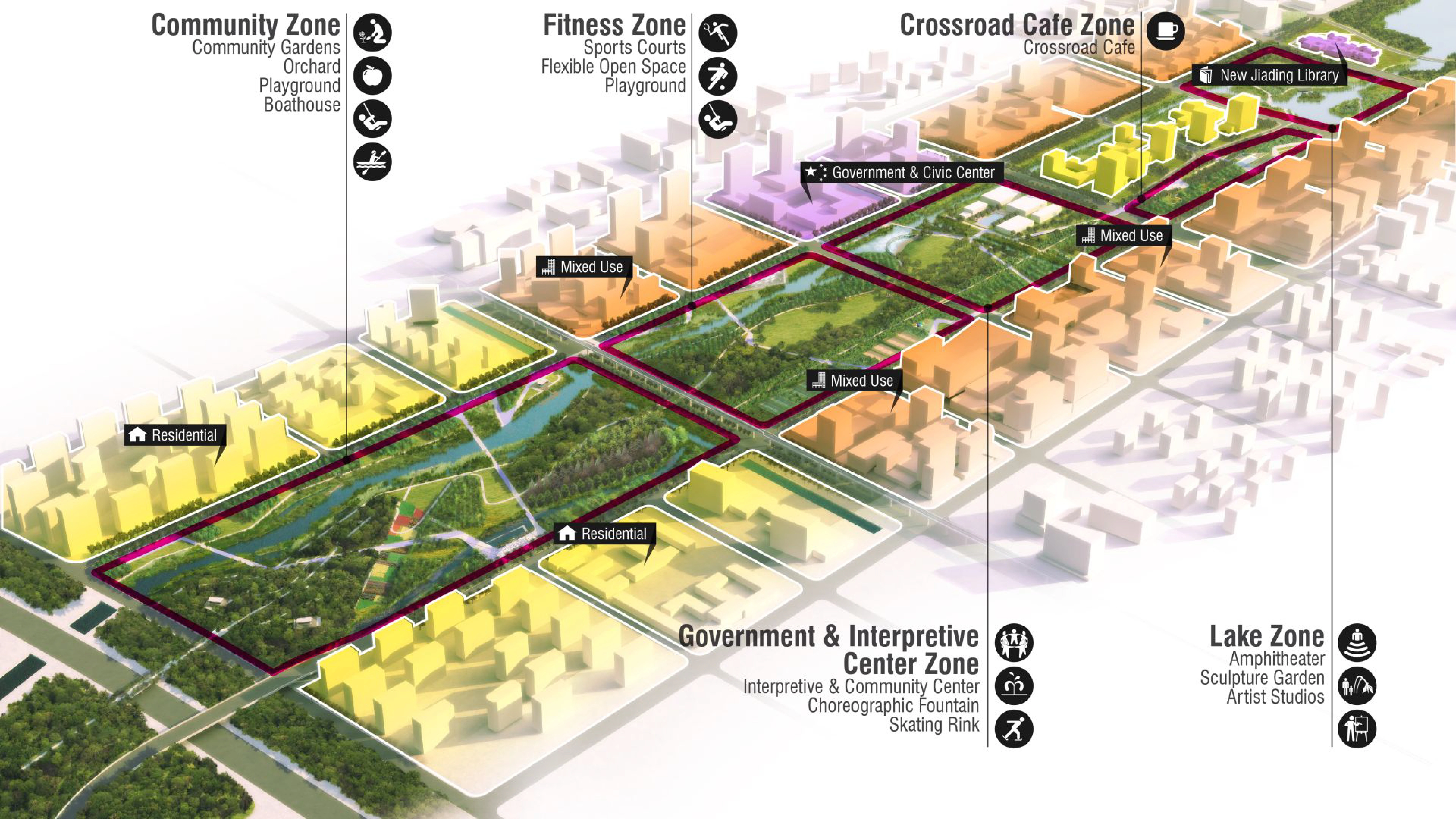 Jiading Park is the social and recreational hub of the burgeoning district, and is connected to a wider network of pedestrian pathways. In total, about 18 hectares of the park are dedicated to recreational uses. About 6,500 square meters of development area features restaurants, art galleries, and civic program. There are also 17 kilometers of paths and boardwalks throughout the park, with links from adjacent residential neighborhoods at multiple points to facilitate accessibility. As a catalyst for the new development, it is now framed by government, cultural, and civic buildings, mixed-use developments, and residential high-rises. It is also highly connected to the regional public transit network, with the Baiyun Road station of the Shanghai metro linking the park to downtown Shanghai in approximately 45 minutes via subway Line 11.