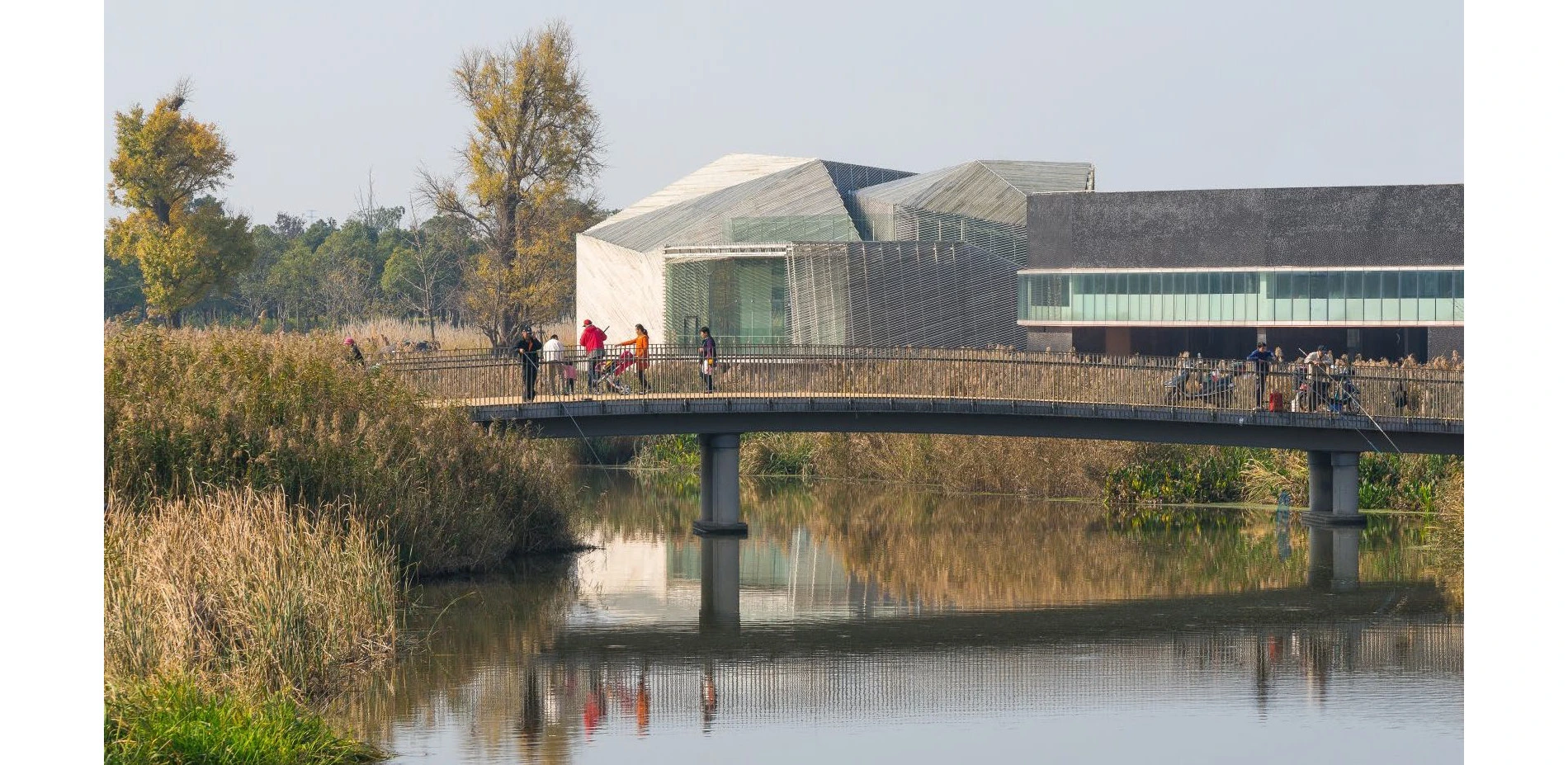 Four distinct pathways run the length of Jiading Park – the Dynamic Path, the Tranquil Path, the Water Path, and the Tree Path. The Water Path runs alongside the main canal, past wetlands, filtration beds, planted wetland terraces, and waterfront boardwalks. The Dynamic Path links activity nodes with broad promenades and trails that climb topography and frame views of the site and city. The Tranquil Path is narrower and meanders through denser vegetation, allowing for a more immersive experience. Finally, the Tree Path was constructed by recycling the asphalt of a former road and utilizes its existing street trees to provide a shaded promenade. According to a recent social survey conducted by a research team from the National University of Singapore (NUS), most visitors are 25-40 years old and frequent the park with their families. The majority walk or bike to the park from less than a 2 kilometer radius, and many enjoy fishing in the canal in addition to the park’s programmed amenities. NUS researchers also noted that the park is the epicenter of public space and social life in the Jiading neighborhood and acts as a magnet not only for the residents of the area, but also for those considering a move out of Shanghai.