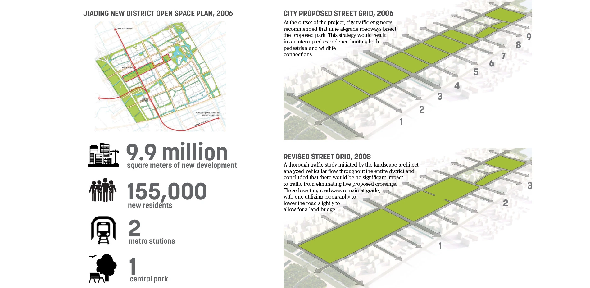 The City’s initial urban design strategy for Jiading District identified an open space reserved for the new park that was segmented into 10 sections with 9 roads cutting across its width. A thorough traffic study initiated by the landscape architect analyzed vehicular flow throughout the entire district and concluded that there would be no significant impact to traffic from eliminating five proposed crossings. Three of the bisecting roadways remain at grade, with one creatively manipulating topography to lower the road slightly to allow for a land bridge. The result was minimized fragmentation of the park, an uninterrupted pedestrian experience, and better connectivity of ecological systems and wildlife corridors.