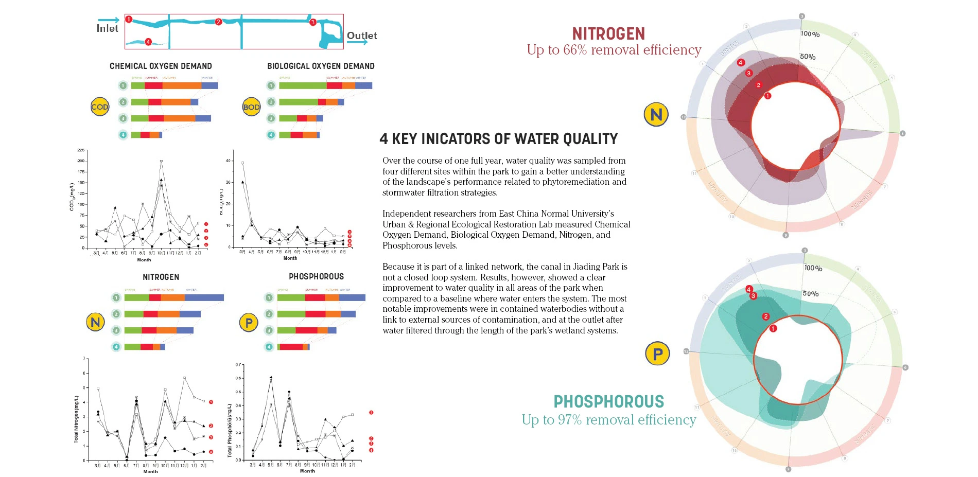 Existing canals on the site were retained, naturalized, and expanded to improve water quality and filter stormwater runoff. 60,700 square meters of constructed wetlands were created with a capacity to treat up to 10,900 cubic meters, exceeding the runoff volume from the site and surrounding roads and development that drain to the canals during a 95th percentile storm event. Biofiltration areas were included along adjacent roads to provide treatment prior to discharge into the park’s canals. A series of vegetated filter strips supplement the wetlands’ cleansing function, and sub-surface rainwater storage cisterns hold water for irrigation. A post-occupancy evaluation conducted by East China Normal University’s Urban & Rural Ecological Restoration Lab noted significant improvements in water quality across the site. Samples taken at multiple points along the main canal over the course of a full year demonstrated a 66% reduction of total nitrogen, and a 97% reduction of total phosphorous.