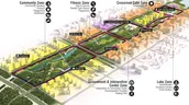 A 3.2 linear kilometer naturalized canal forms the backbone of the park. Here, wetlands improve water quality and support riparian habitats. Pockets of dense green cover, some inaccessible to humans, create refuge for wildlife. In total, water bodies make up 16.4% of the park while wetlands constitute some 9.2%. Pedestrian and cycling networks are overlaid onto this blue-green canvas, offering visitors options including secluded trails and broad promenades. These two big moves – altering the roadway grid and focusing on its ecological contribution – allowed the park to guide major urban design moves rather than simply reacting to given conditions.