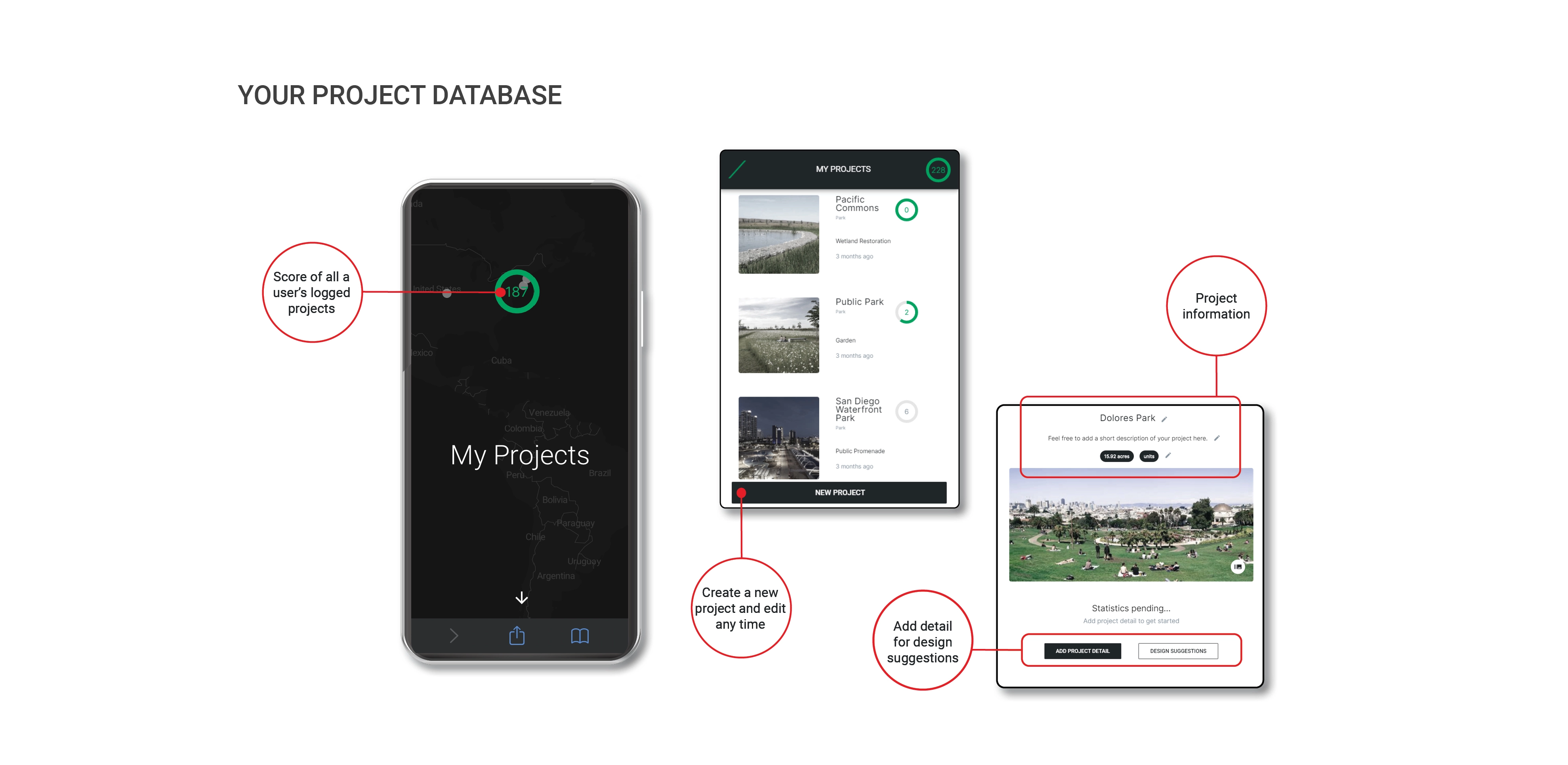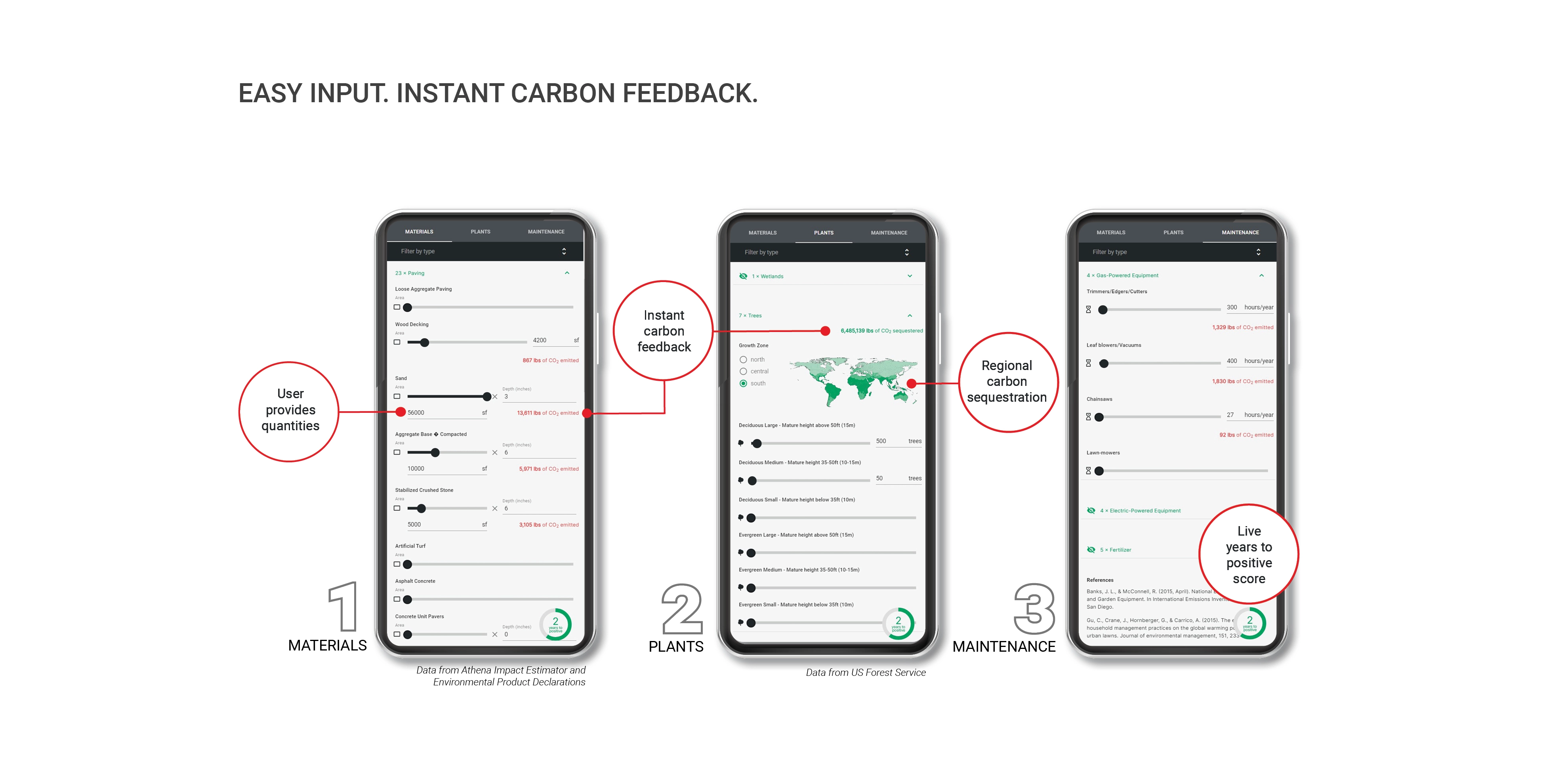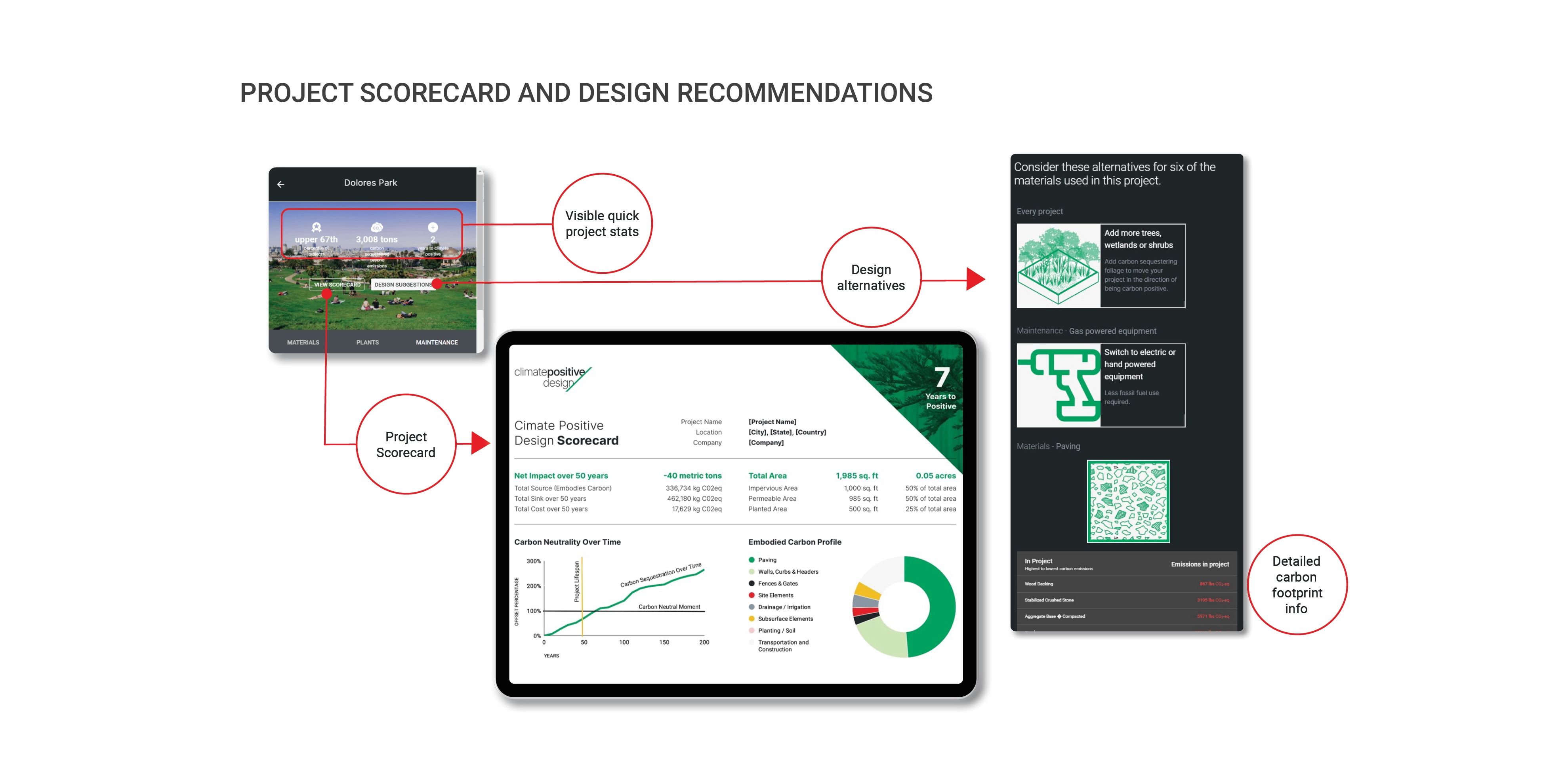 The app features educational onboarding and a homepage for each user, or company, where projects can be created or edited at any point in time. Users enter quantities for materials, plants, or maintenance plans and receive instant feedback on carbon emissions, sequestration, and their YTP or Climate Positive Score. A scorecard provides detailed stats that can be plugged directly into Life Cycle Assessments (LCAs) and project specific design suggestions help guide users toward improving their project’s impact.
