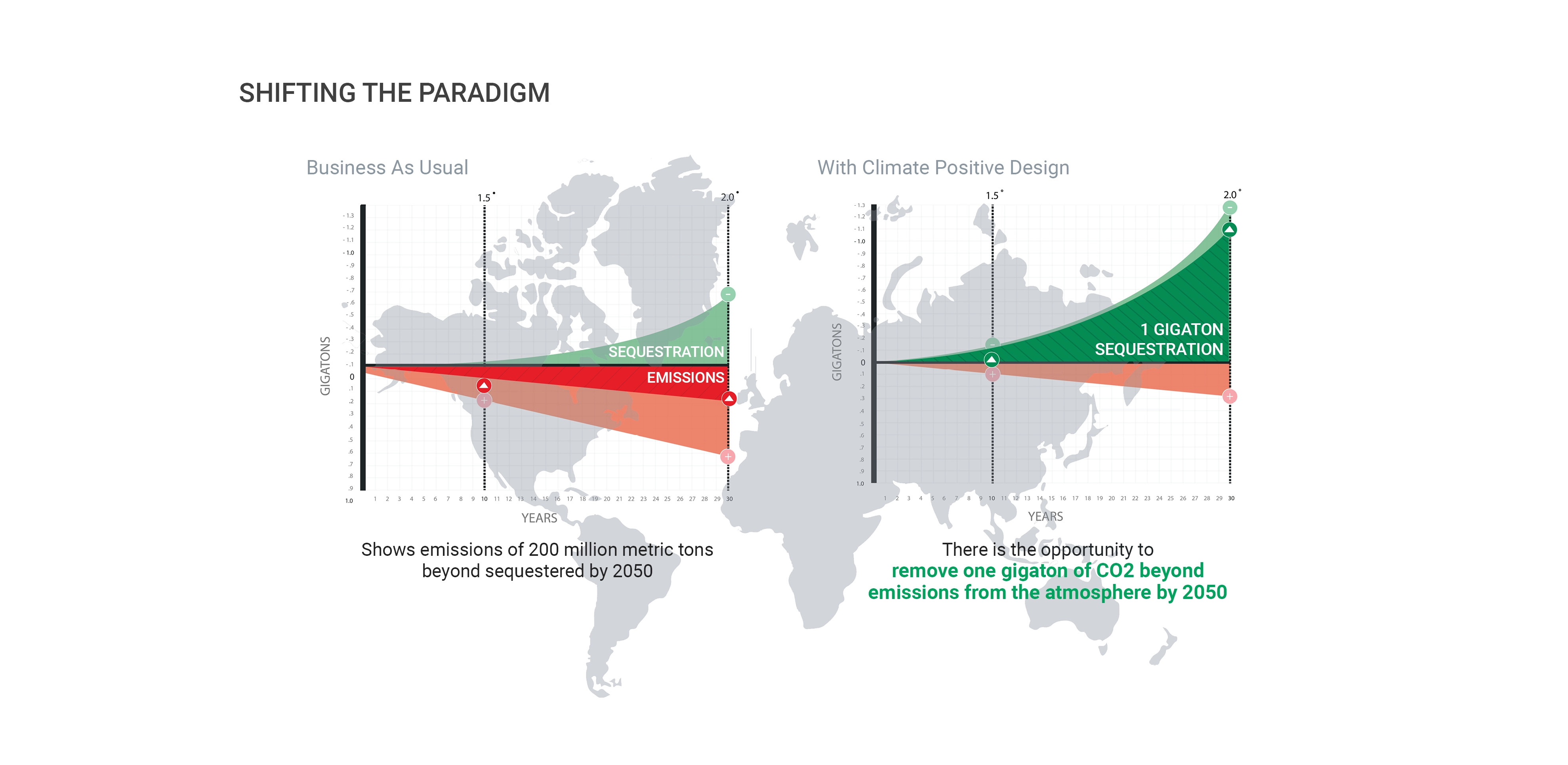 Using unchanged case study project data, or “business as usual”, and extrapolating that to the global community of approximately 75,000 landscape architects, projections show that projects collectively emit more carbon than they sequester. However, by meeting the goals of the Challenge, the results would instead show projects sequestering more carbon than emitted by 2030 and extracting roughly one gigaton of CO2 out of the atmosphere by 2050 beyond emissions. This impact would fall within the top 80 solutions listed in “Drawdown” by Paul Hawken, that when implemented collectively over the next 30 years will reduce GHG emissions on an annual basis and reverse global warming.
