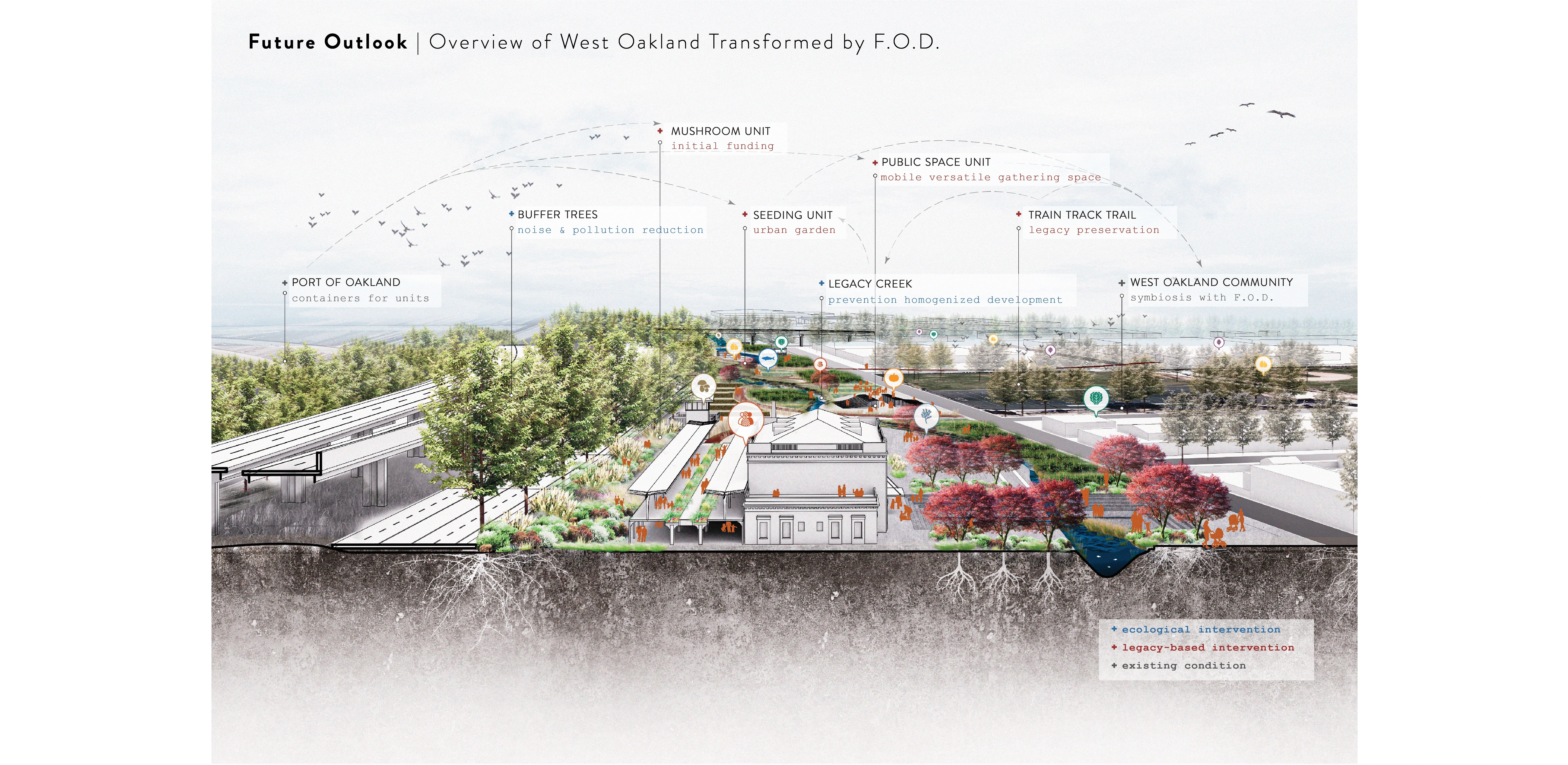 A new FOOD-ORIENTED-DEVELOPMENT strategy is proposed - to turn around the dire situation environmentally, economically, and most importantly, socially. By tackling the two major hindrances to improving growth and food conditions (in soil contamination and lack of initiatives), the new system starts at the vacant historical train station, transforming a former site of Oakland’s glory into a catalytic site for growth. The Food Oriented Development (F.O.D.) also brings West Oakland to the center of the Bay Area as a new development model, where people are reconnected by the most fundamental elements of life: food.
