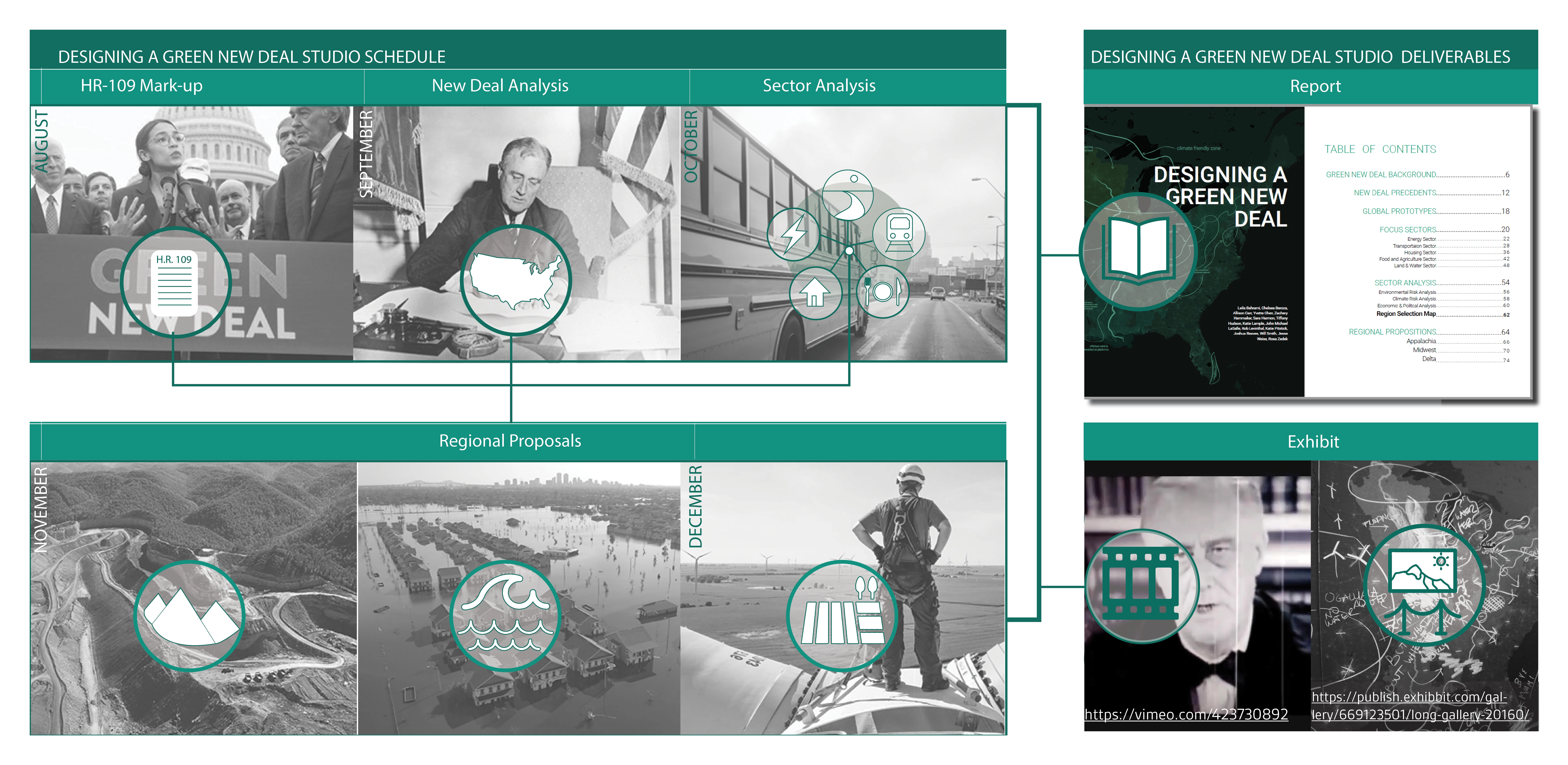 The investments a Green New Deal would make in our physical assets—homes, offices, transportation, and parks, —are where the material benefits of a Green New Deal will be best understood by the American people. As it currently stands, the Green New Deal offers little insight into how such an ambitious program would be realized in the built and natural environment. In this studio, we ask how and where designers could play a role in pushing the Green New Deal from an idea to reality.
