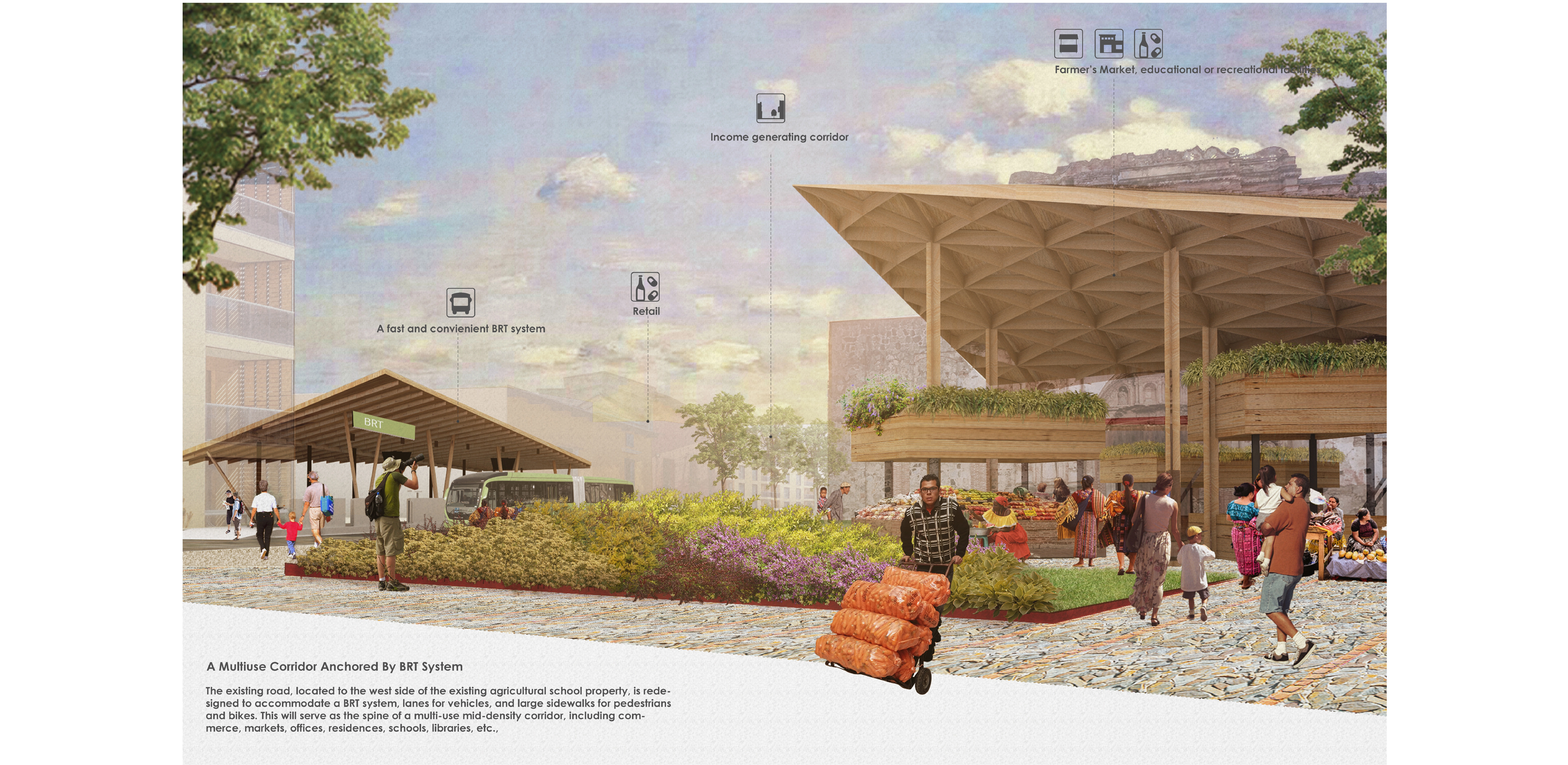The existing road, located to the west side of the existing agricultural school property, is redesigned to accommodate a BRT system, lanes for vehicles, and large sidewalks for pedestrians and bikes. This will serve as the spine of a multi-use mid-density corridor, including commerce, markets, offices, residences, schools, libraries, etc., which will attract investments, providing jobs, services, and amenities, and in turn, provide for funding to support actions in the public real and social housing. The stations of the BRT system coincide with the main civic transversal corridors and are close to important communal services as the markets, educational or recreational facilities. Here again, the transformation of the two-lane road into this mobility, service, multi-use, and an income-generating corridor is also possible thanks to tapping on a fringe of the public land.