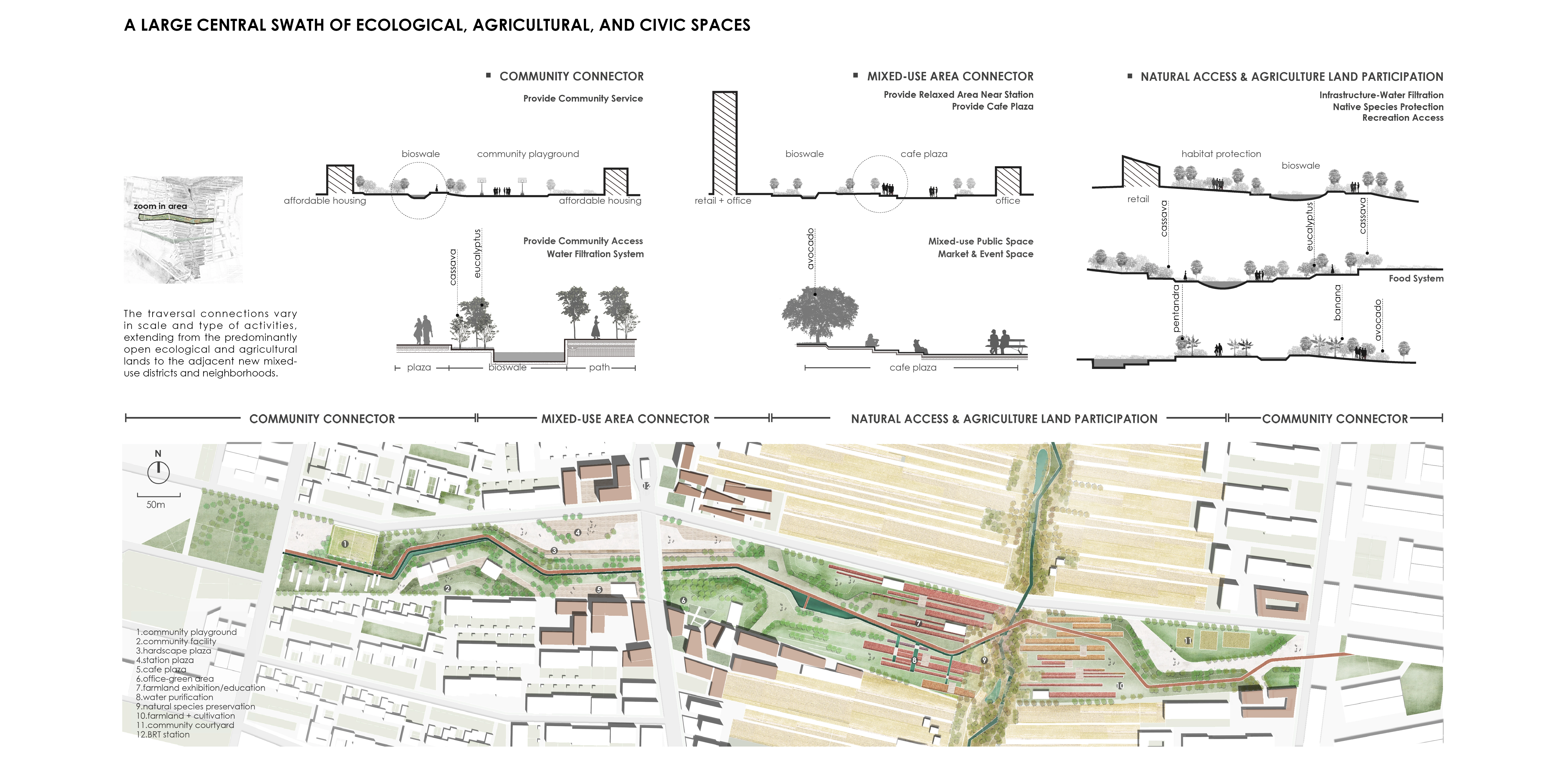 The traversal connections vary in scale and type of activities, extending from the predominantly open ecological and agricultural lands to the adjacent new mixed-use districts to the existing neighborhoods. It is important to mention that such spatial, functional, and social integration is achieved thanks to the presence of the public land and that in conventional real-estate driven urbanism plans usually enacted in the country, the agricultural land would be lost, and the different social groups would not interact.