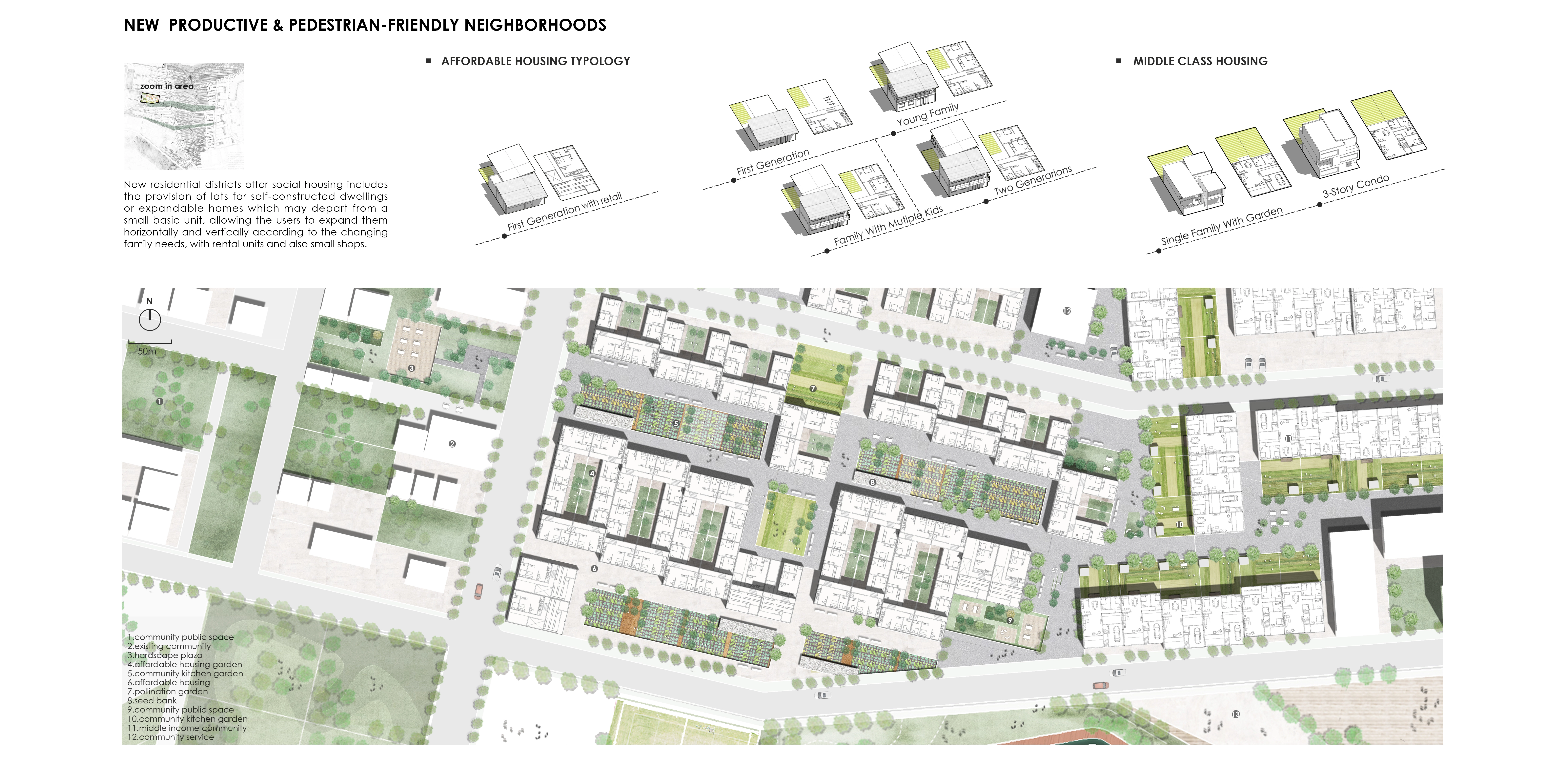Productive and pedestrian-friendly new neighborhoods for different income groups. To the west of then mixed-use corridor, new residential districts offer social housing, particularly for low-income groups. These include the provision of lots for self-constructed dwellings or expandable homes which may depart from a small basic unit, allowing the users to expand them horizontally and vertically according to the changing family needs, accommodating rental units and also small shops. Some areas closer to the mix-used corridor are subsidized low rise formal housing, attracting young professionals, and favoring the social mix.