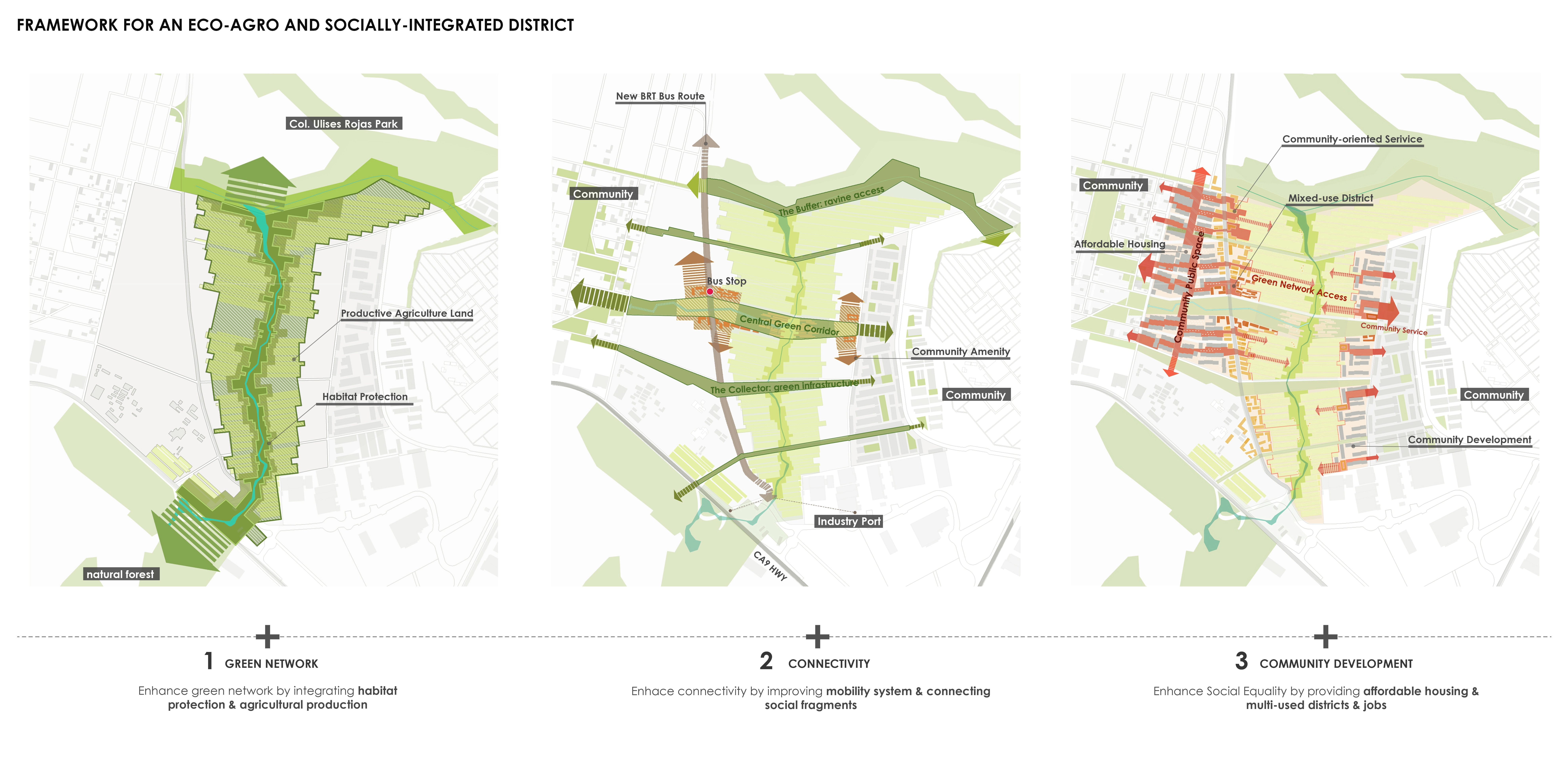 We envision this urban void and the special opportunity to create an ecological and agricultural friendly district, stitching the spatially and socially segregated neighborhoods, reversing the dormitory city conditions and creating new opportunities for economic growth and urban amenities. -
