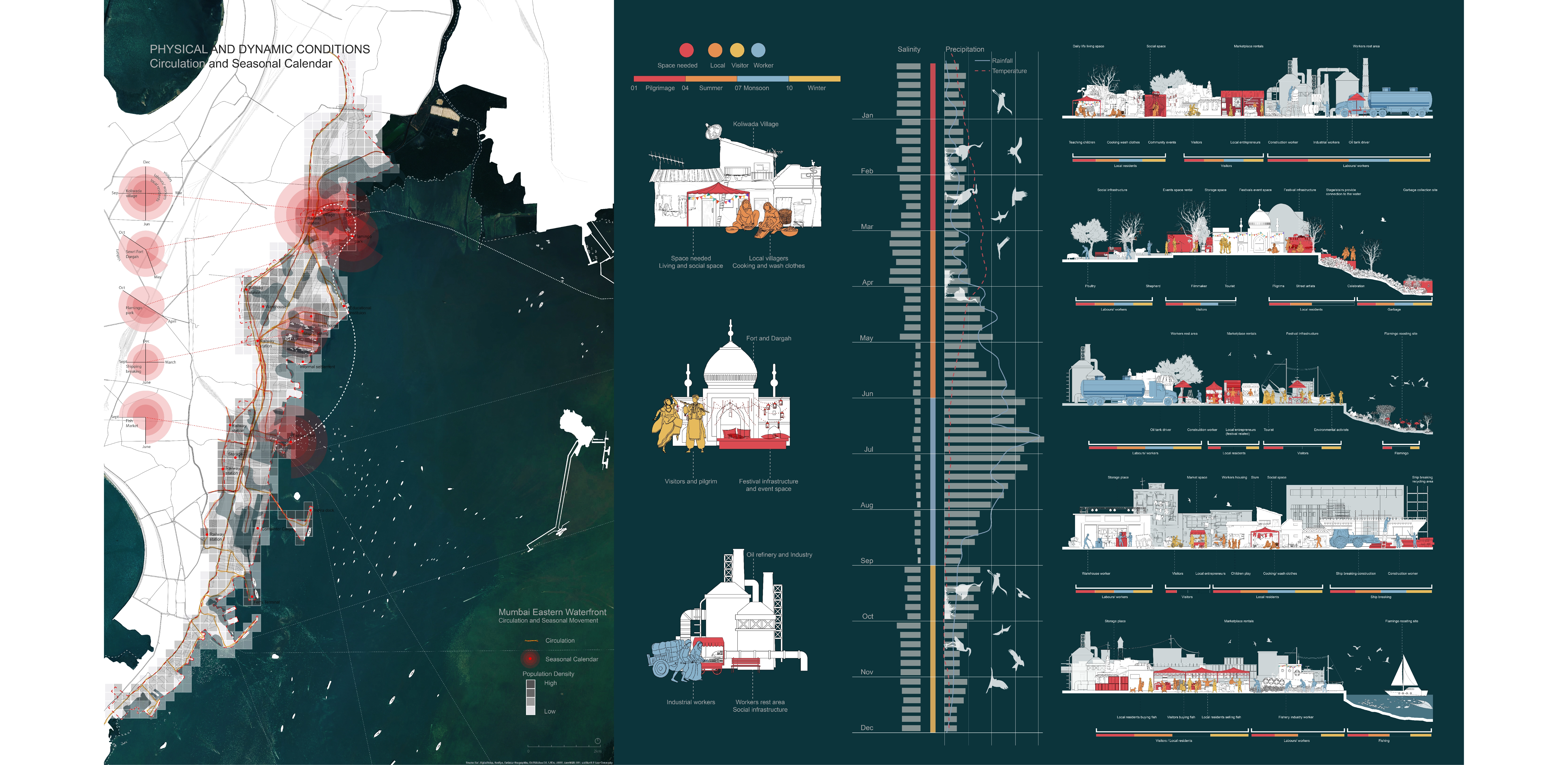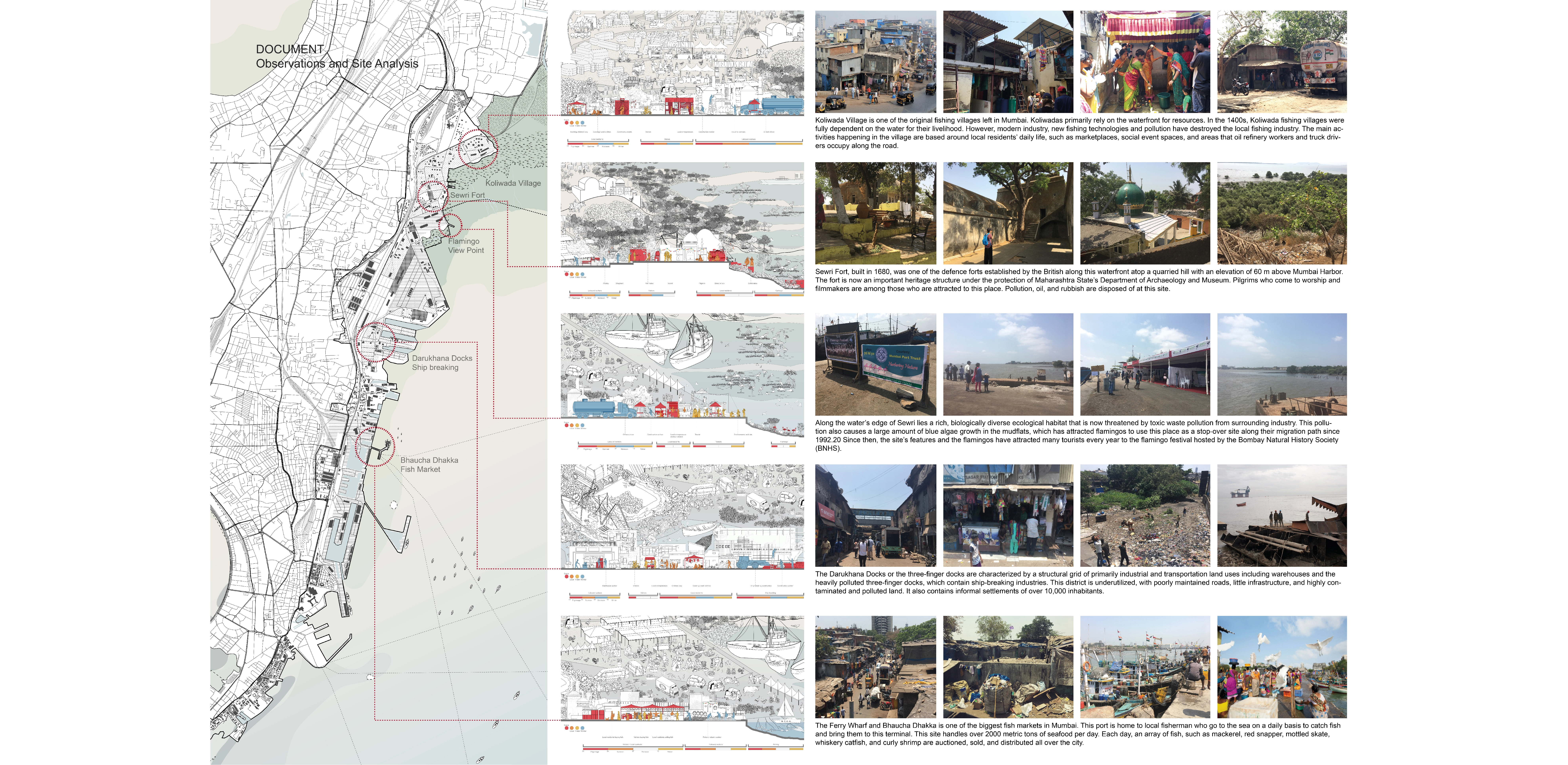 Rapid urbanization and population growth over the last century have resulted in many significant problems and challenges for the Eastern Waterfront of Mumbai. The rapid changes due to industry necessitate adaptive processes while still learning from generations of intimate knowledge with the sea. This project examines Mumbai’s Eastern Waterfront, which has a coexistence relationship with Koliwada village life, the area’s unique ecological habitat, and heavy industry. The project explores a unique form of documentation and captures the complex, dynamic, and intertwined spatial and material relationships of the site. It also recognizes the site’s cultural context and its people’s way of life by introducing a design movement that builds on indigenous and vernacular infrastructure to generate sustainable, resistant, and nature-based technology. The project aims to rethink and reconsider the land’s interface with the water, which plays an important role in the villagers’ livelihood and cultural and spiritual practices.