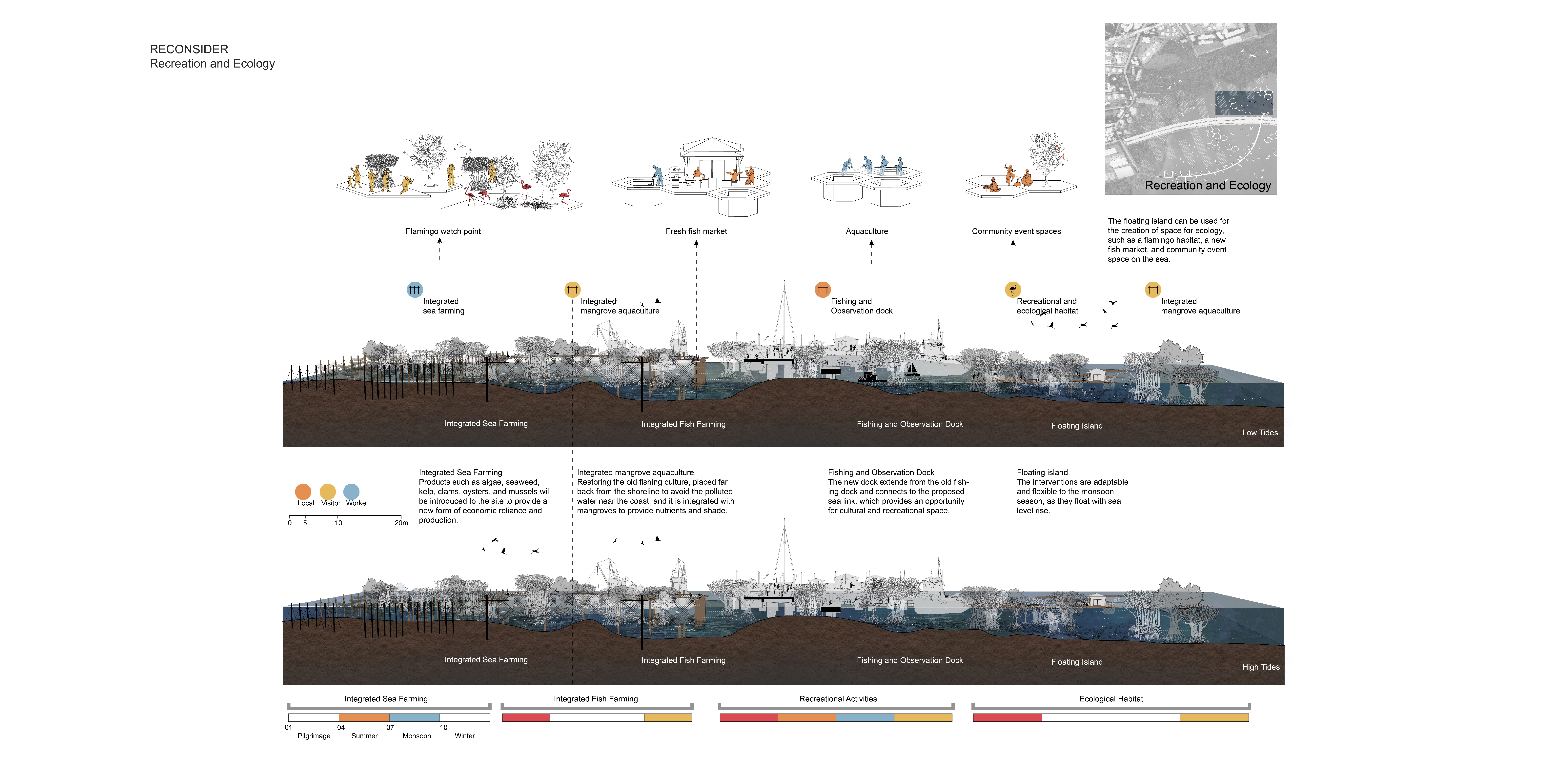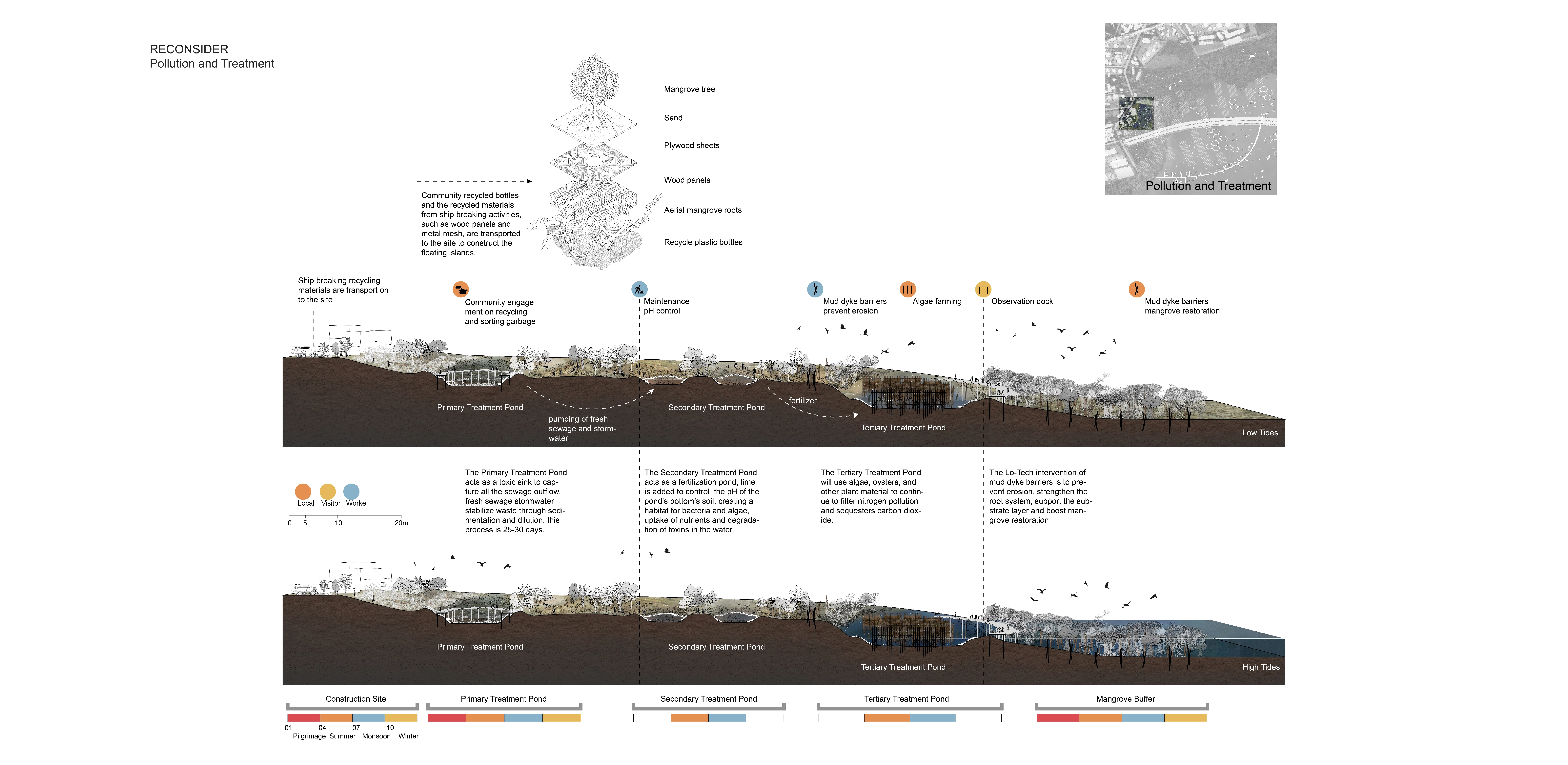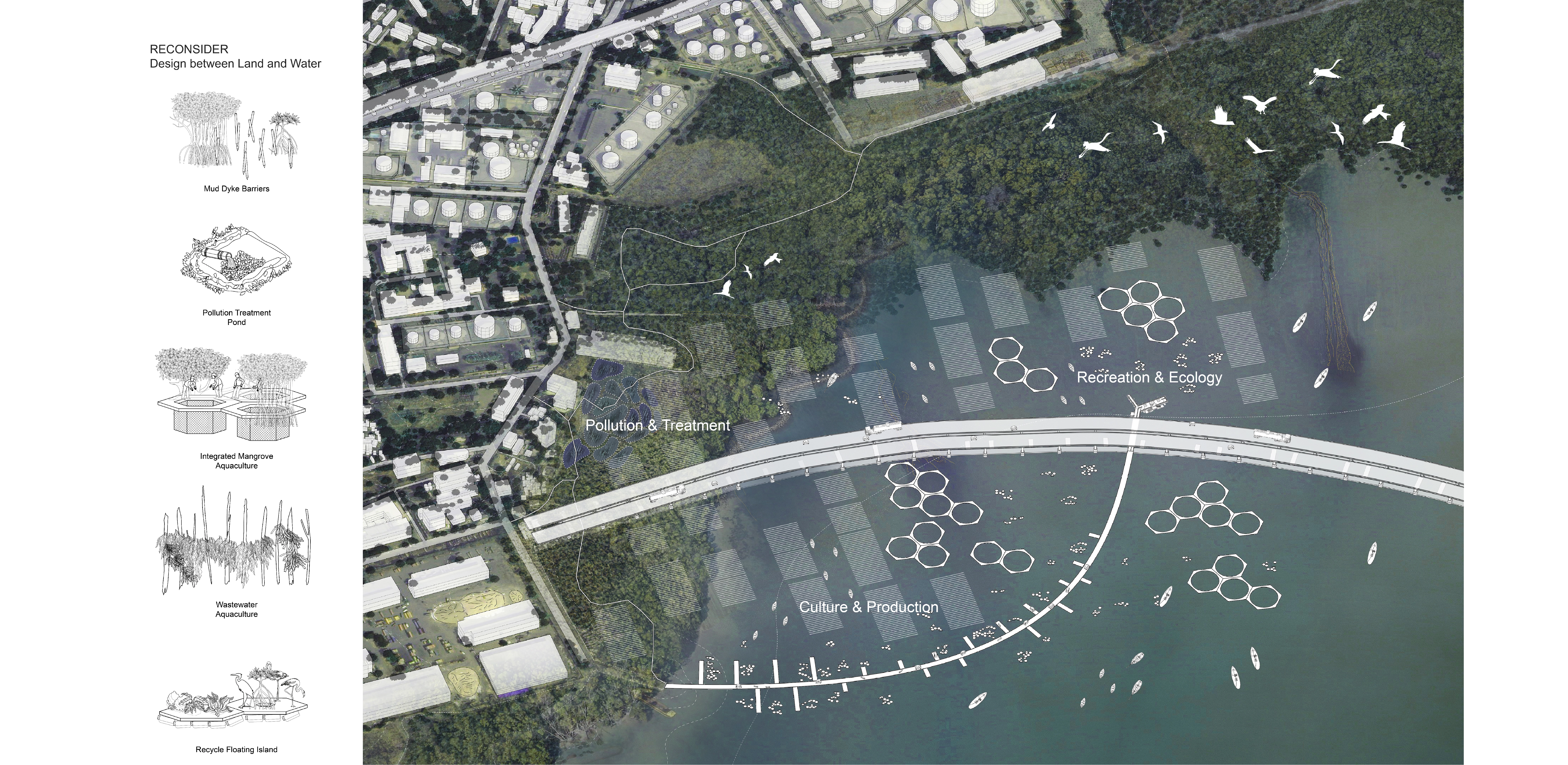 In response to the current issues, the design explores a series of lo-tech interventions used to rethink the shoreline through pollution and treatment, culture and production, and recreation and ecology. The first phase is to create a buffer along the shoreline by inserting a mud dyke barrier to prevent erosion as well as to restore the mangroves. The second phase involves providing wastewater treatment at the outflow area through aquaculture and algae farming while taking advantage of pollutants to introduce a new form of economic reliance and to use wastewater as a resource for aquaculture production. The integrated mangrove aquaculture provides opportunities to create a network of fish farms within the mangrove to provide nutrients for the fish and shelter for fishing. Further, a new place for gathering should be built by extending the existing dock, and a series of floating islands made of recycled materials that are adaptable and flexible to the monsoon season should be created.