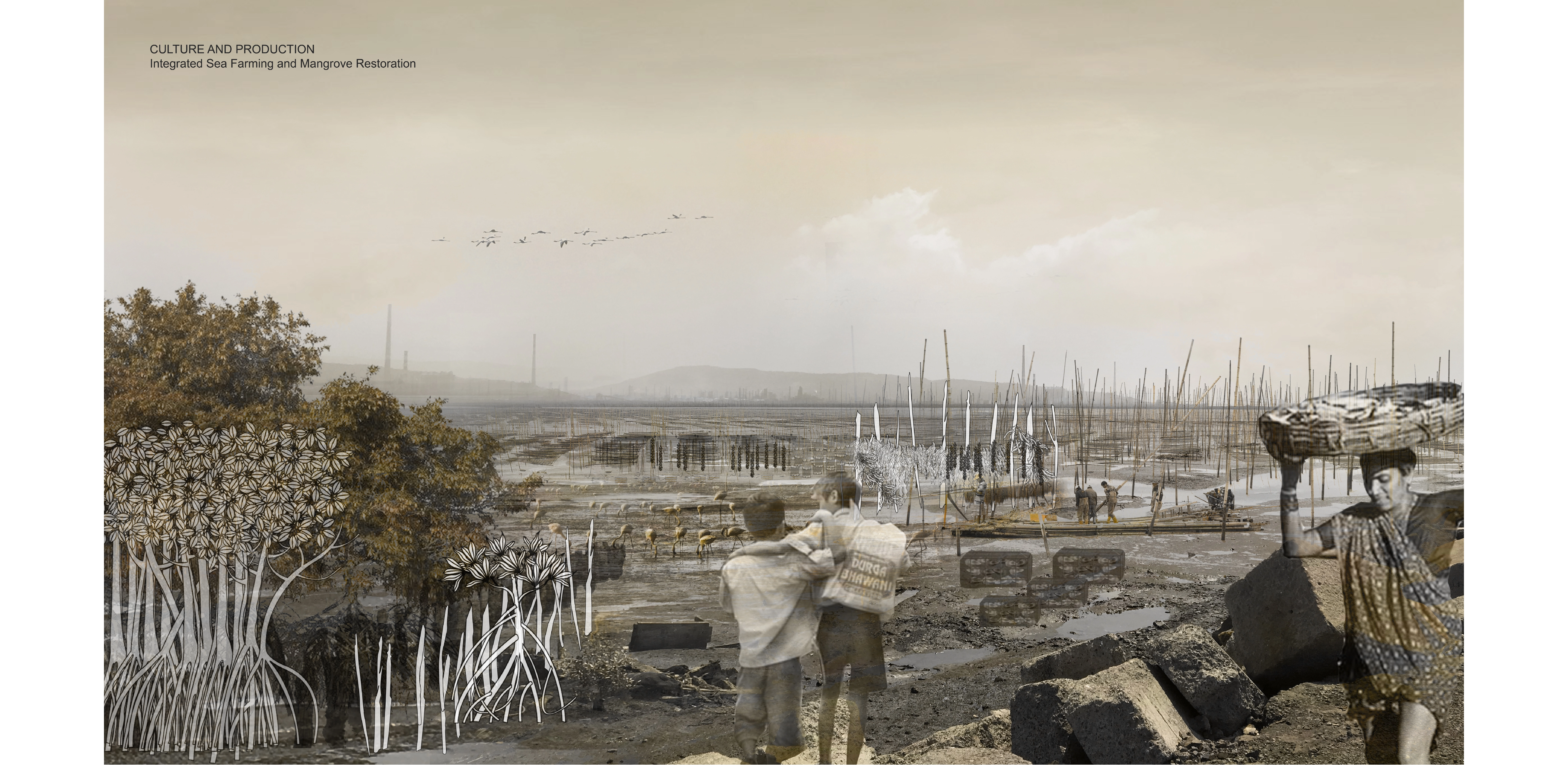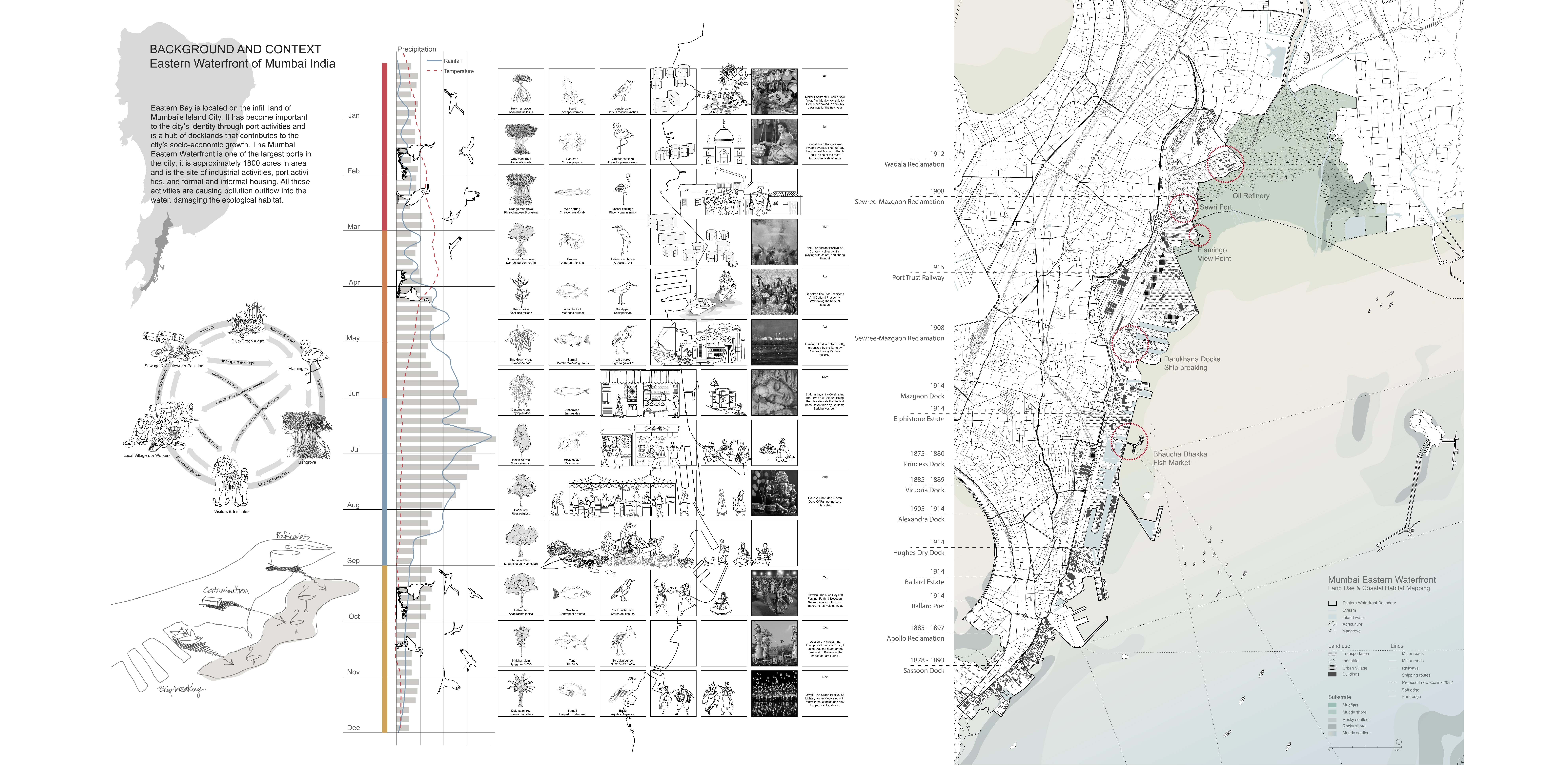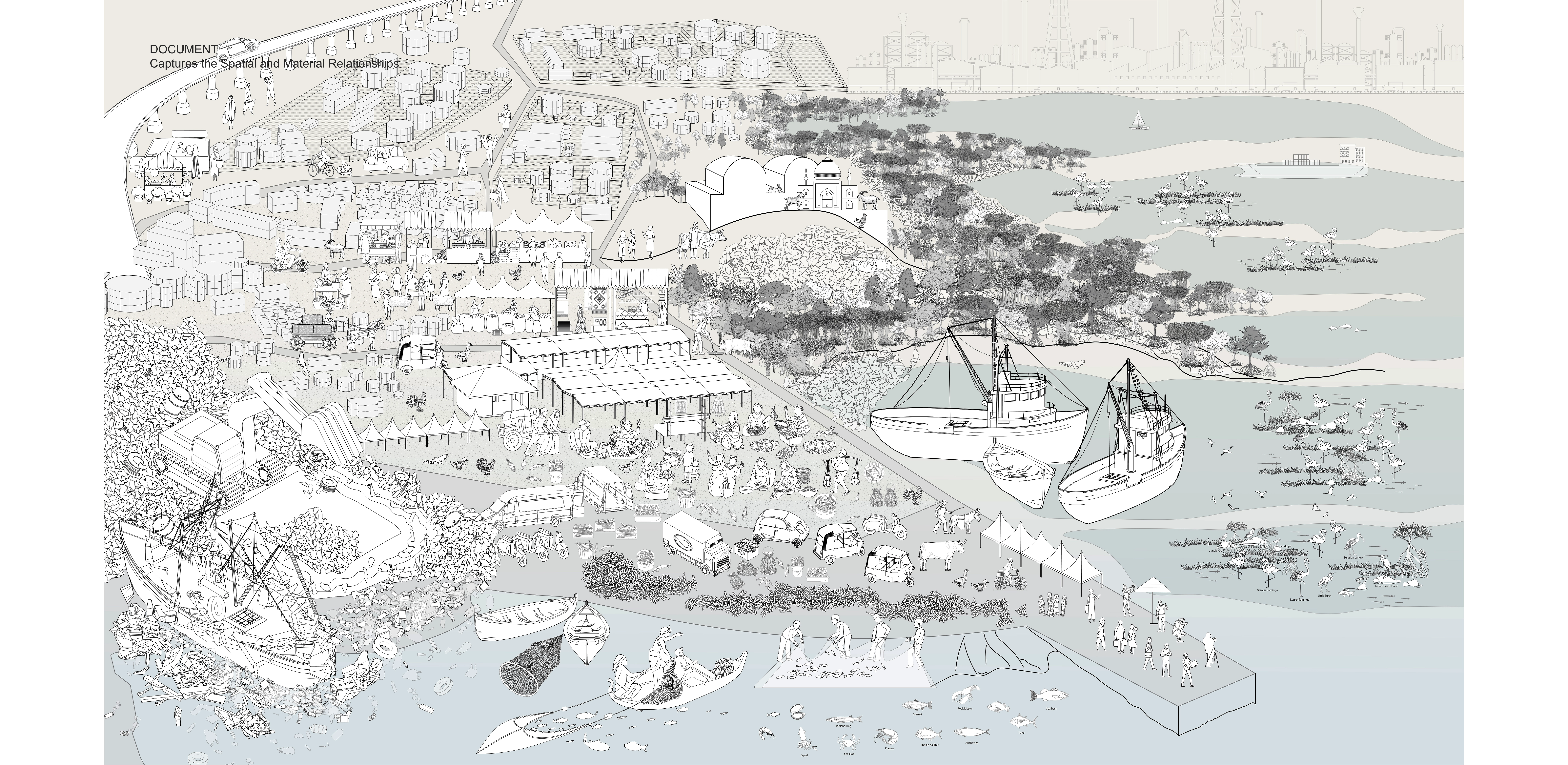 Mumbai’s eastern harbor is characterized by jarring juxtapositions of flamingo habitats and maritime wreckage, or historic fishing villages and petroleum plants. This proposal aims to harvest and repurpose buoyant waste materials into floating islands that would enable aquatic farming and become flamingo habitats, propelling newfound commitment to the waterfront. Industrial pollution causes blue algal blooms, upon which the flamingos feed, yet the pollution harms other marine growth. A design that recognizes the many local cultural conventions encourages new mangroves and pollution treatment ponds, which would serve multiple purposes, such as reducing toxins while promoting aquaculture that would continue to sustain nearby fisherfolk.