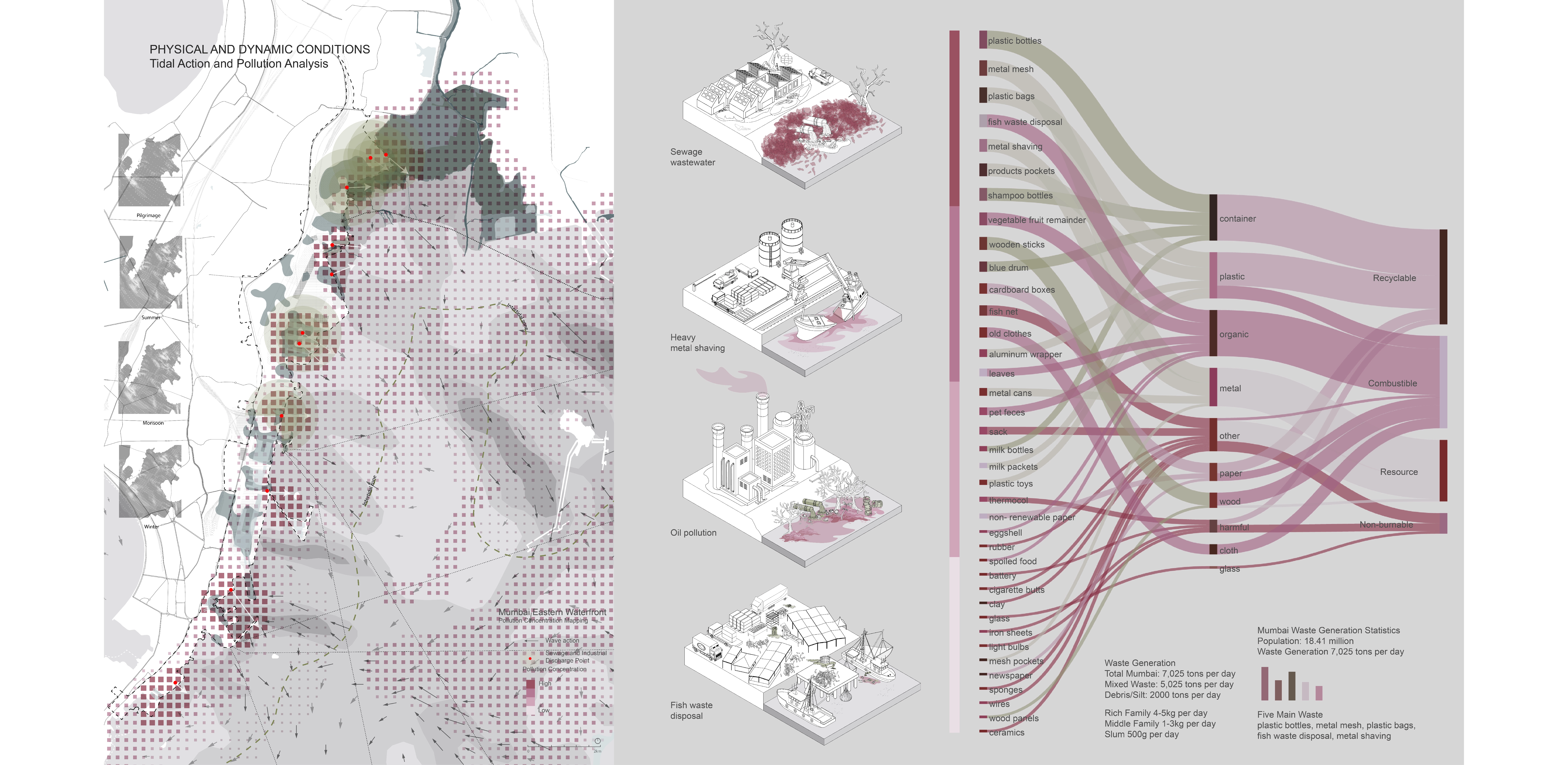 The Mumbai Eastern Waterfront is one of the largest ports in the city; it is approximately 1800 acres in area and is the site of industrial activities, port activities, and formal and informal housing. All these activities are causing pollution outflow into the water, damaging the ecological habitat.