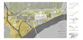 • Phase 1 – The master plan establishes hedgerows along the major transit corridors (including railway) first. This allows Detroit the “biggest intervention bang for the buck” while immediately providing inhabitants pedestrian and bike amenities nestled within the protective hedgerows. The corridors also strategically connect Delray to pre-existing, healthy civic assets surrounding the neighborhoods, such as nearby Clark Park and several public schools. Phytoremediation begins for a pilot housing program sited northeast, away from the customs plaza and major industrial polluters.