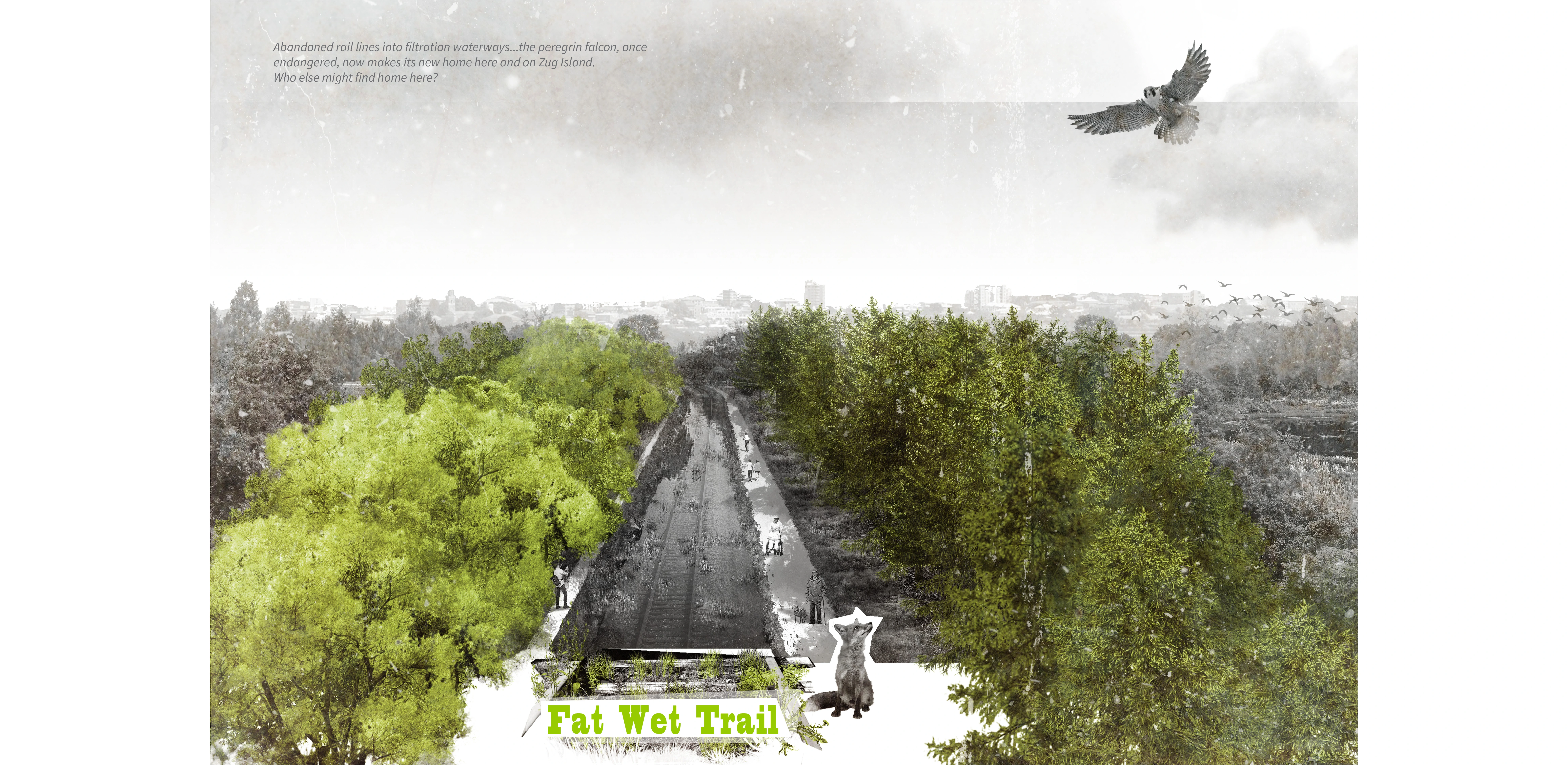 • Fat-Wet Trail hedgerow – Planted forms and species that recall pre-settlement Detroit larch swamps. Targets the disused railway that runs from Delray’s central active railway toward the Detroit River