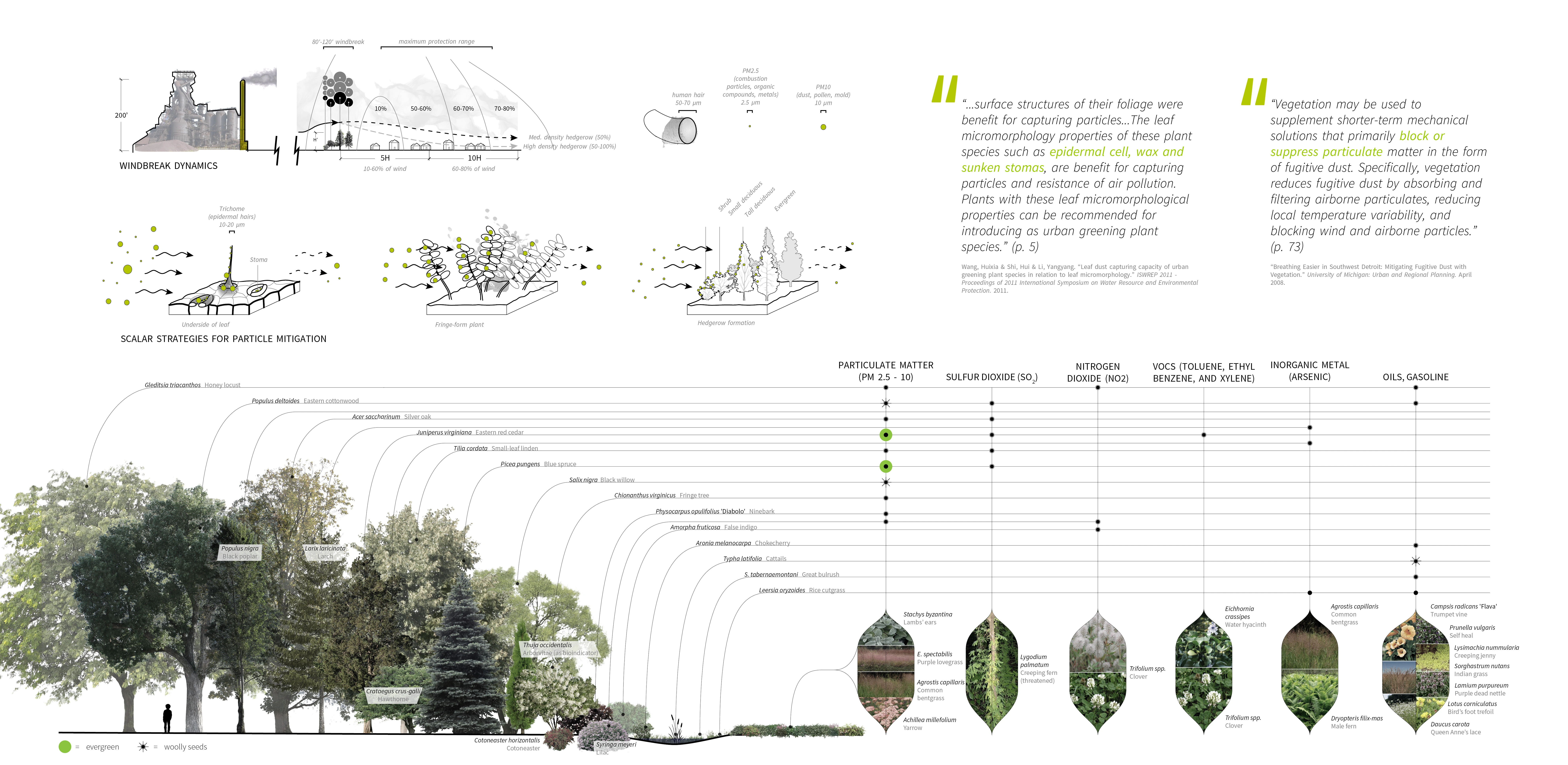 Air pollution drift is the biggest and most immediate health hazard in Delray. To address this problem, the green infrastructure uses a multi-scalar strategy. On the macro-scale, the urban form with the most promise is the windbreak hedgerow, which consists of shrub, understory, and tall canopy layers. The plan’s hedgerows act as thick filtration and enrichment corridors that stitch together the disparate land uses in Delray. The neighborhood’s tight parcels and corridor-dominant spaces lend themselves to 5 landscape prototypes: