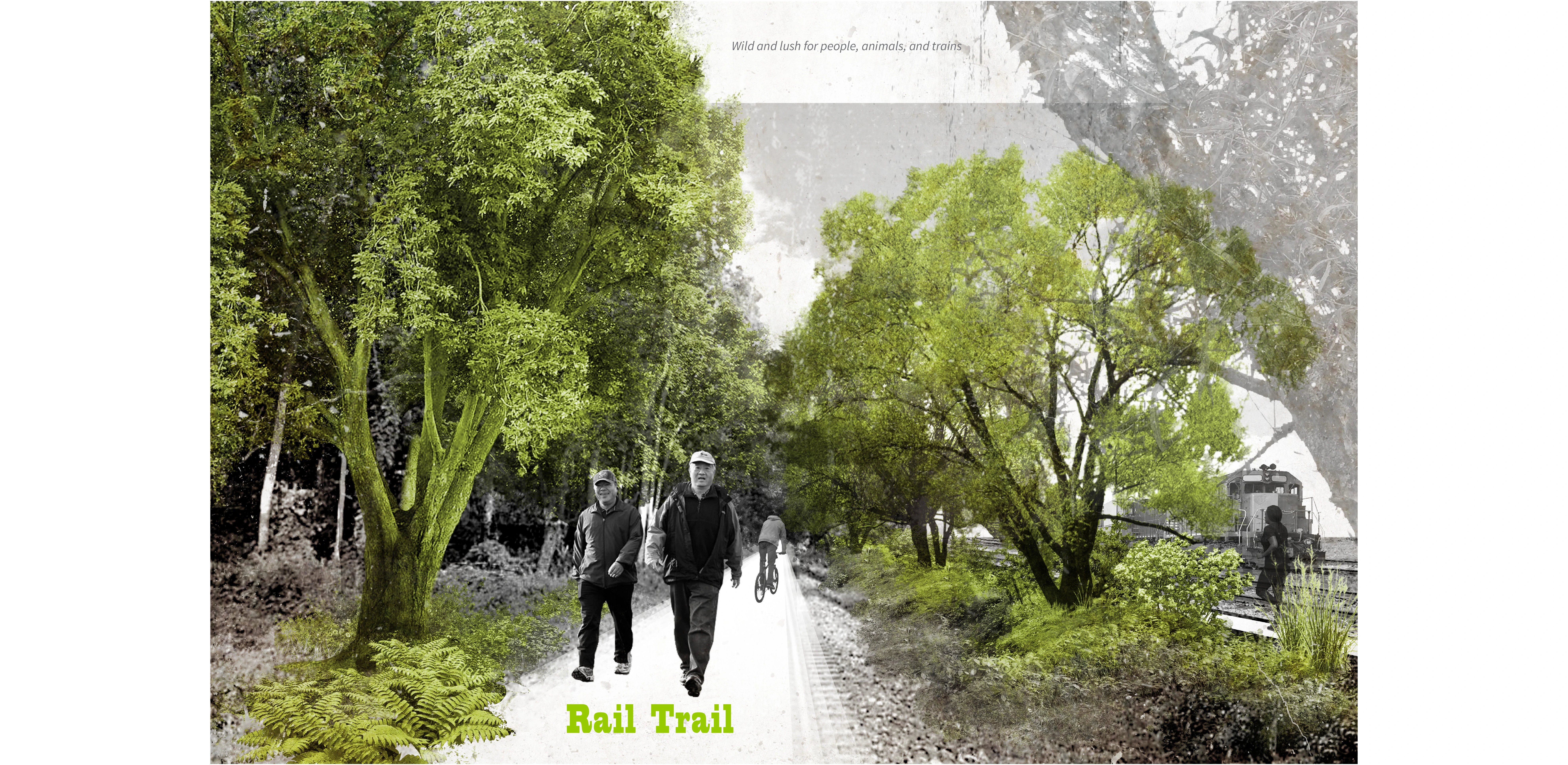 • Rail Trail hedgerow – Irregular and “wild” forms that fill in awkward gaps along railways while providing a relaxing sense of “being away” from the city. Targets active railway corridors and creates waterways during flood events (mimicking historic marsh water channels)