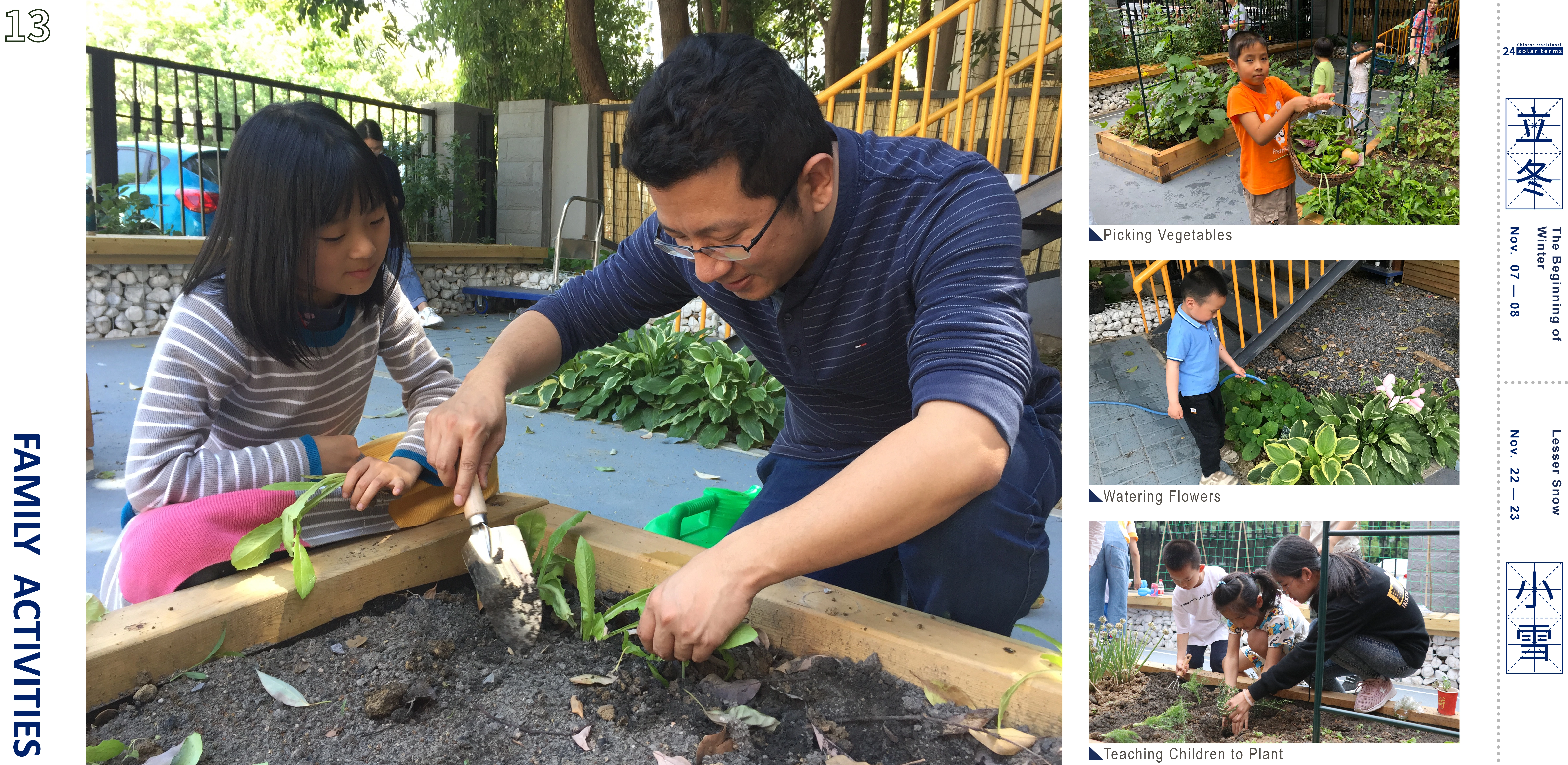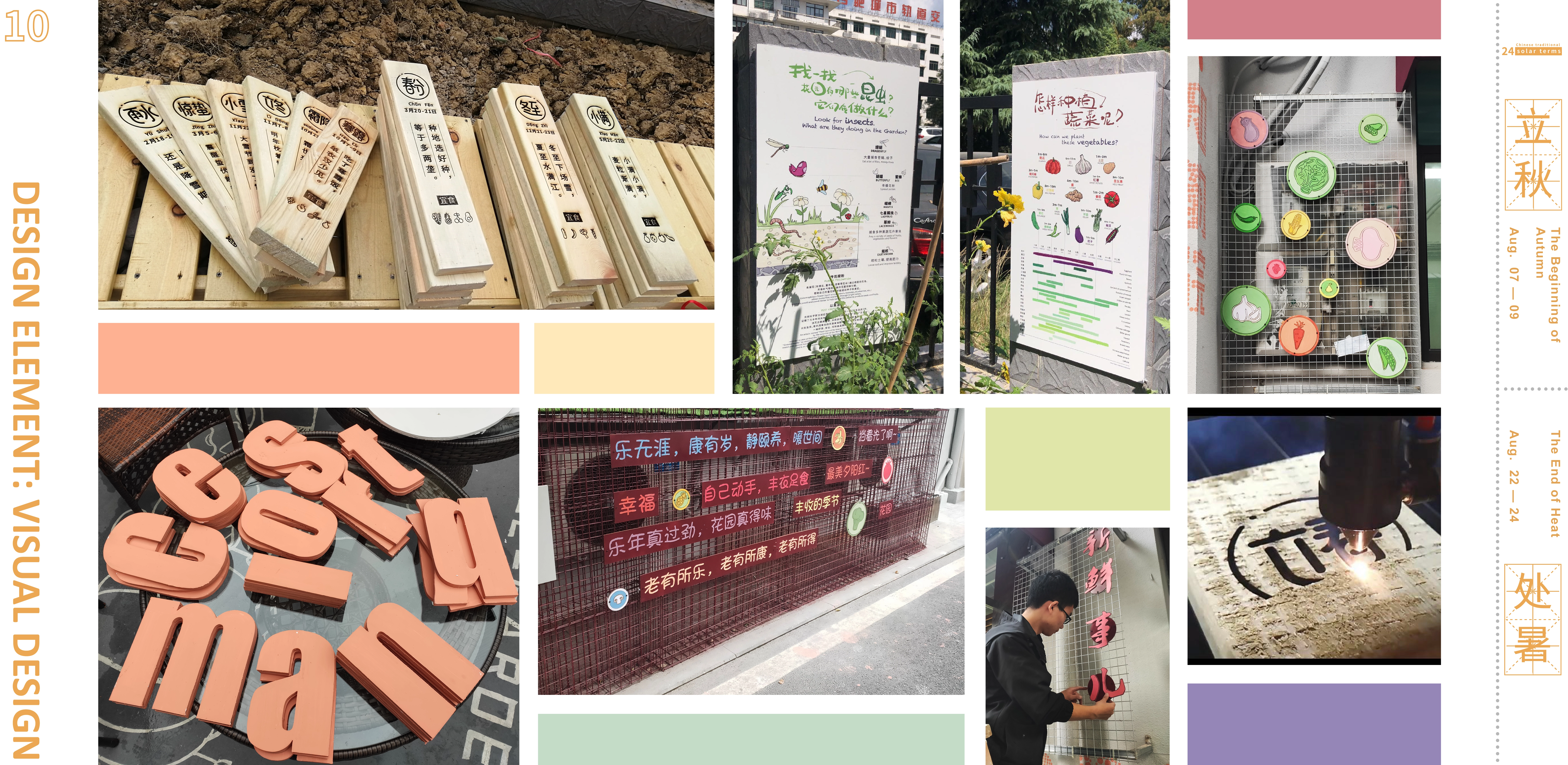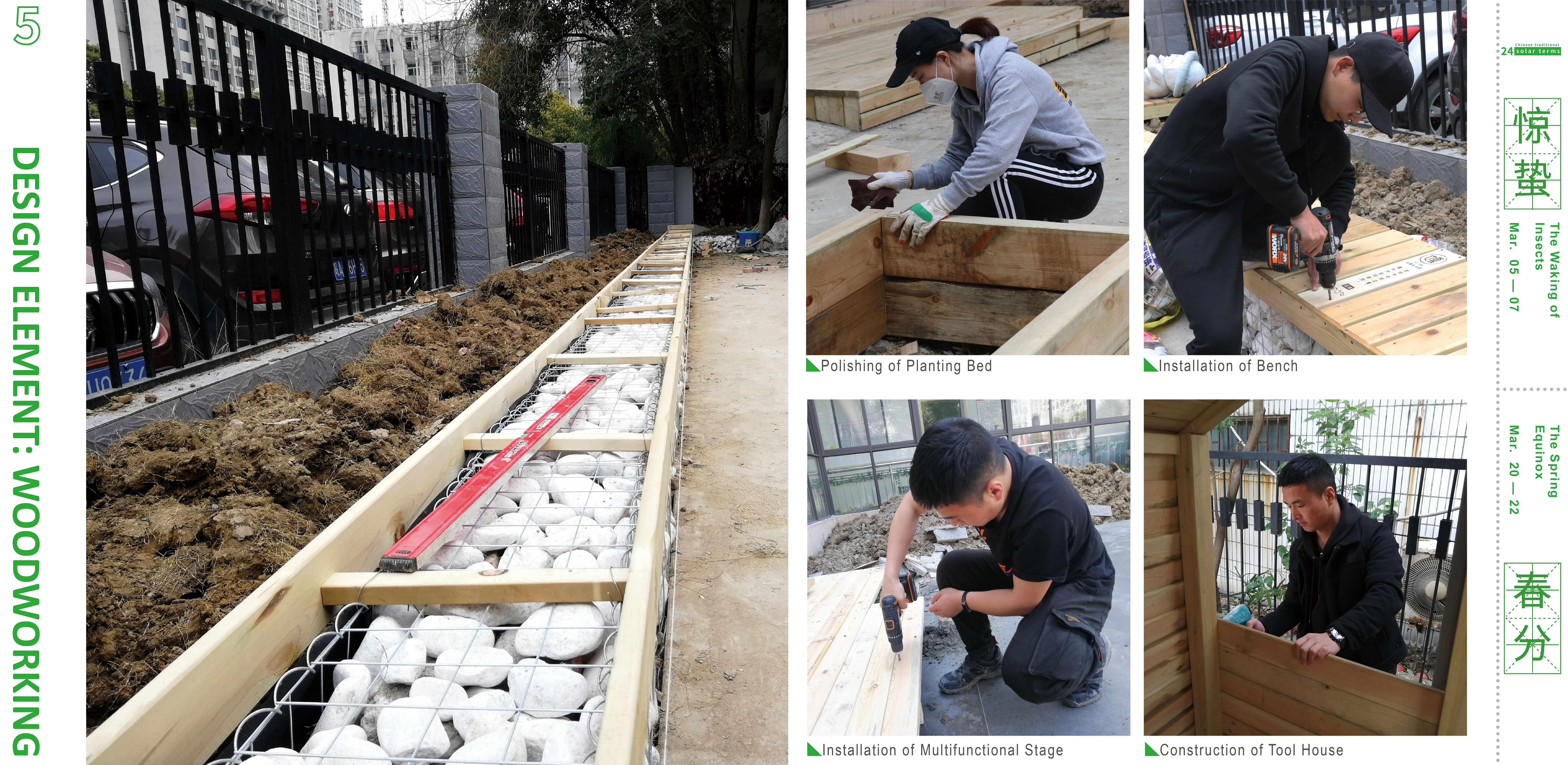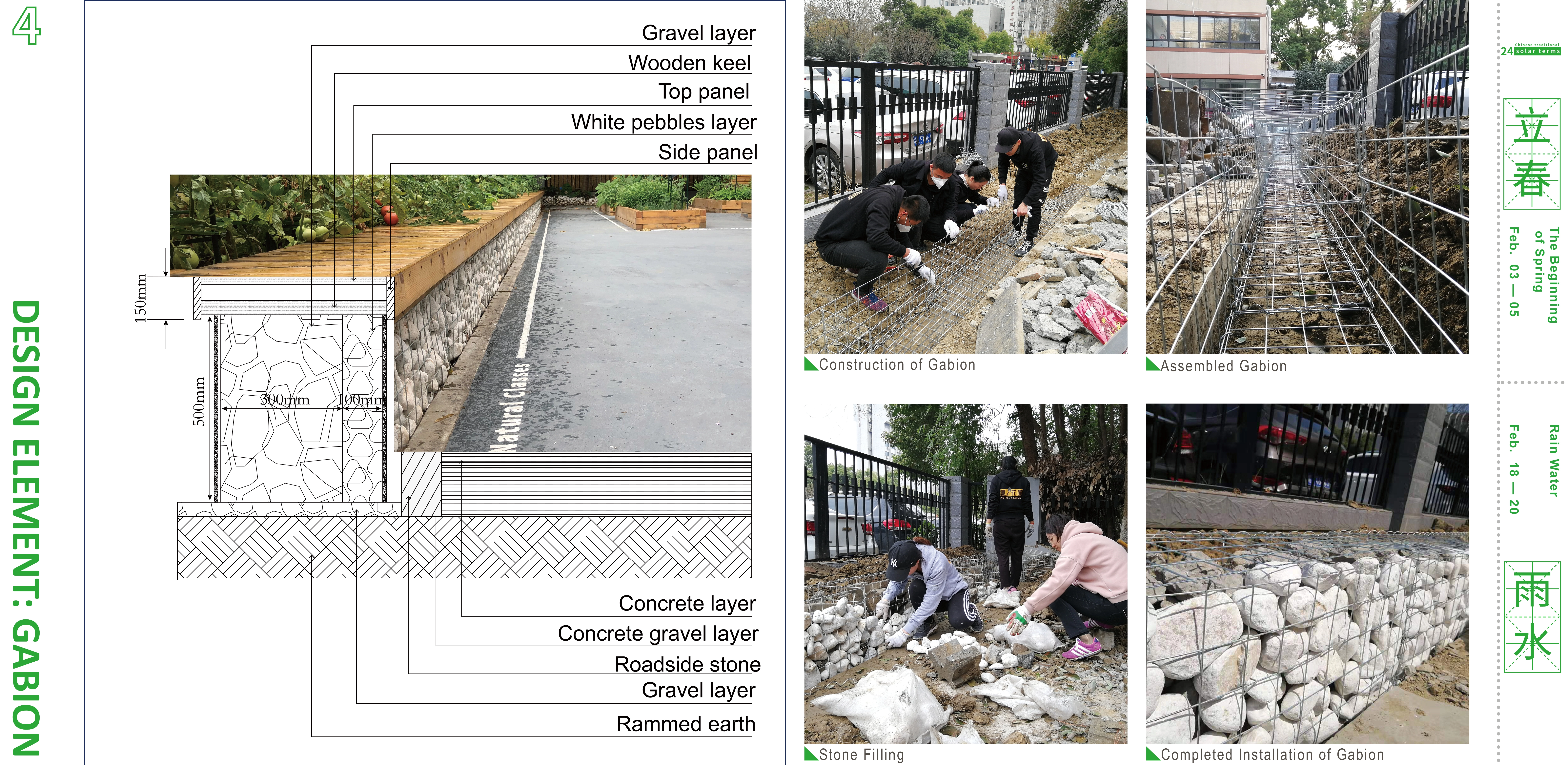 Nature Classroom: The nature classroom is a high planting bed surrounded by gabion benches, on the wooden panel of which the details of Chinese “Twenty-Four Solar Terms” were carved out. Those terms embody Chinese traditional knowledge and social practice developed through observation of the sun's annual motion, and served as a time-frame for agricultural activities. The bulletin board on the fences visually display information about succession planting, and knowledge of soil and insects.