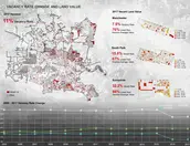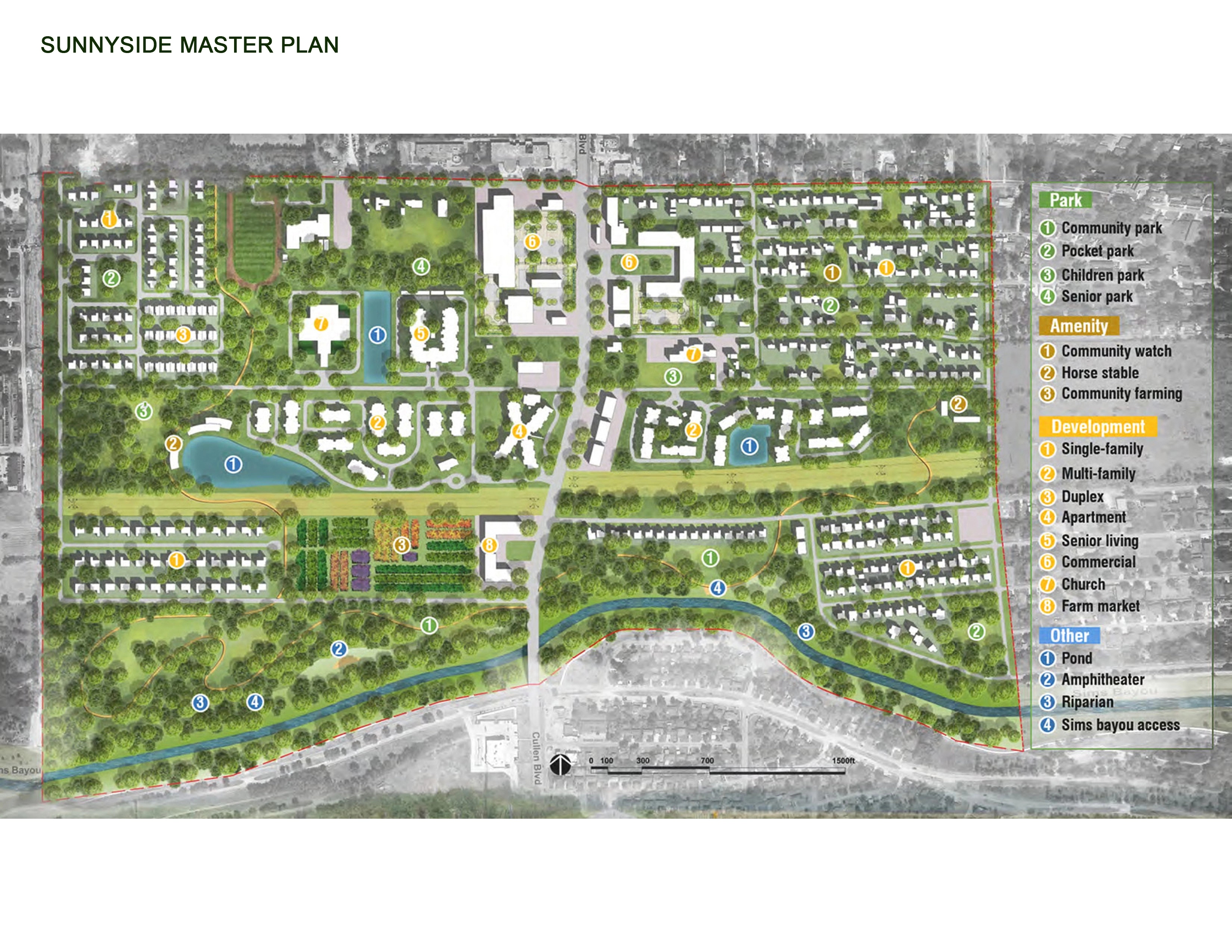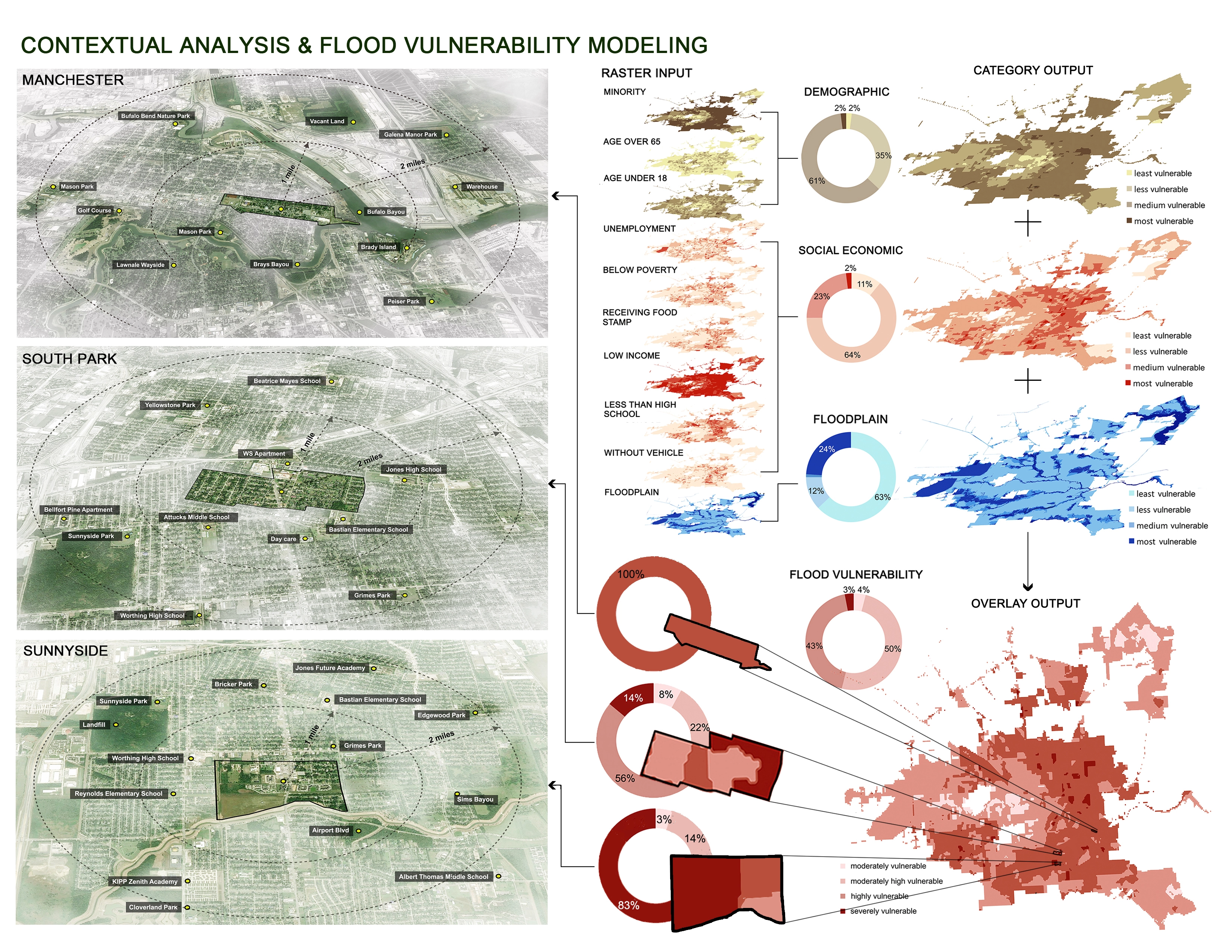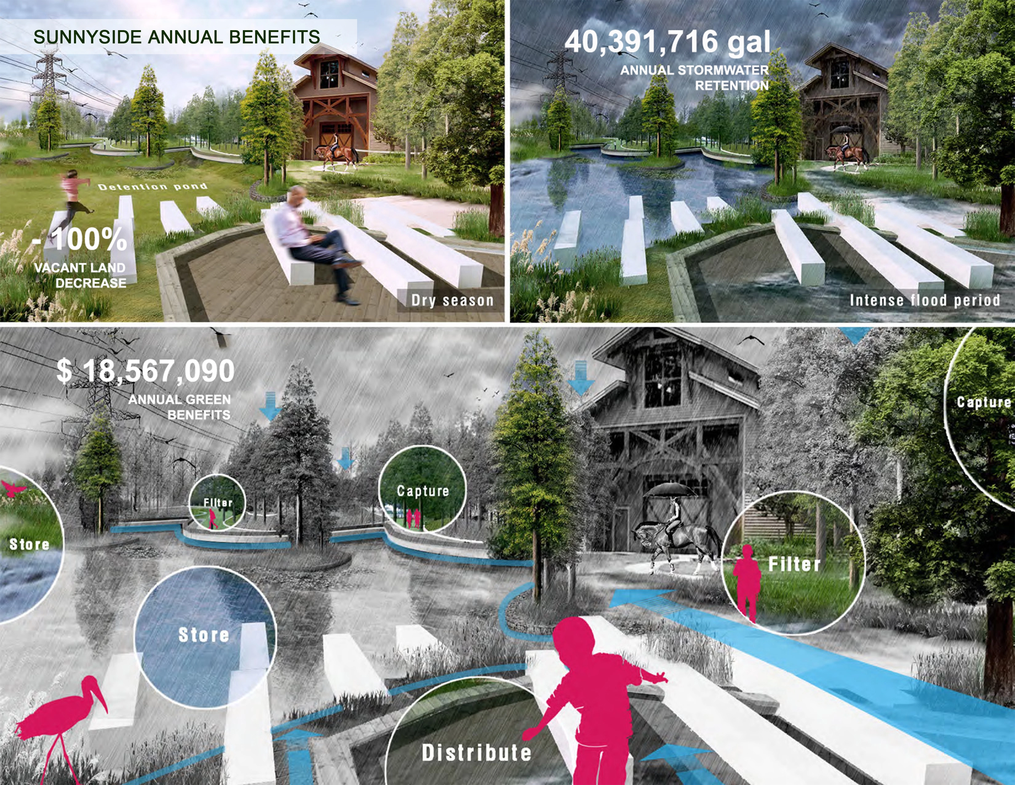 Sunnyside is Houston’s oldest African-American neighborhood. It has one of the most socially vulnerable populations in the region and is currently 93% minority with many residents making less than $25,000 annually (U.S. Census, 2010). Due to ineffective engineered infrastructure, Sunnyside is severely impacted by large rainfall events. Fifty percent of the design site is within the 100-year floodplain. In order to avoid flooding, new construction in the site is built at a higher elevation, leading to increased flooding for existing housing. The GVC calculations show that overall, the ability of the proposed plan to capture runoff volume increased from 49.6% to 190.7%. One-hundred and forty-three acres of vacant space was regenerated, four times more walkable space was created, and dense canopy coverage increased from 23.9% to 39.8%.