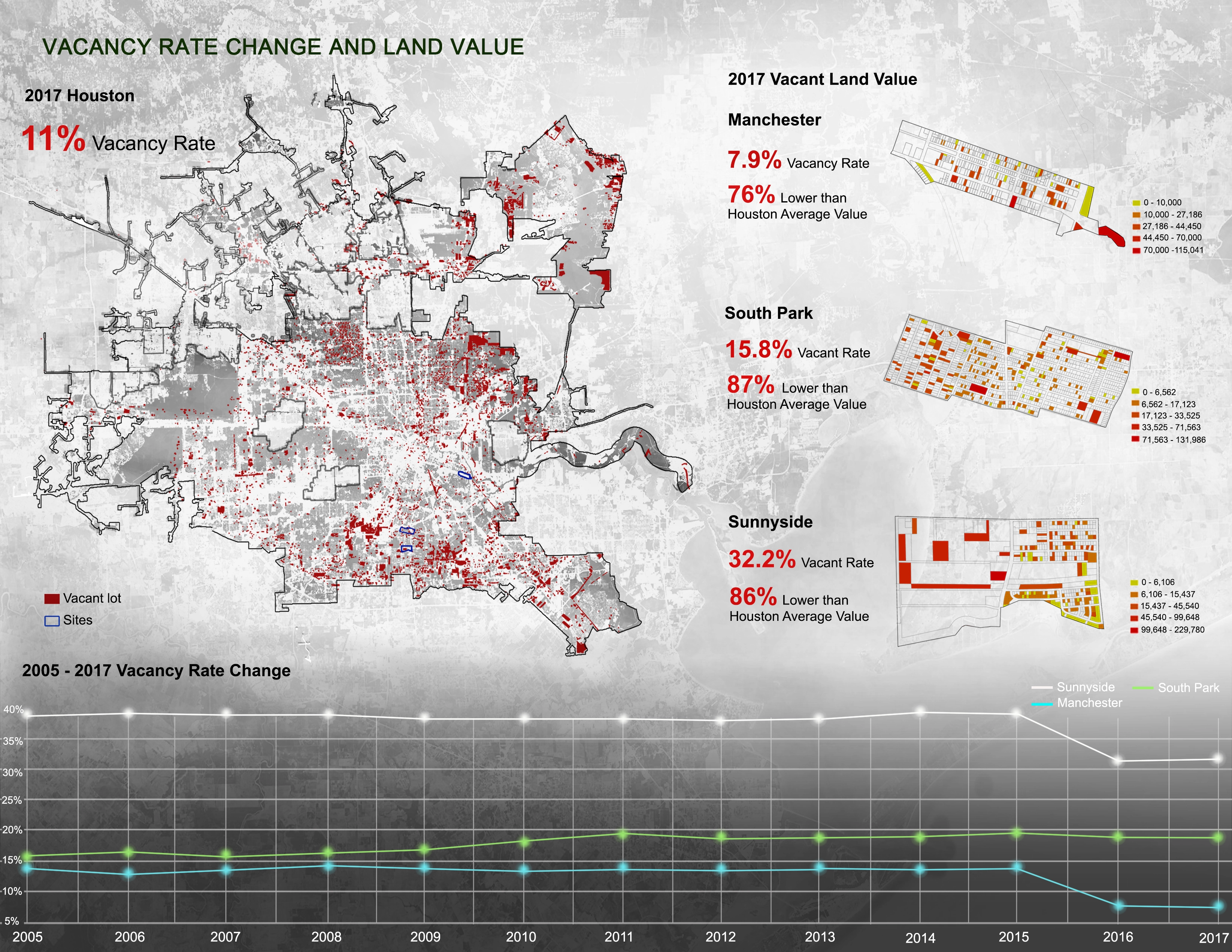 Vacant land is a ubiquitous urban phenomenon (Pagano and Bowman, 2000). Small amounts of vacant lots can indicate healthy economic growth while larger proportions typically indicate urban decline (Hollander, 2010). Nearly 17% of each large U.S. cities’ land area is vacant, and this amount has increased by 1.3% since 1998 (Newman et al., 2016). When a flood disaster strikes, vacancies catapult (Ross 2013). The Texas coast is one of the most frequently impacted areas by flood disaster events globally. Houston, TX has one of the highest numbers of flood-related fatalities in the past 50 years (Highfield et al., 2013). From 2001 to 2017, Harris County incurred nearly 20 billion dollars in flood-related damages, including Hurricane Harvey. During Harvey, downtown Houston received 27 trillion gallons of rainwater (van Oldenborgh, 2017). Despite being one of the fastest growing cities in the U.S., Houston reports nearly 11% of its land as vacant (Newman et al., 2017). Many of the vacant properties are concentrated in marginalized communities, which are also more highly vulnerable to flooding than affluent communities (Sohn et al., 2014; Berke, 2015).