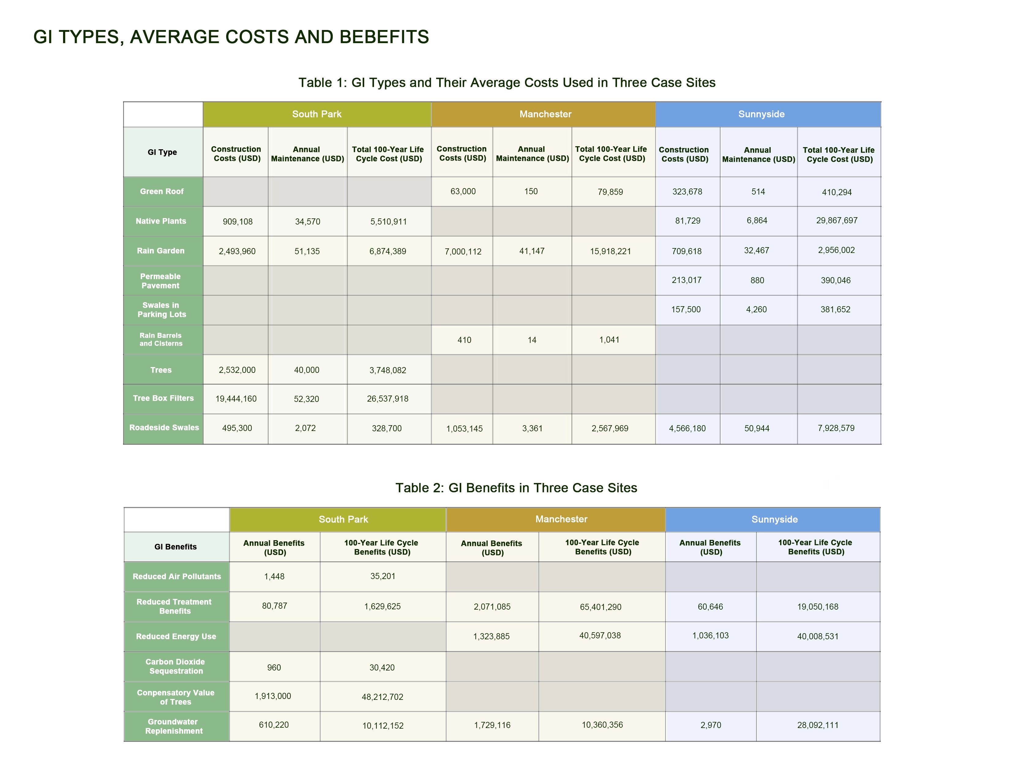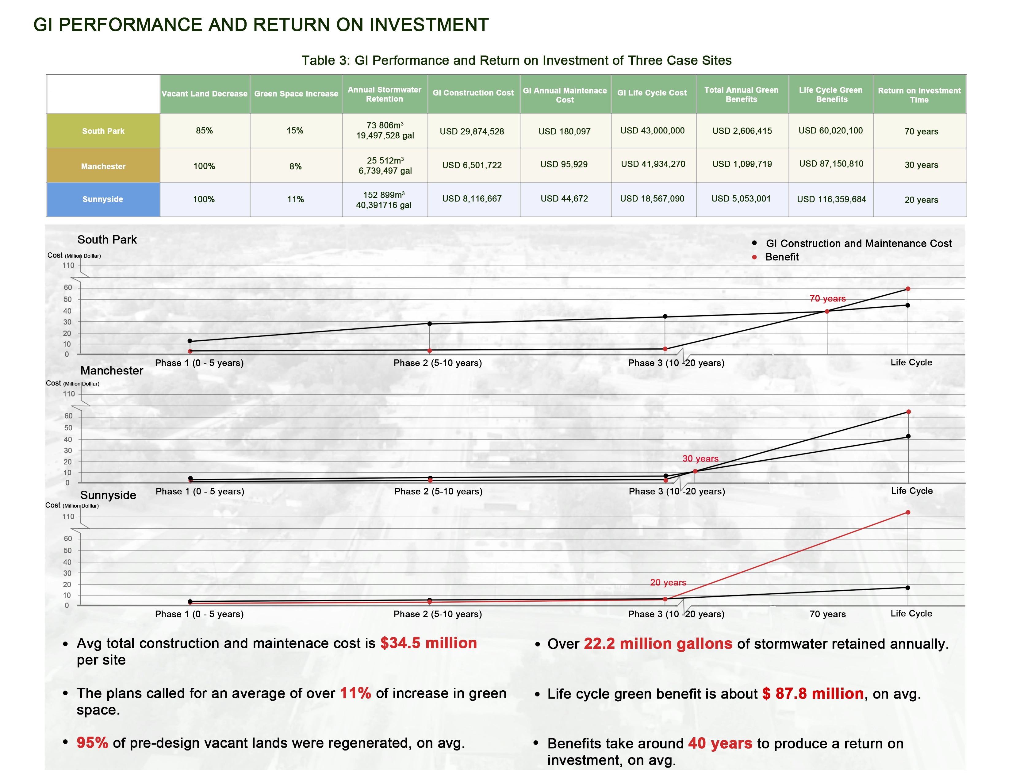 This research determined the economic costs and benefits of retrofitting GI into underserved communities as a strategy for vacant land regeneration. Results show that, first, the ability to regenerate vacant properties is much easily performed. In fact, 95% of pre-design vacant lands were regenerated, on average, across all three sites. Because a large proportion of the repurposed vacant properties were not based on developmental pursuits, but GI, there is still room for development in these areas in the future if needed. The green spaces can provide temporary or permanent functions to assist with social or hydrological needs. Second, this increase in green space significantly assists in increasing stormwater retention. Across all sites, the plans called for an average of over 11% of increase in green space. This resulted in over 22.2 million gallons of stormwater retained annually. Third, the economic benefits created by this increase in green space and GI over a 100-year life cycle greatly outweigh the upfront construction and maintenance costs. With an average total cost (including construction and maintenance) of 34.5 million dollars but an 87.8 million dollar economic benefit across all three sites, findings suggest over 53 million more produced in life cycle benefits than upfront costs. These benefits generally take around 40 years to produce a return on investment. Construction costs appear to claim a bulk of the overall cost total. Green roofs have the highest overall costs to construct while rain gardens provide the most benefits for the least amount of cost efficiency. Costs are higher upfront, so marginalized communities will need to seek additional funding and phase in such projects. However, when using GI to assist in regenerating vacant properties, flood risk is shown to continually decrease. Also, while upfront economic costs increase in the short term, the long-term return on investment is much higher and the GI pays itself off through time. -