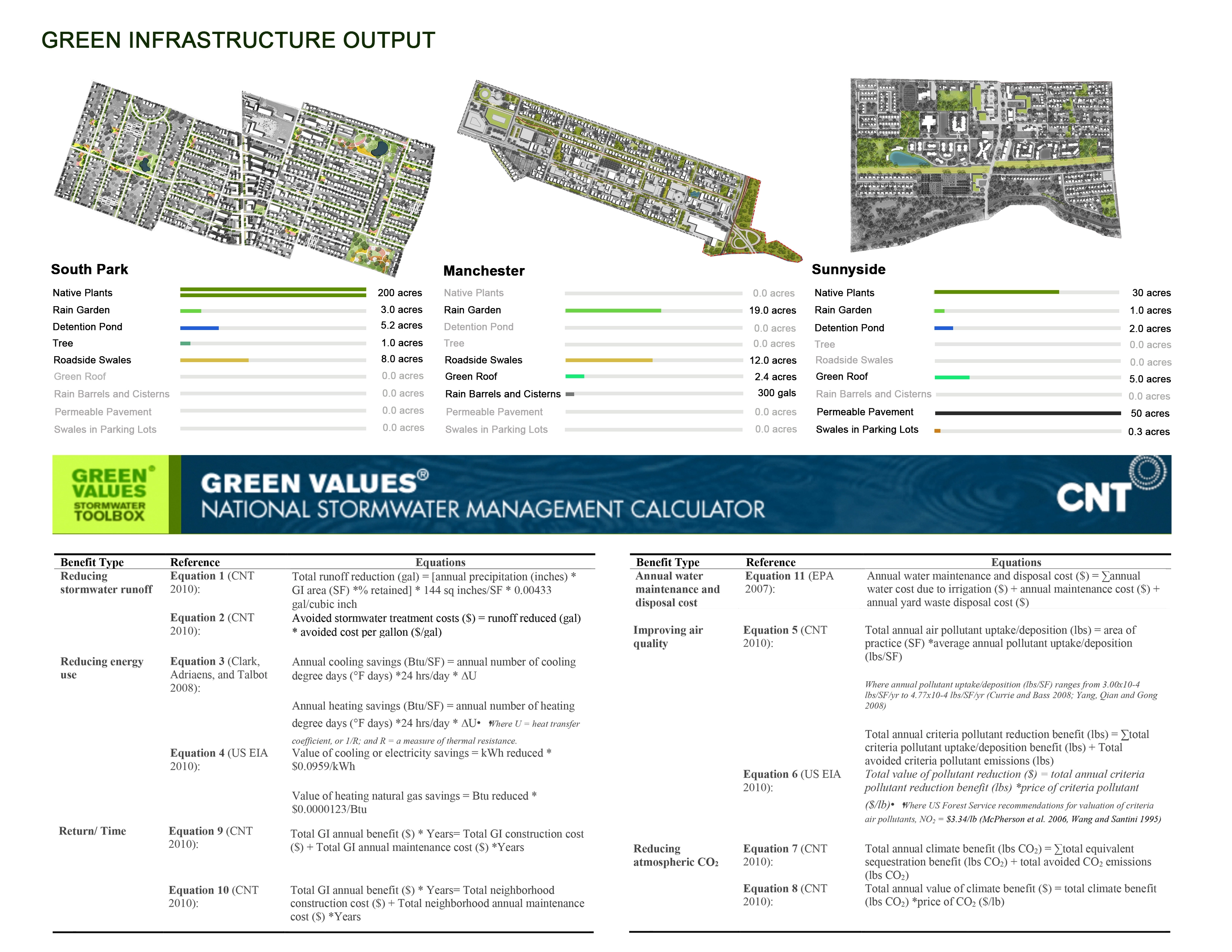 Manchester is surrounded by industries, and has one of the highest river impairments and lowest water qualities in the state. Local authorities provide sightseeing ventures named ‘Toxic Tours’ for visitors to raise awareness of the serious conditions in the neighborhood (Newman et al., 2016). Manchester has a large number of undocumented Hispanic immigrants and 1/3 of the residents live below poverty line (U.S. Census, 2010). The site is composed of 16% vacant parcels/abandoned structures; 68% of the neighborhood’s surface is currently impervious. After the plan is implemented, a majority of the existing underutilized parcels project to be regenerated. The amount of green space increases to nearly 7 times its current amount while the percentage of pervious surface increases from 36% to 51%. According to the GVC, over 40 million gallons of stormwater can be retained annually, with over $5,000,000.00 of annual green benefits generated from the GI.
