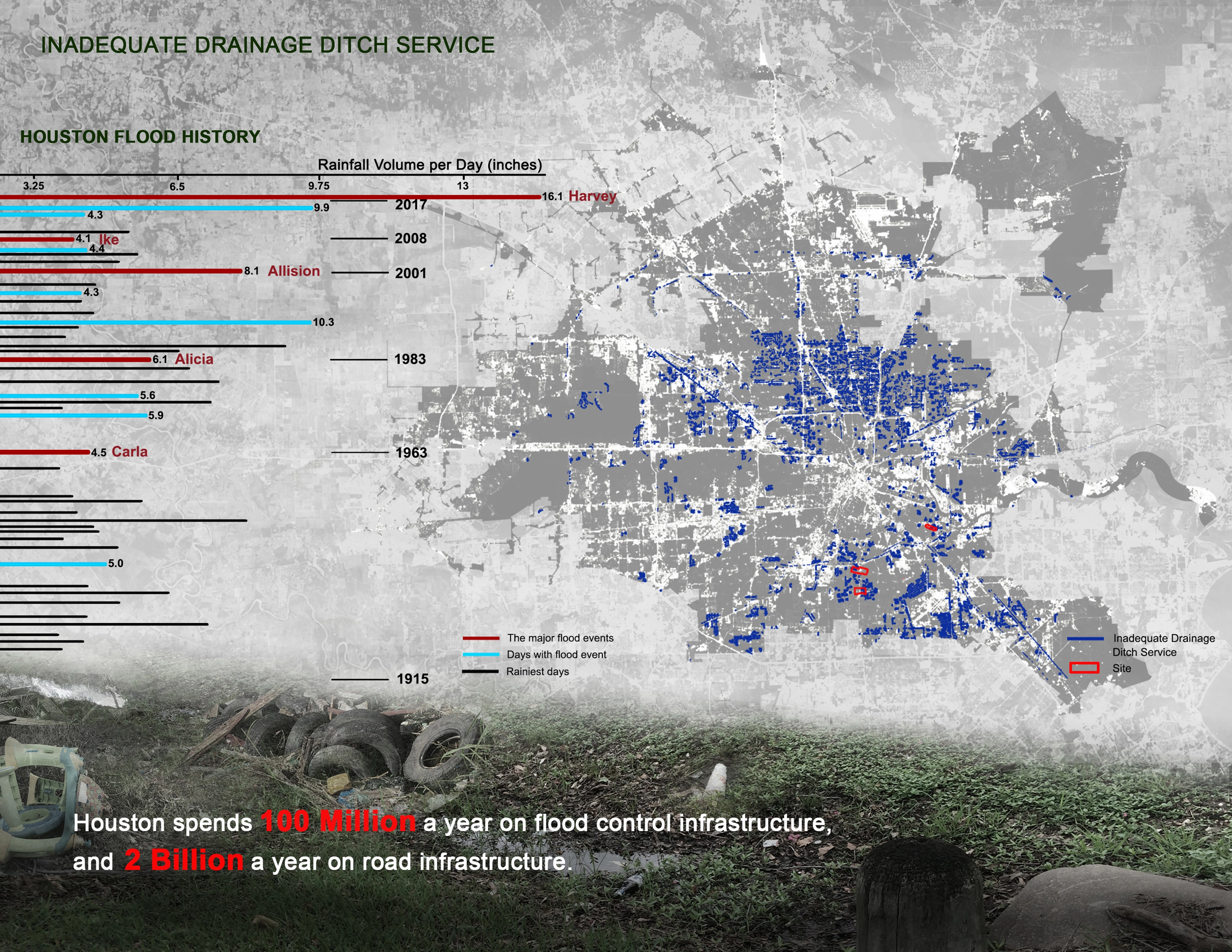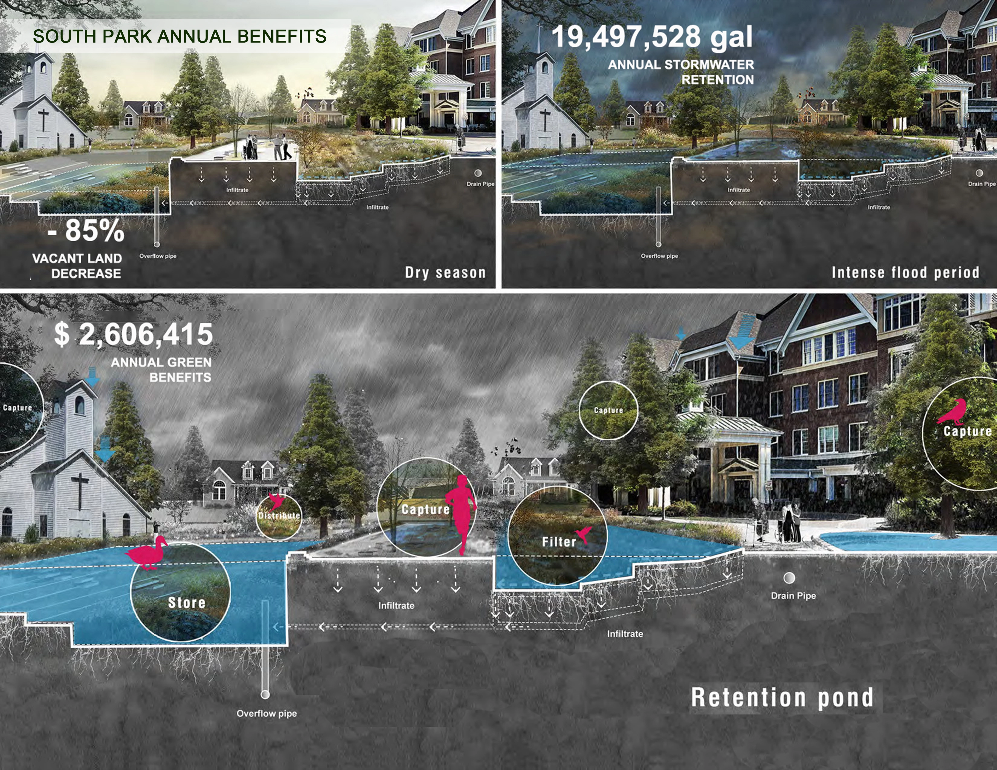 South Park, one of Houston’s oldest African-American neighborhoods, connects to the Gulf of Mexico, making it highly vulnerable to floods. Most of the flooding in South Park during Harvey occurred because of ineffective and outdated open ditch drainage infrastructure, not from bayou overtopping. During Hurricane Harvey, over 1/4 of the related flooding was outside the 100-year flood plain (van Oldenborgh, 2017). High vacancy rates have been a long-term problem in South Park. While the vacancy rate of Houston decreased from 20% to 11% from 2006 to 2017, South Park maintained a vacancy rate near 16%. Currently, a majority of its vacant lots have remained vacant for more than 3 years. The land value in these neighborhoods is 85% lower than the Houston average and 51% lower than Houston median. Also, over 90% of the residents are minority and 30% do not have high school degree. The plan, according to the GVC, projects that 85% of the site’s existing vacant lots will be regenerated and 90% of existing abandoned structures will be managed. Fifteen percent of the vacant properties will be regenerated into GI and 17 acres of new GI will be added. The GVC shows that this plan increases the permeable area by 15% and captures more than 45% of the runoff volume. Simultaneously, the design can capture 65,687,253ft3 of runoff, creating $2,606,415 in annual green benefits.