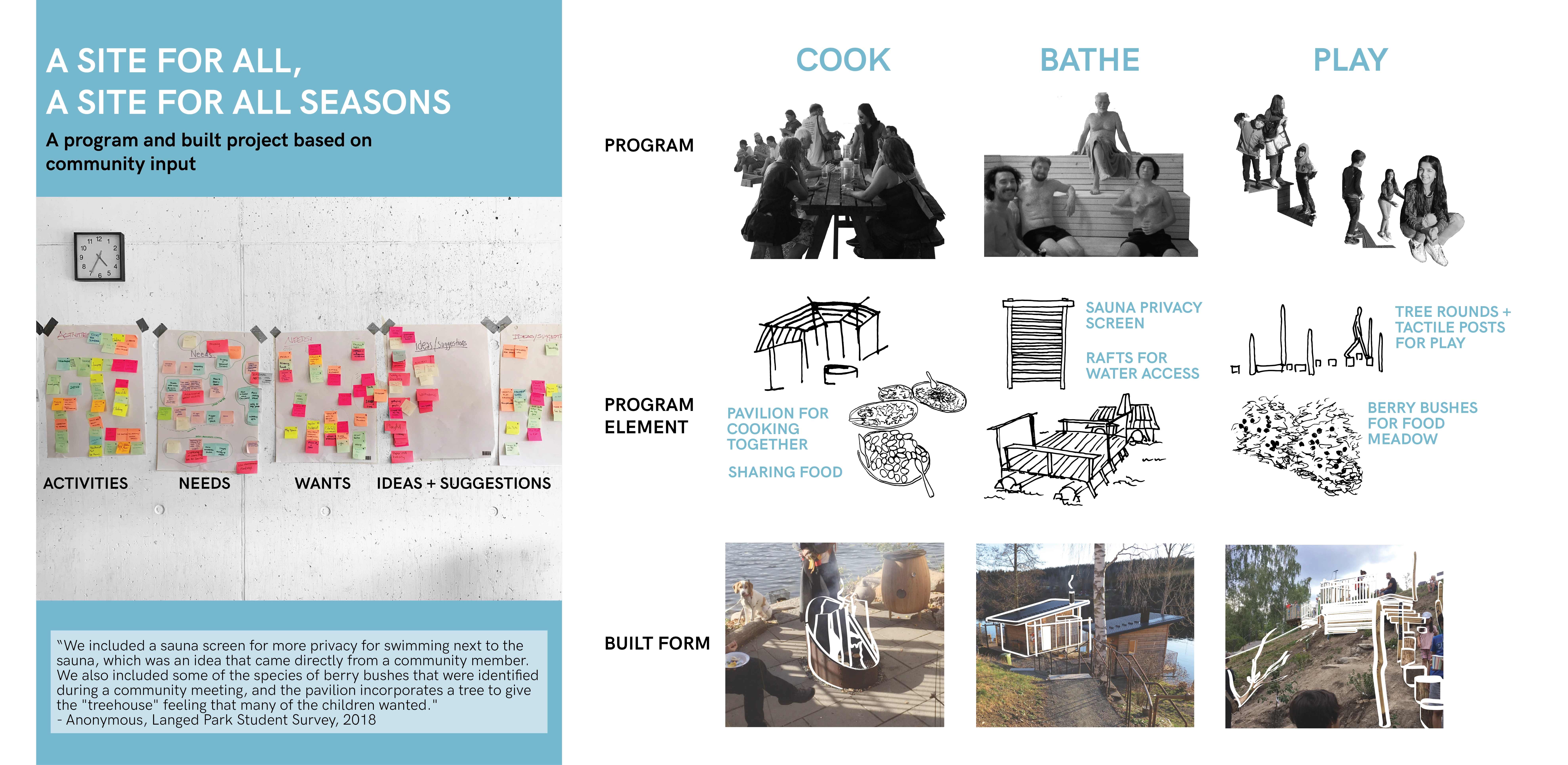 The two-year project included iterative design in tandem with community feedback sessions. In full, the project introduced play, gathering, contemplation, outdoor cooking, and a sauna to the waterfront. Following phase one, many Syrian residents found the park beautiful, but felt it was not for them. The children’s playscape was integrated into the second phase of the project because children can motivate cultural exchange. This demonstrates the importance of a phased design approach: it allowed for the community to shape the place as they began to use it. Långed Park is a working example of public space informed and produced by the people it serves.