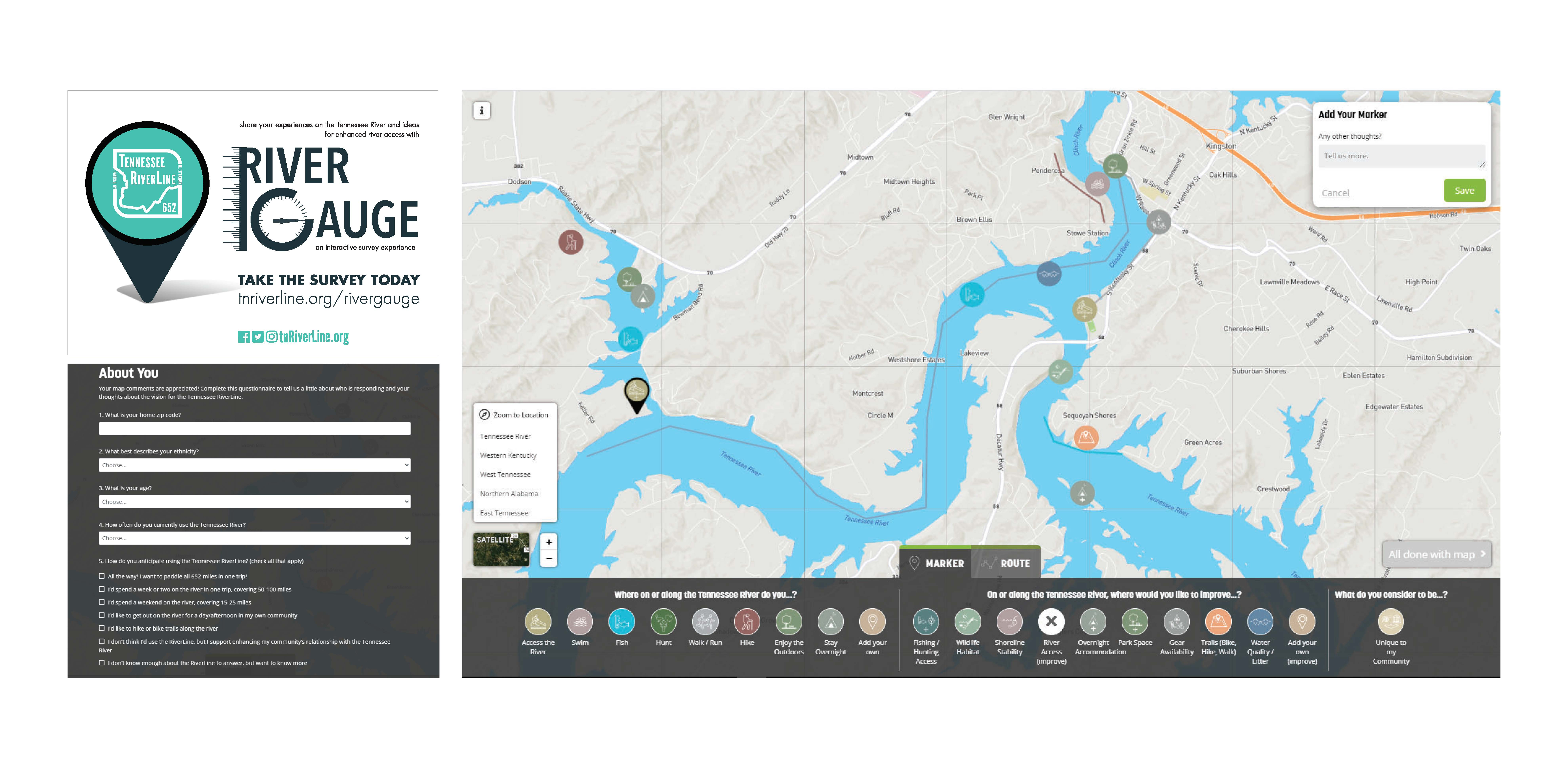 In collaboration with data analytics and programming specialists from the global design firm, Sasaki, the student team designed an innovative online survey to give Tennessee River community members unable to participate in 652 to YOU pilot community programming an opportunity to contribute their feedback and ideas for the Tennessee RiverLine vision. RiverGauge included a map-based tool that complemented the in-person Map It! activity and a survey to collect qualitative feedback and demographic information.