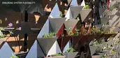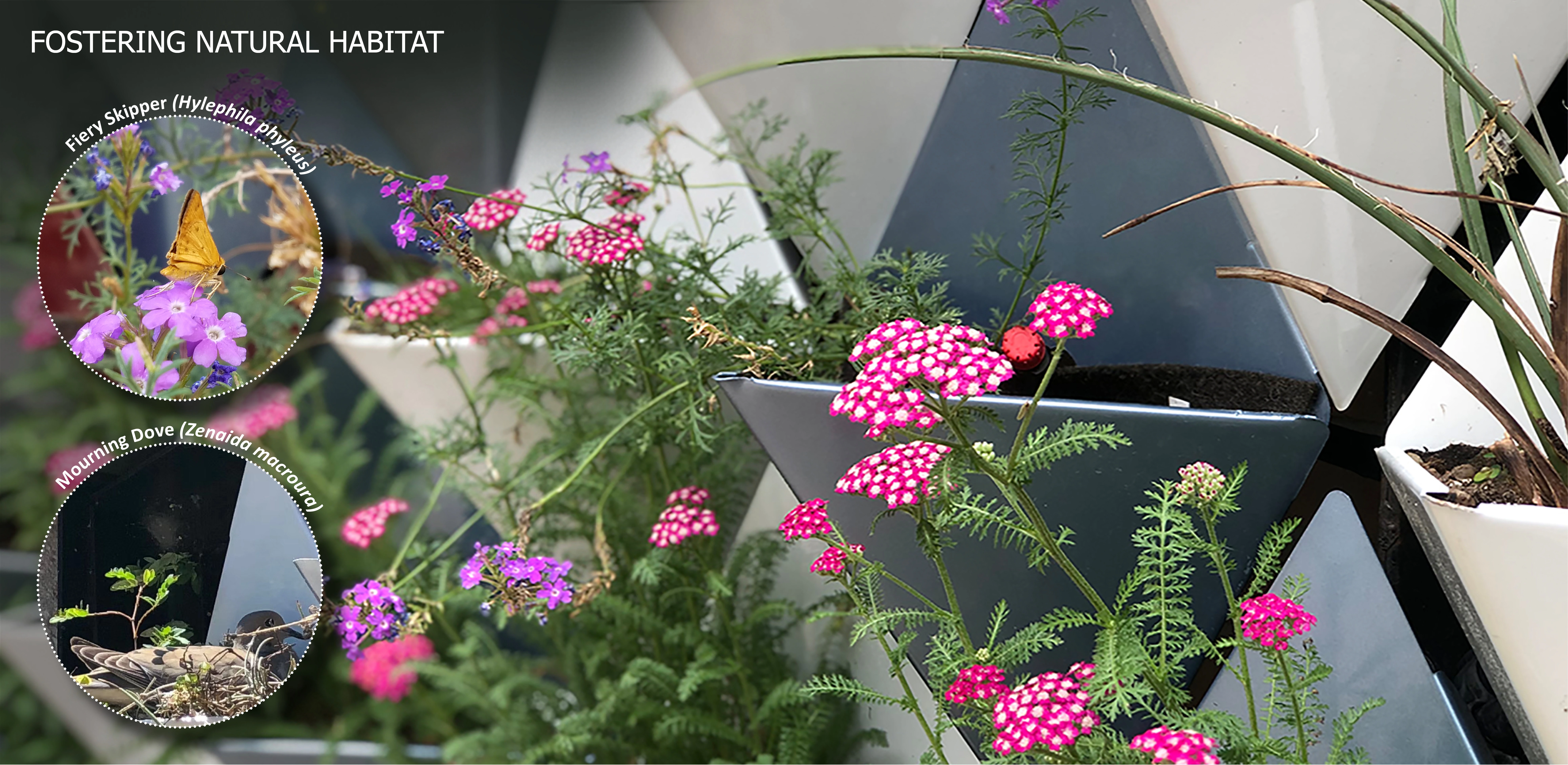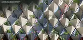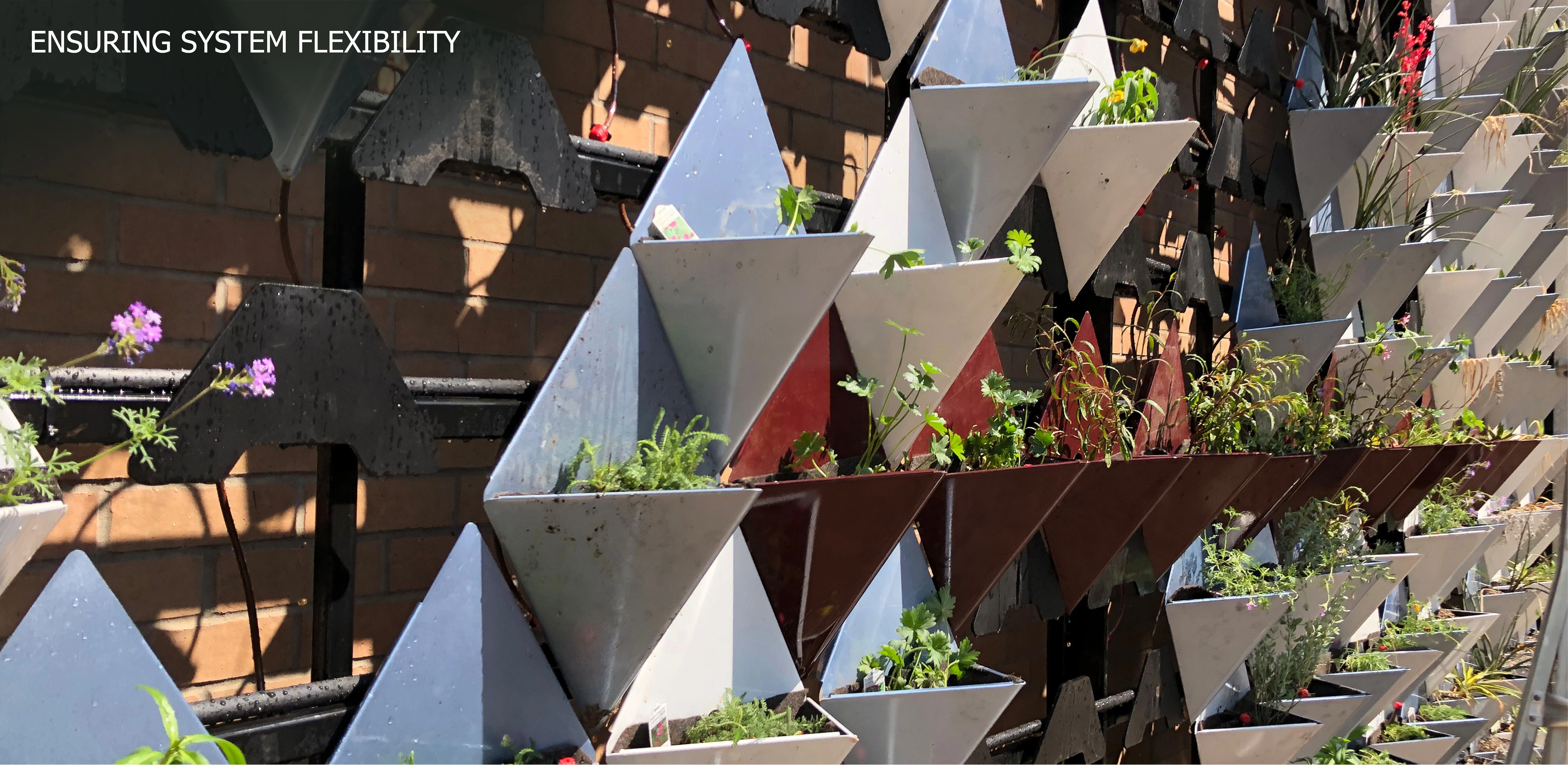 A multi-year, cross-disciplinary process led to the development of a galvanized steel living wall system, as well as the potential for a circular economy that transforms industrial waste into green infrastructure while enlivening a blank wall. Automotive sheet metal scraps become inverted pyramids that form a flexible façade garden; individually demountable units allow discrete control and modulation of watering, soil maintenance, and plant health. Extensive study of plant performance across eighteen species, paint performance as related to heat gain, and comparisons to existing wall systems resulted in a diverse micro-scaled ecosystem that welcomes pollinators to a new focal point.