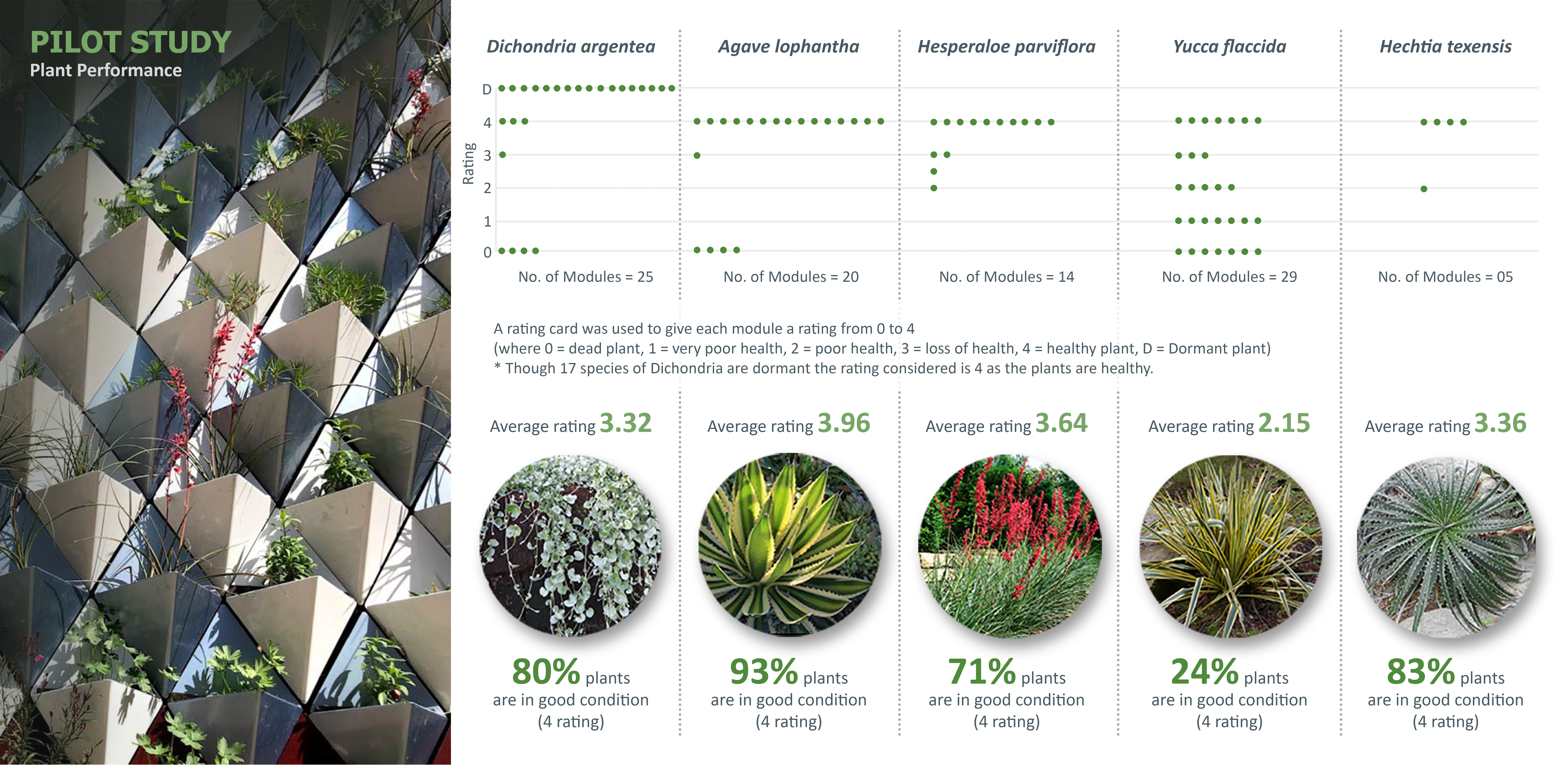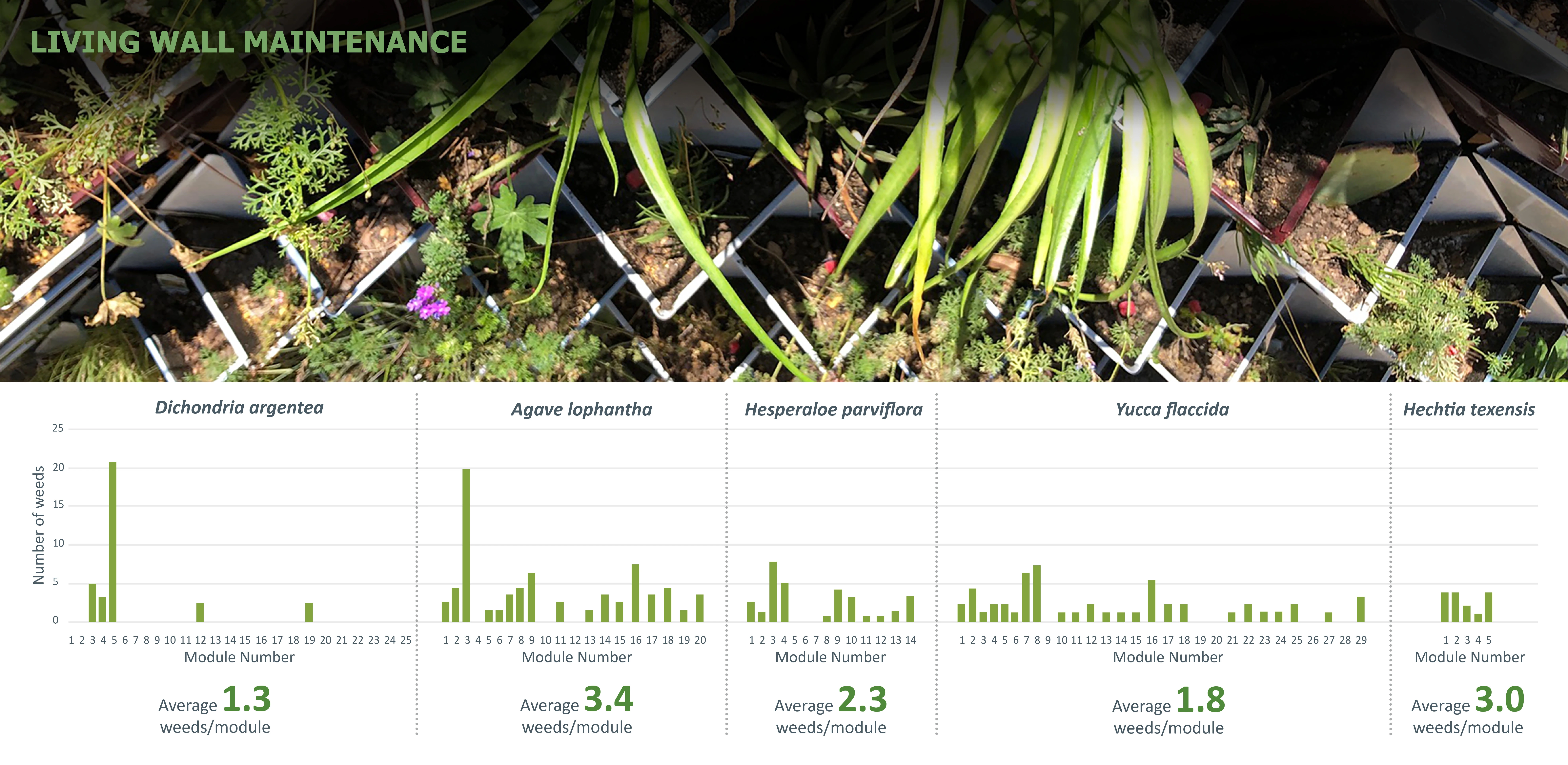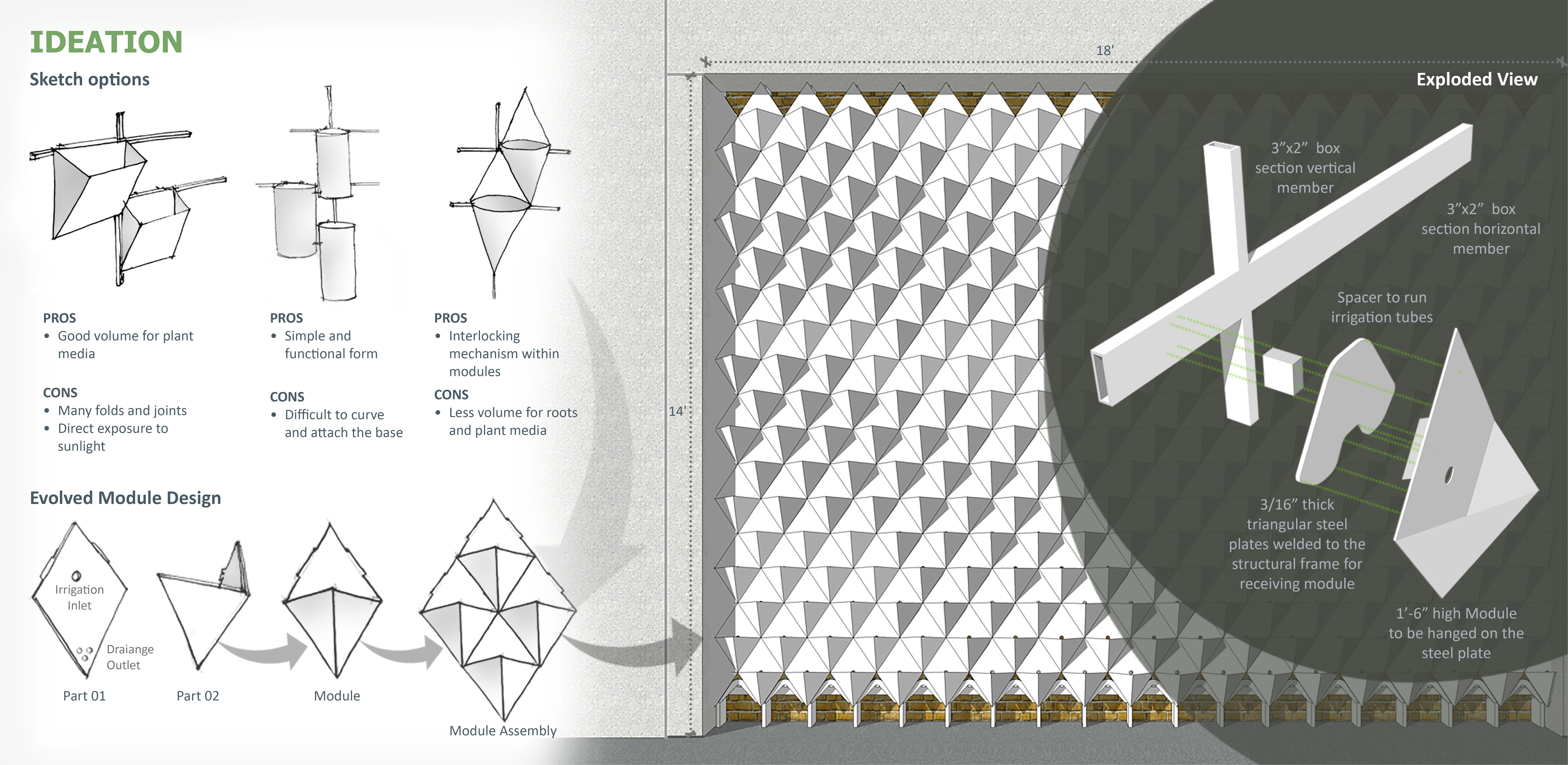 The design of the system evolved in order to create an optimal microclimate for plants with the help of drainage, irrigation delivery and plant positioning. The module shape and size were strategically designed to hold maximum soil volume. Each module has provisions for individual irrigation inlets and drainage. A steel structural support system was designed that holds the modules and supports the drip irrigation system behind the modules. The diagonal arrangement of modules gave an appropriate vertical space to grow for upright plants like Red Yucca. Living walls can play an important role to improve urban microclimates; however, they may face limitations especially in extreme hot and cold climates. The selection of plants is critical in the success of living walls. Studying the work of previous research on plants for living walls on campus, we experimented with primarily drought-tolerant, native and adaptive plants.