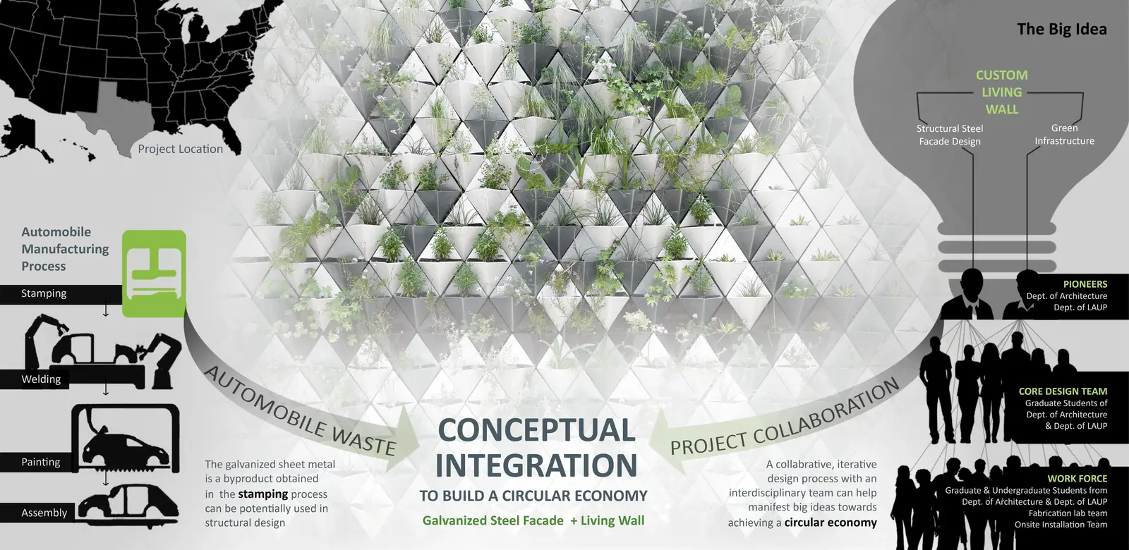 This design-build project is a result of successful collaboration between three main entities. Firstly, the automobile industry which supplied the materials free of cost, secondly, the core design team of professors and graduate students in landscape architecture and architecture programs, and thirdly, the workforce of graduate and undergraduate students and teams at the fabrication lab who contributed in bringing the design concepts to reality. This unique idea of a custom living wall system has great potential to demonstrate a circular economy for living walls. It is cost-effective and environmentally sensitive as it utilizes waste sheet metal. It can essentially create opportunities for research and design for the incoming students in the landscape architecture and architecture programs. They can get a hands-on experience in understanding how a living wall system works and the factors playing a key role in design of modules and structural systems. Their academic products can be marketed commercially to promote the integration of the living wall systems in infrastructural development and making this project and the processes involved cyclical. The custom living wall system has proved to be sustainable, reduces heat reflectivity to cool the microclimate, creates an aesthetic appeal, is easy to maintain, attracts pollinator insects and butterflies and functions well compared to few other living walls in Texas. -