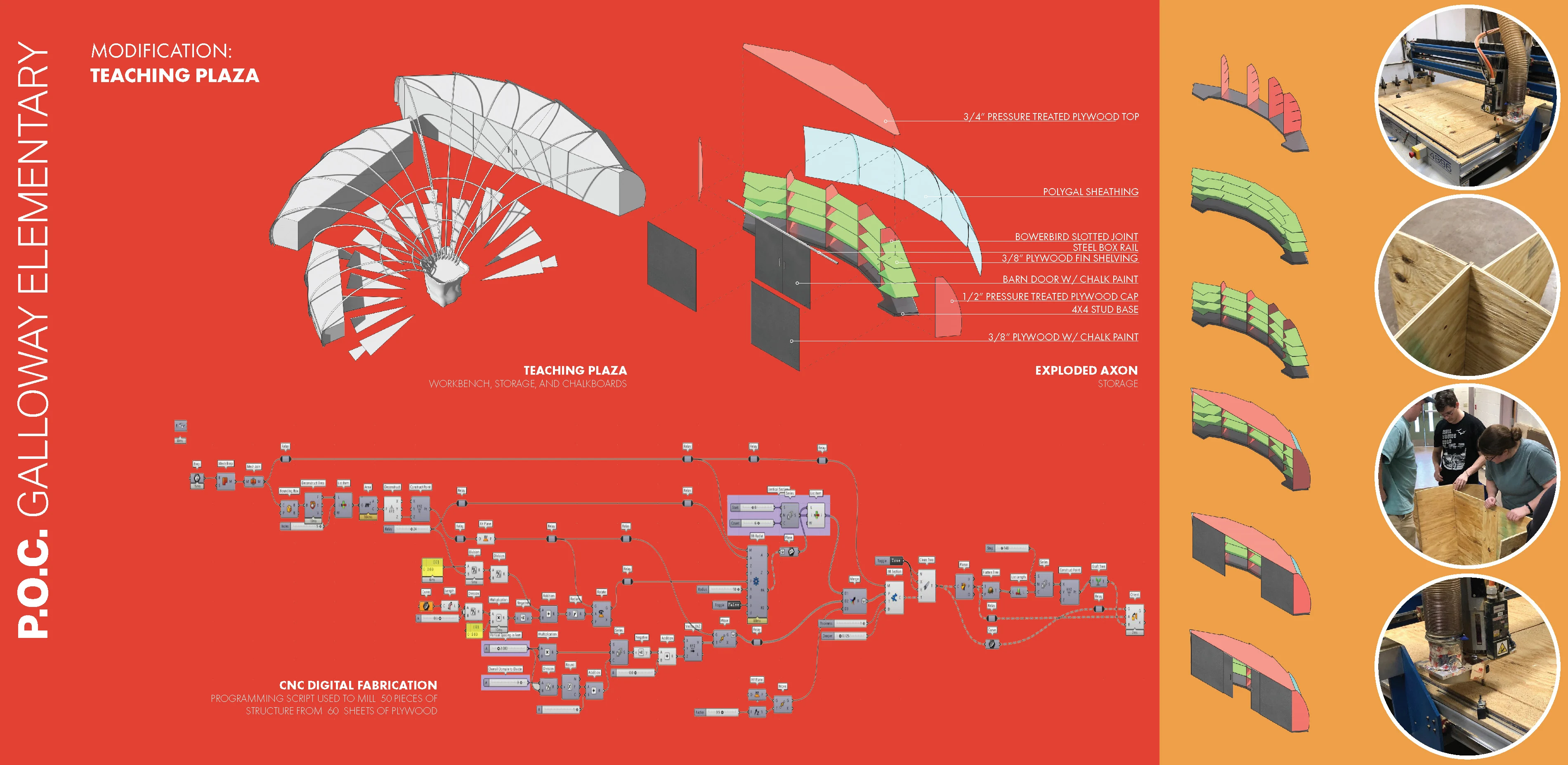 The K through 5th grade Galloway Elementary school is located in a USDA classified food desert, surrounded by fast-food chains. The existing school is extremely limited in funding and resources. With a $25,000 budget from an arts grant, the team started the process by engaging the 5th graders in a creative workshop on food nutrition to generate inspiration for the design. An abandoned asphalt playground adjacent to the gym provided the perfect platform for the garden. It was also an opportunity to explore how the typology could be improved to make it more dynamic in terms of design and experience, more flexible in terms of instruction and course delivery, and more interesting in terms of excitement and fun for the students. The garden was planned to be implemented at the end of the semester with volunteers but was delayed due to COVID 19 until the fall. However, all of the components have been fabricated by students and are awaiting installation.
