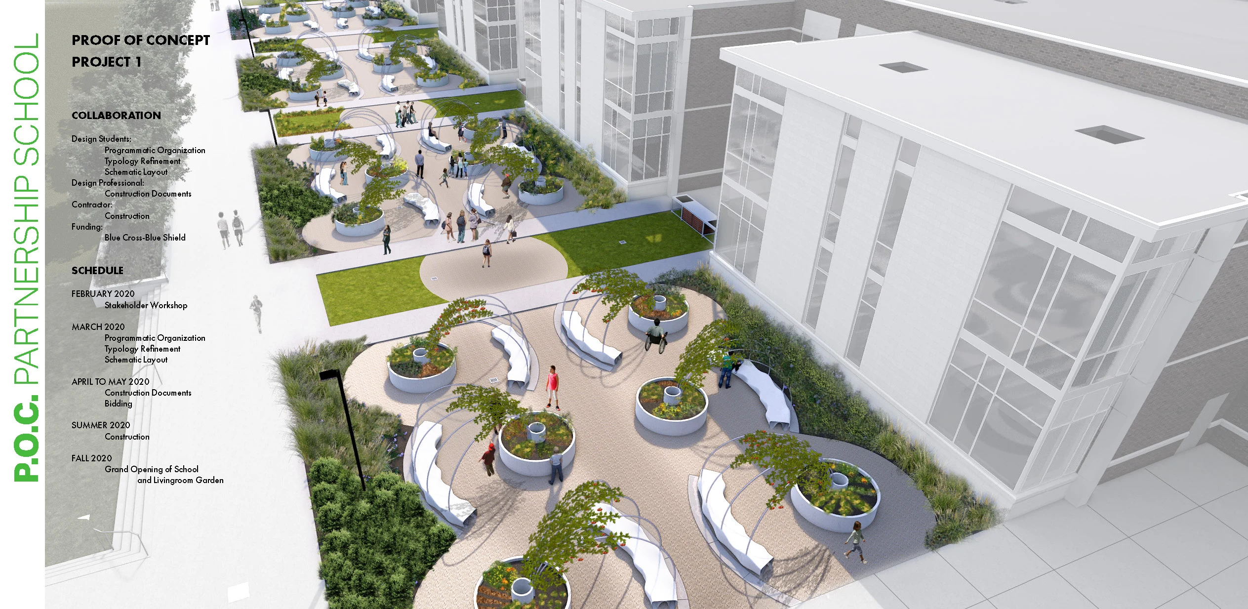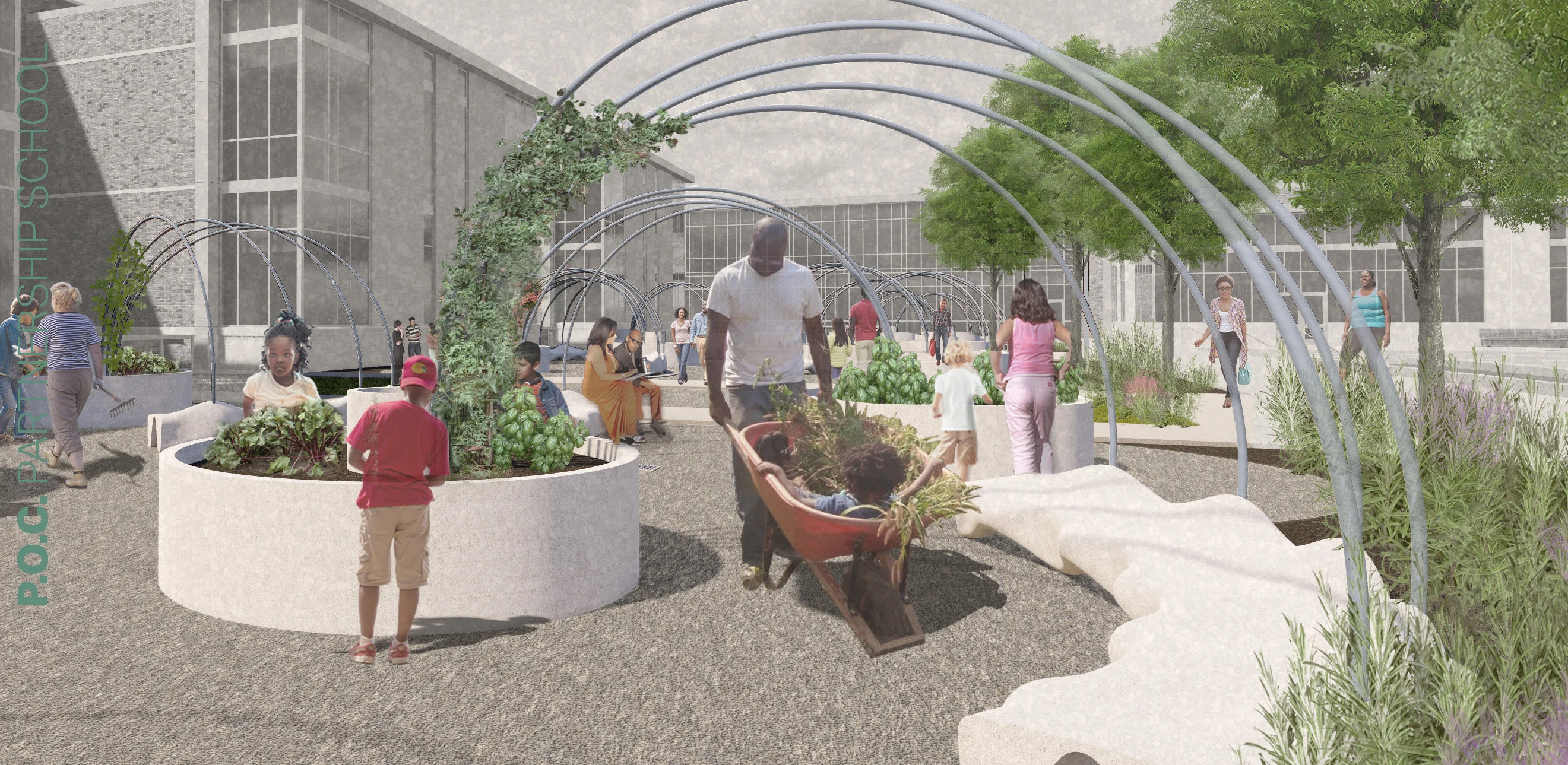 A prototype teaching garden combines low-cost materials with reduced maintenance needs in an easily implementable design. Drawing design inspiration from garden use objectives, the prototype led to two proof-of-concept sites, with feedback from these sites informing refinements to the final product. The studio deployed 3D-printed concrete for infrastructural components of the garden, such as storage space and planters with attached benches, and used graphic treatments to demarcate specific garden zones. Shifting to online instruction in the face of COVID-19, the studio renewed focus on developing documentation for the prototype to allow broad, web-based dissemination.
